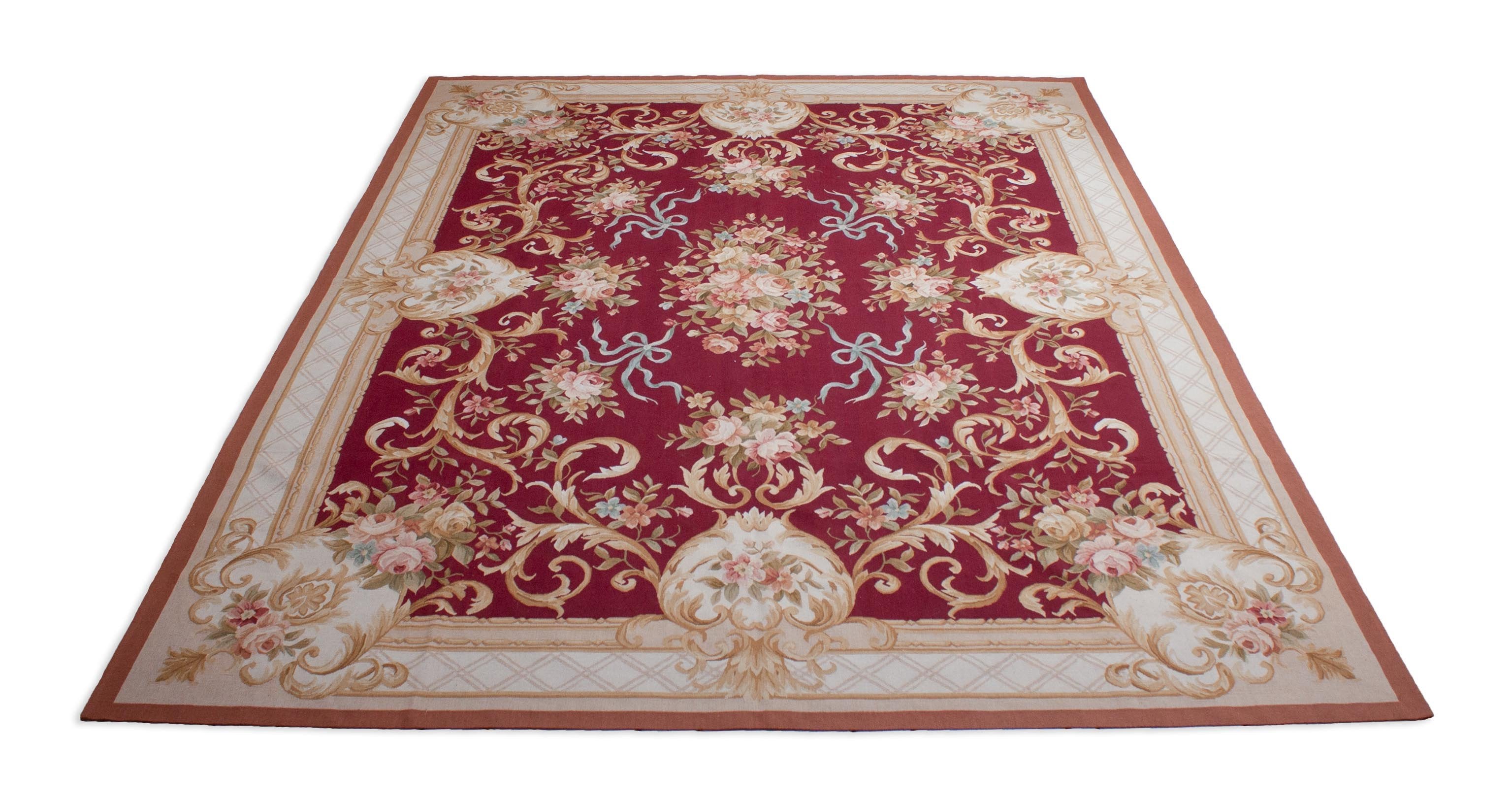 L'arrière-plan de cette Aubusson est rouge foncé. Le bord est conçu dans les couleurs jaune beige et brun clair. Dans le centre vert olive, les couleurs beige et rouge clair sont combinées.