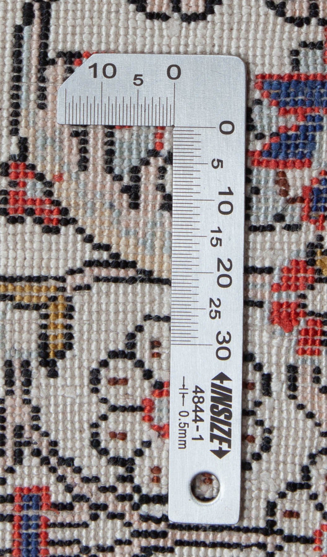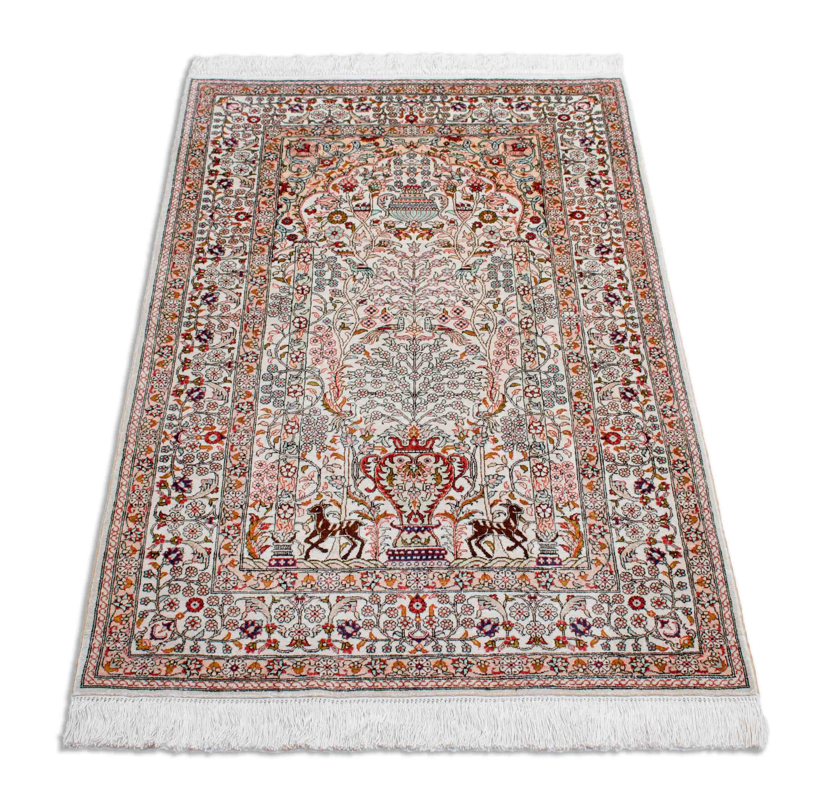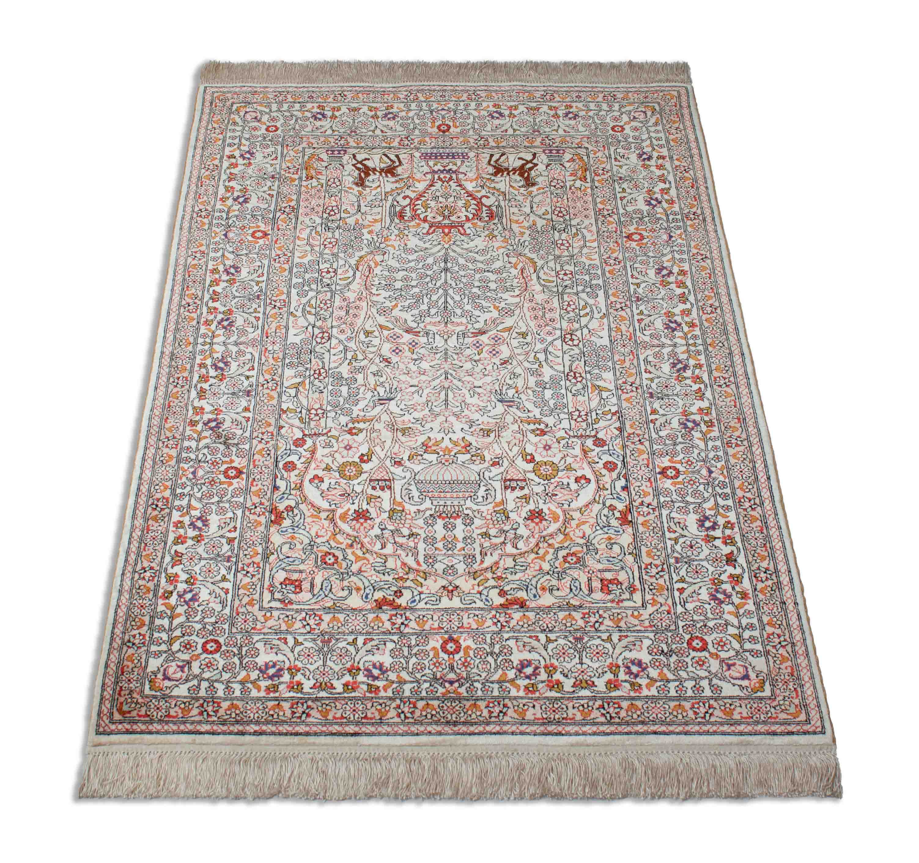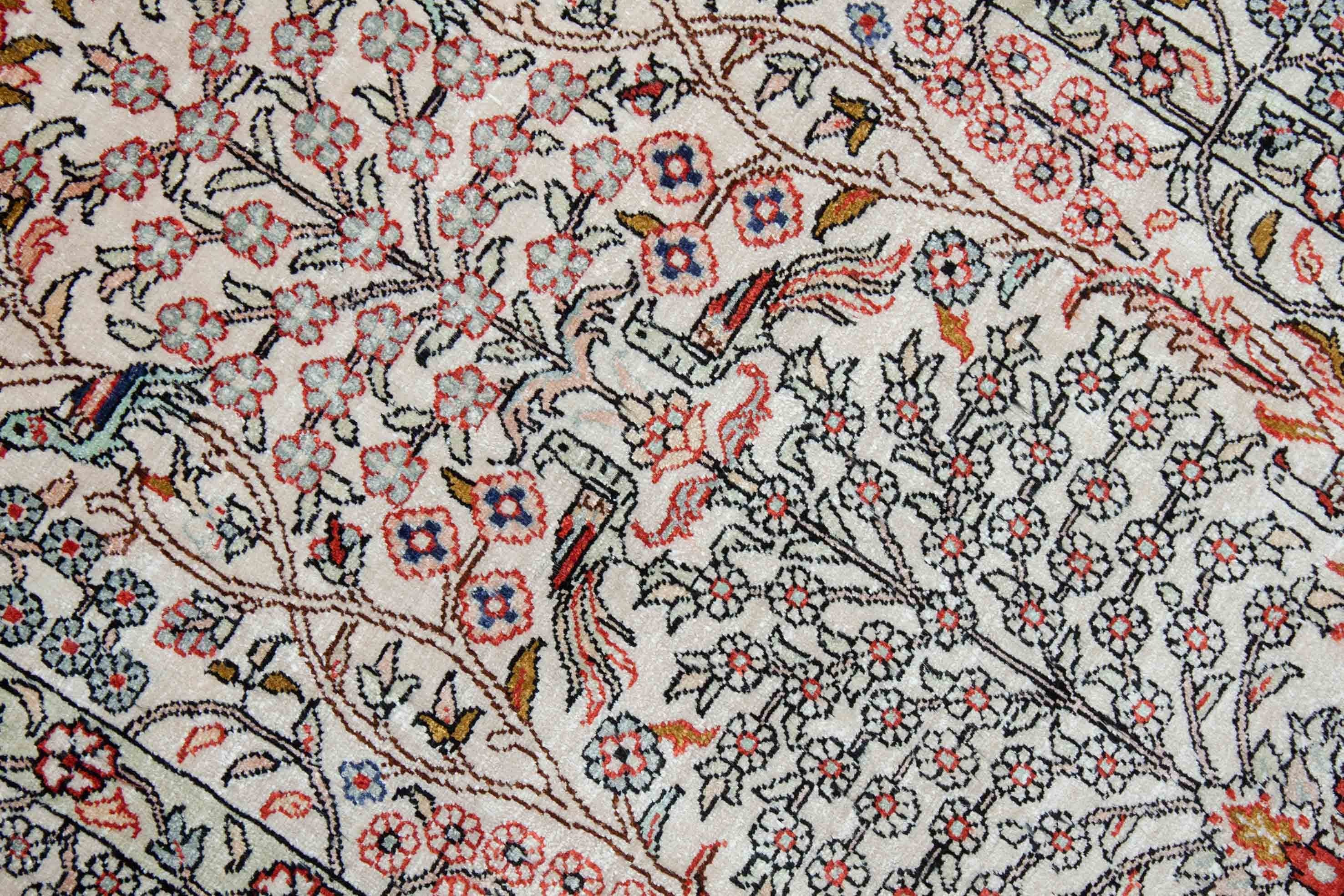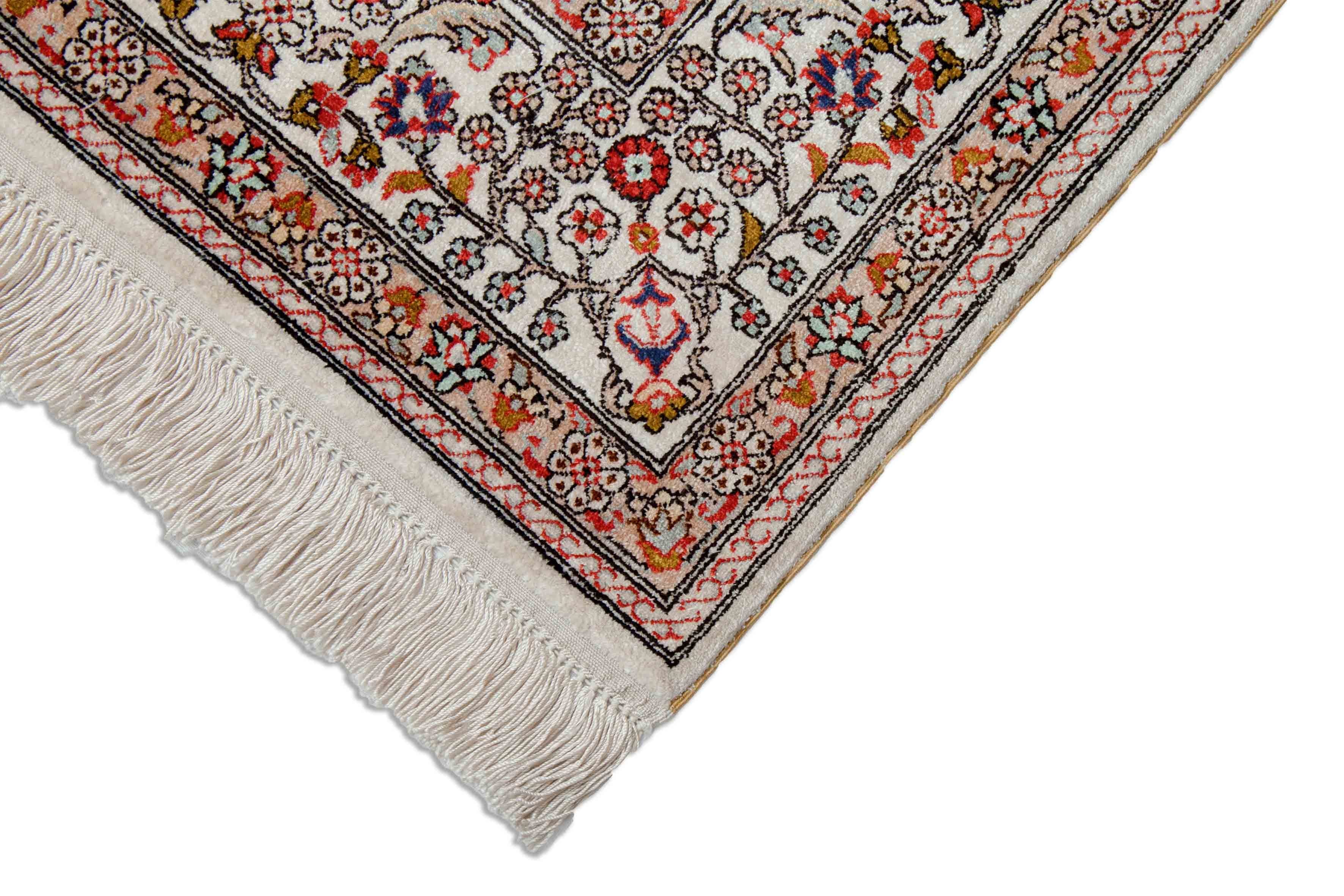 The Silk la Flore de ce Hereke laisse briller les couleurs du motif dans différentes nuances, selon la lumière. Il en fait un véritable bijou et crée une atmosphère confortable et en même temps très élégante et de haute qualité dans la pièce. La soie est obtenue à la main des cocons de l'araignée de soie. Comme les fils de soie individuels sont extrêmement longs, des fils très fins peuvent être produits qui sont néanmoins résistants à la déchirure avec un faible poids. Des nœuds de tapis plus petits peuvent être fabriqués avec le fil mince et ainsi des motifs plus fin peuvent être produits. Par conséquent, les plus beaux tapis du monde sont faits à la main de la pure soie. Dans ce Hereke même le souterrain était pure soie fait. En raison du matériau mince mais durable des fils de trame et de chaîne, un bouton particulièrement fin et donc un motif particulièrement fin est possible.
