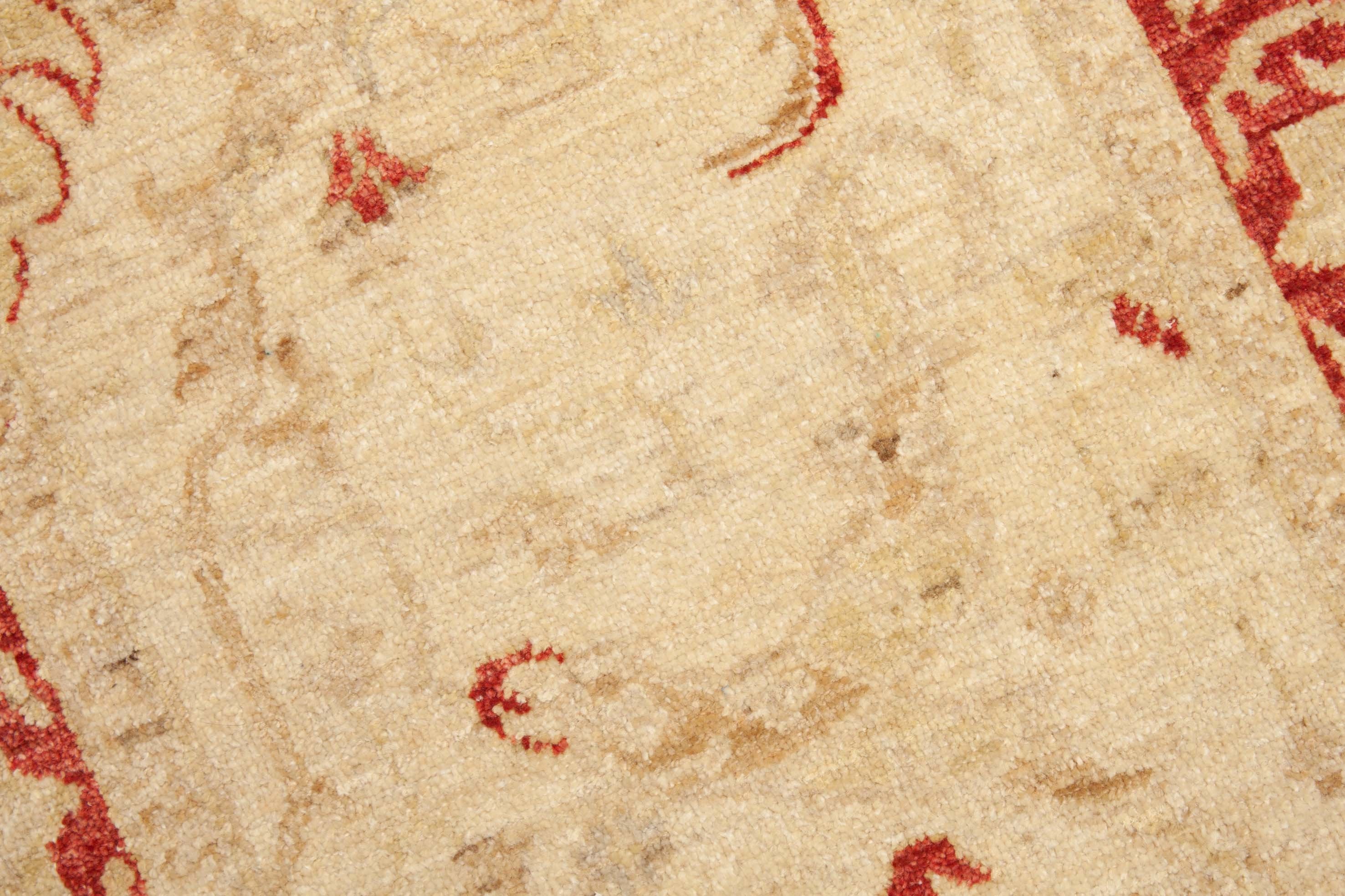 Le fond de ce Farahans est doré beige. Au total les impressions dominent également les couleurs jaune beige et rouge foncé. Le bord est conçu dans les couleurs rouge foncé et jaune beige.