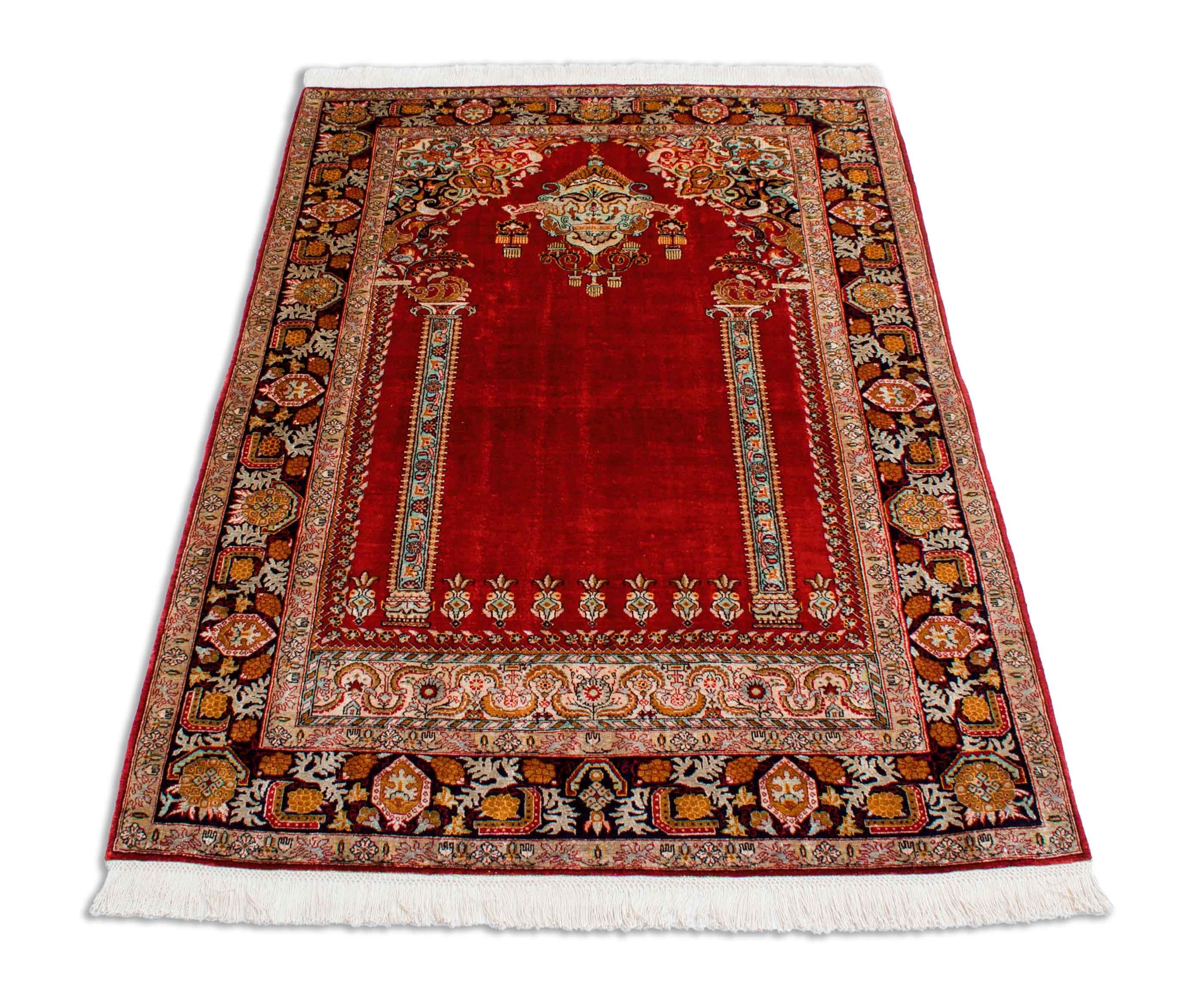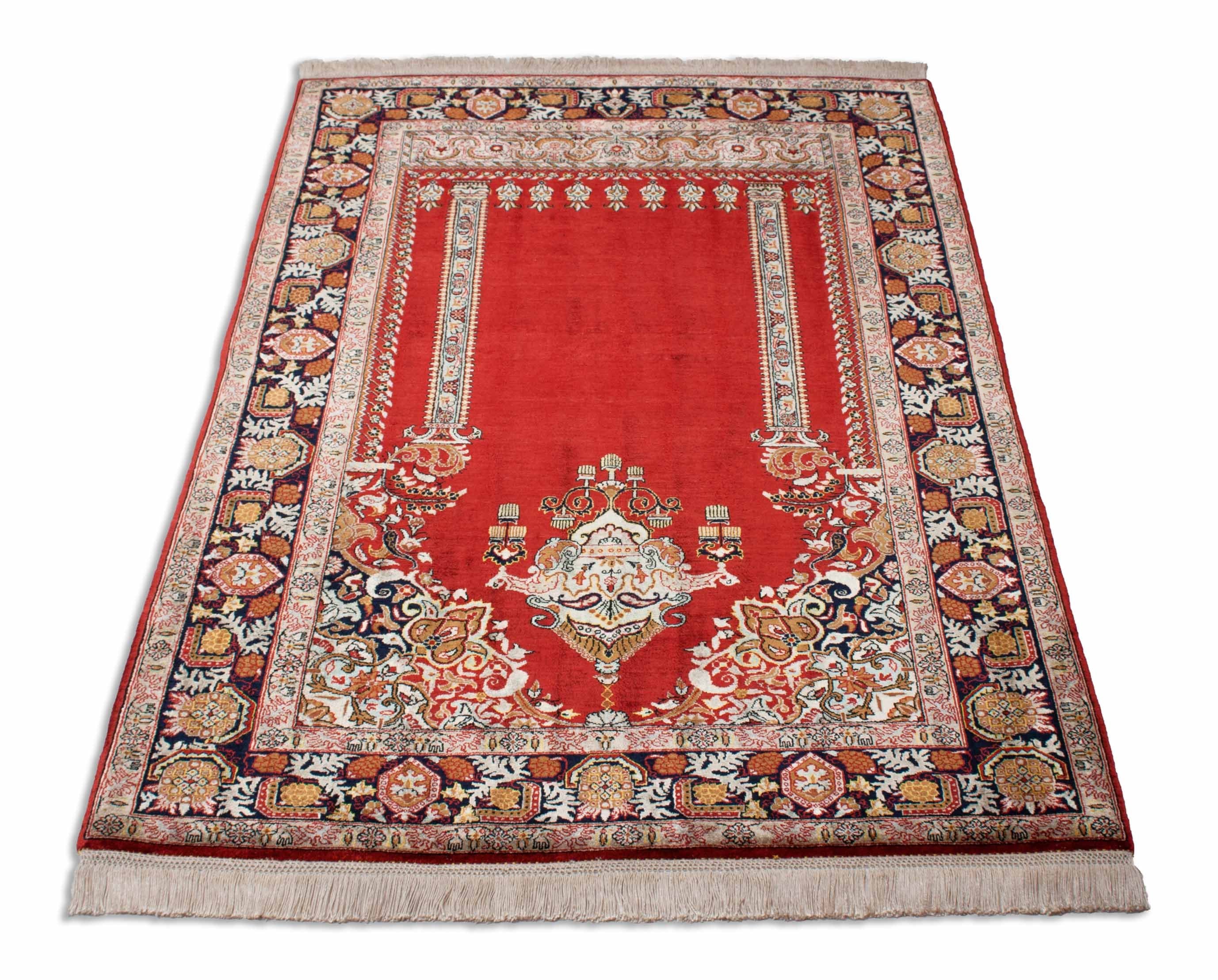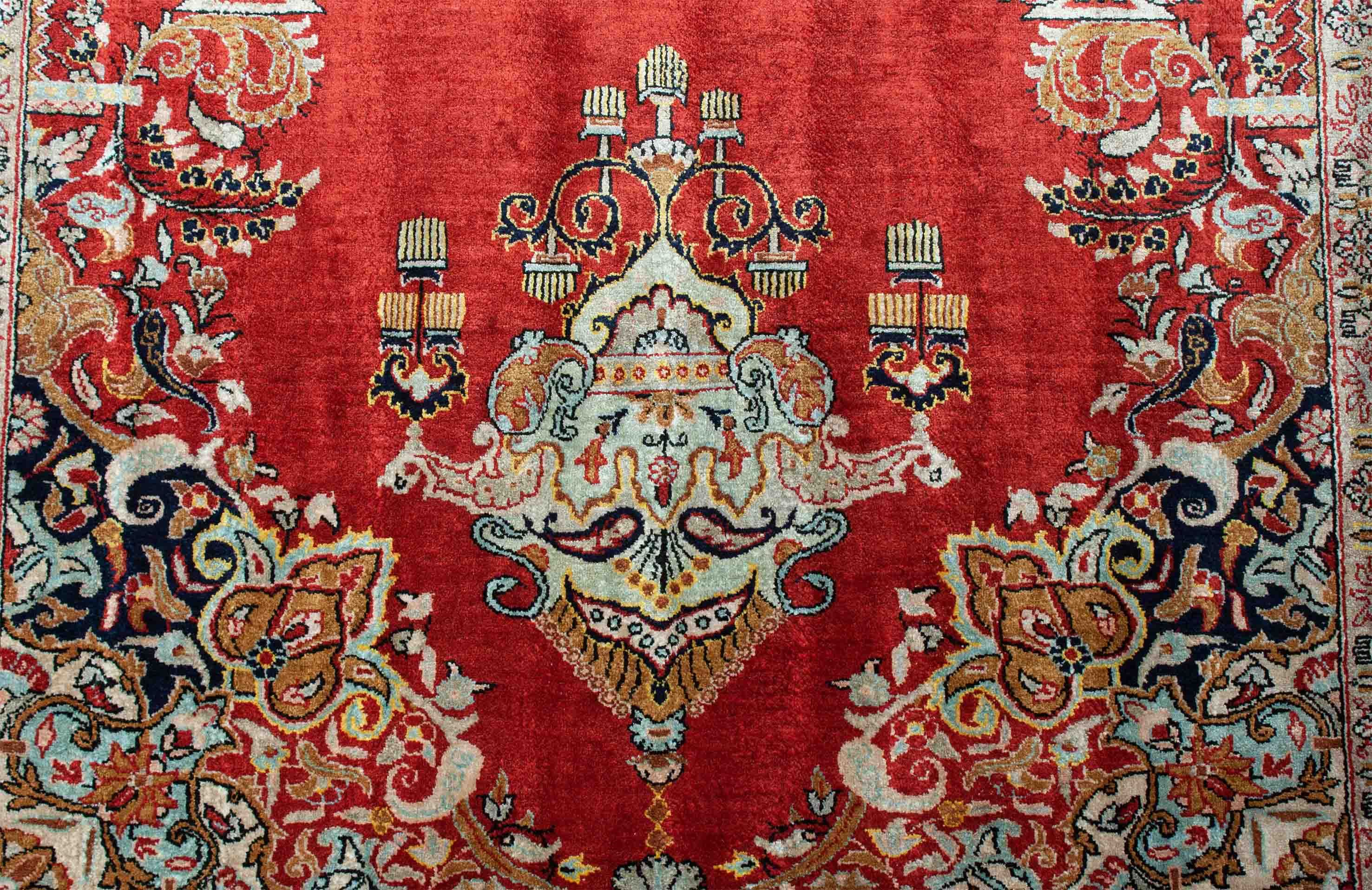 ghom est une provenance relativement jeune pour Perserteppiche. La ville ghom (aussi Gom, Ghoum, Goum) est situé dans le centre de l'Iran, à environ 100 km au sud de la capitale Téhéran. ♪ ghom – en ce qui concerne le tapis – il n'était pas possible de s'appuyer sur une vieille tradition, et les modèles ont été repris d'autres zones de nœuds. Dans le temps, cependant, il a développé son propre style. Les tapis de soie de Ghom sont maintenant l'un des tapis les plus célèbres et de haute qualité au monde. Le champ des tapis en Ghom est souvent décoré avec des motifs de médaillon ou de pénétrage ou de vases.