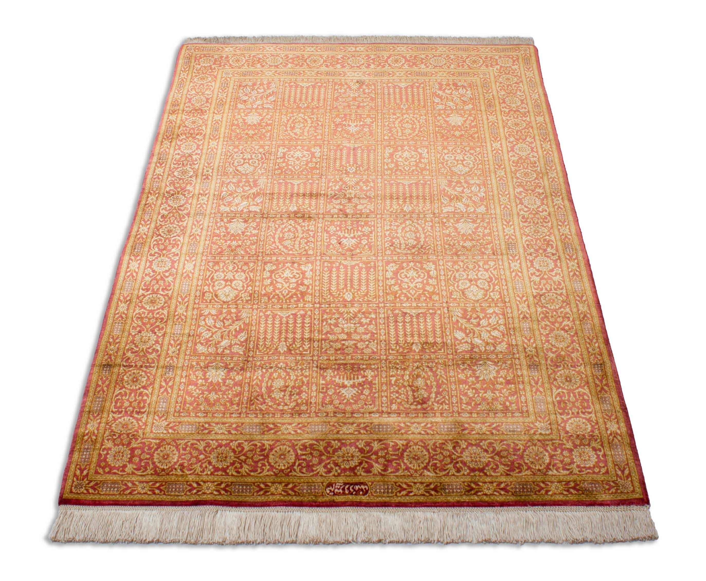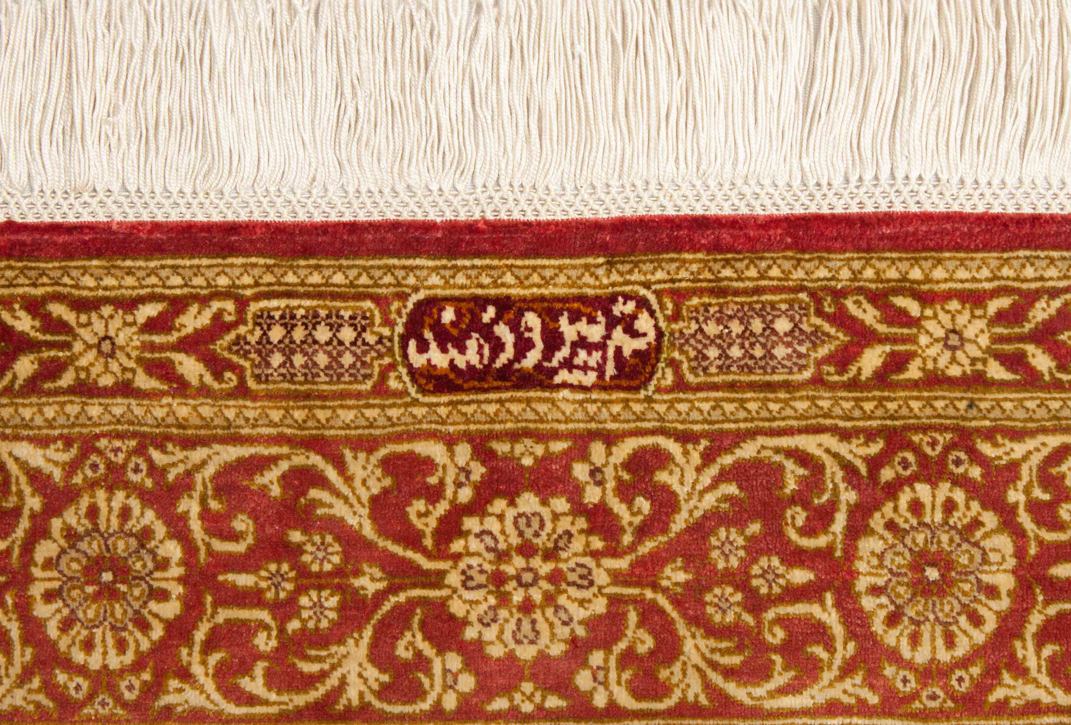 ghom est une provenance relativement jeune pour Perserteppiche. La ville ghom (aussi Gom, Ghoum, Goum) est situé dans le centre de l'Iran, à environ 100 km au sud de la capitale Téhéran. ♪ ghom – en ce qui concerne le tapis – il n'était pas possible de s'appuyer sur une vieille tradition, et les modèles ont été repris d'autres zones de nœuds. Dans le temps, cependant, il a développé son propre style. Les tapis de soie de Ghom sont maintenant l'un des tapis les plus célèbres et de haute qualité au monde. Le champ des tapis en Ghom est souvent décoré avec des motifs de médaillon ou de pénétrage ou de vases. Ce morceau de vrai knüpfkunst, porte à juste titre l'orgueil et le nom du knüpfer, sous la forme d'une signature qui se traduit comme suit: "Ghom Piruzmand"