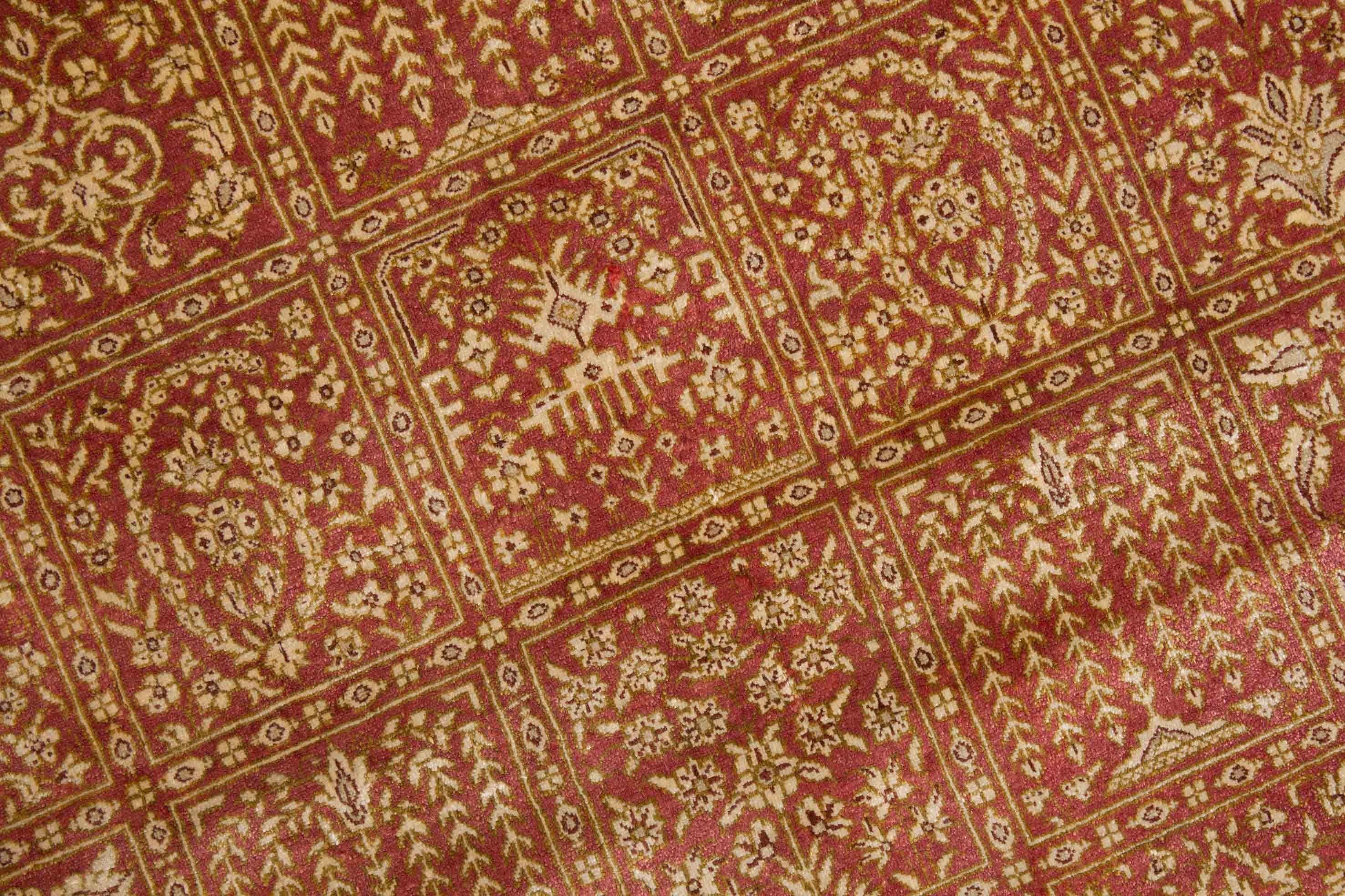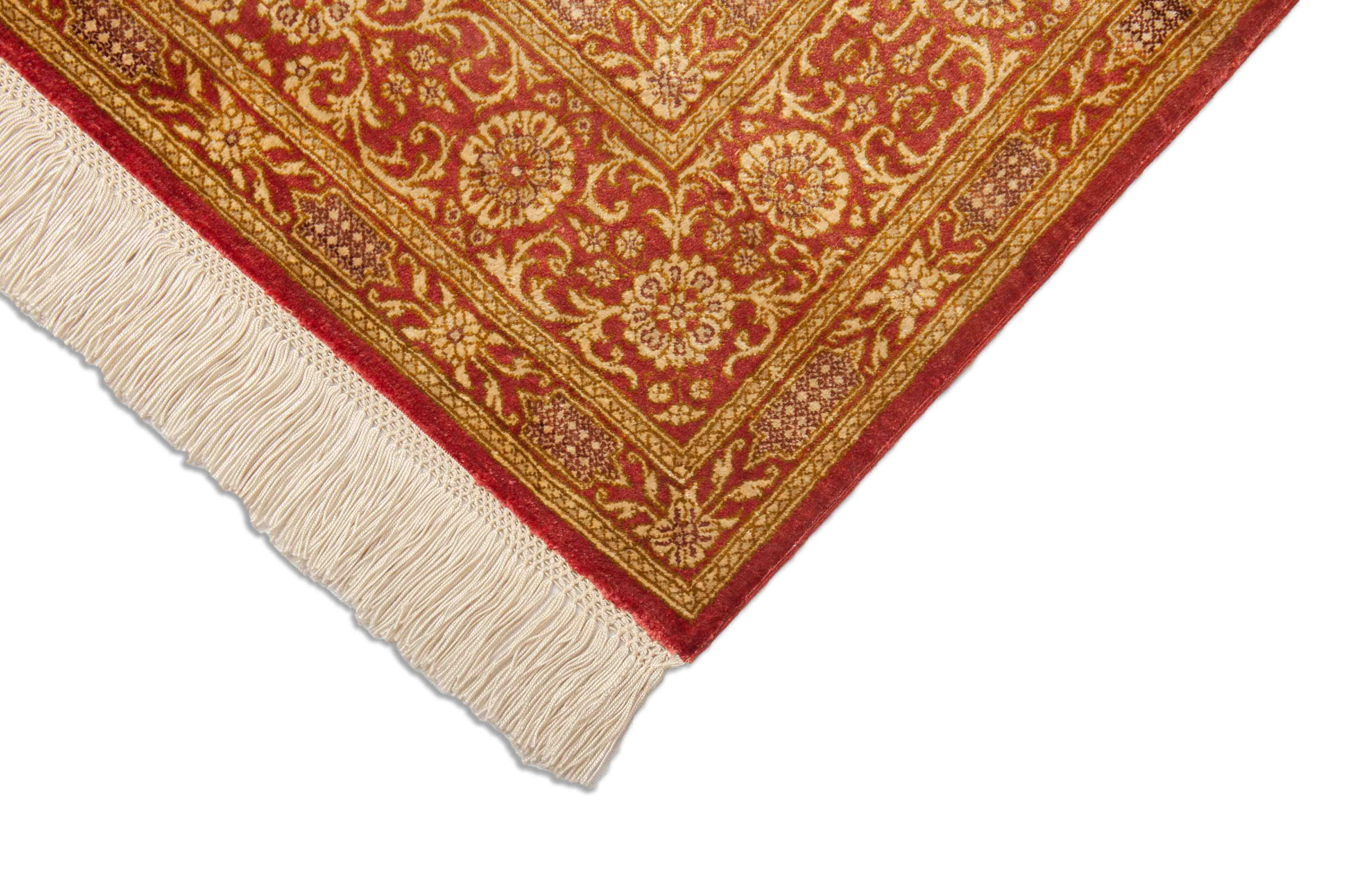 The Silk de ce ghom fait briller les couleurs du motif dans différentes facettes, selon l'incidence de la lumière. Il fait de ce joyau un véritable bijou et crée une atmosphère confortable et en même temps très élégante et de haute qualité dans la pièce. La soie est obtenue à la main des cocons de l'araignée de soie. Comme les fils de soie individuels sont extrêmement longs, des fils très fins peuvent être produits qui sont néanmoins résistants à la déchirure avec un faible poids. Des nœuds de tapis plus petits peuvent être fabriqués avec le fil mince et ainsi des motifs plus fin peuvent être produits. Par conséquent, les plus beaux tapis du monde sont faits à la main de la pure soie. Dans ce fossé, même le métro était pure soie fait. En raison du matériau mince mais durable des fils de trame et de chaîne, un bouton particulièrement fin et donc un motif particulièrement fin est possible.