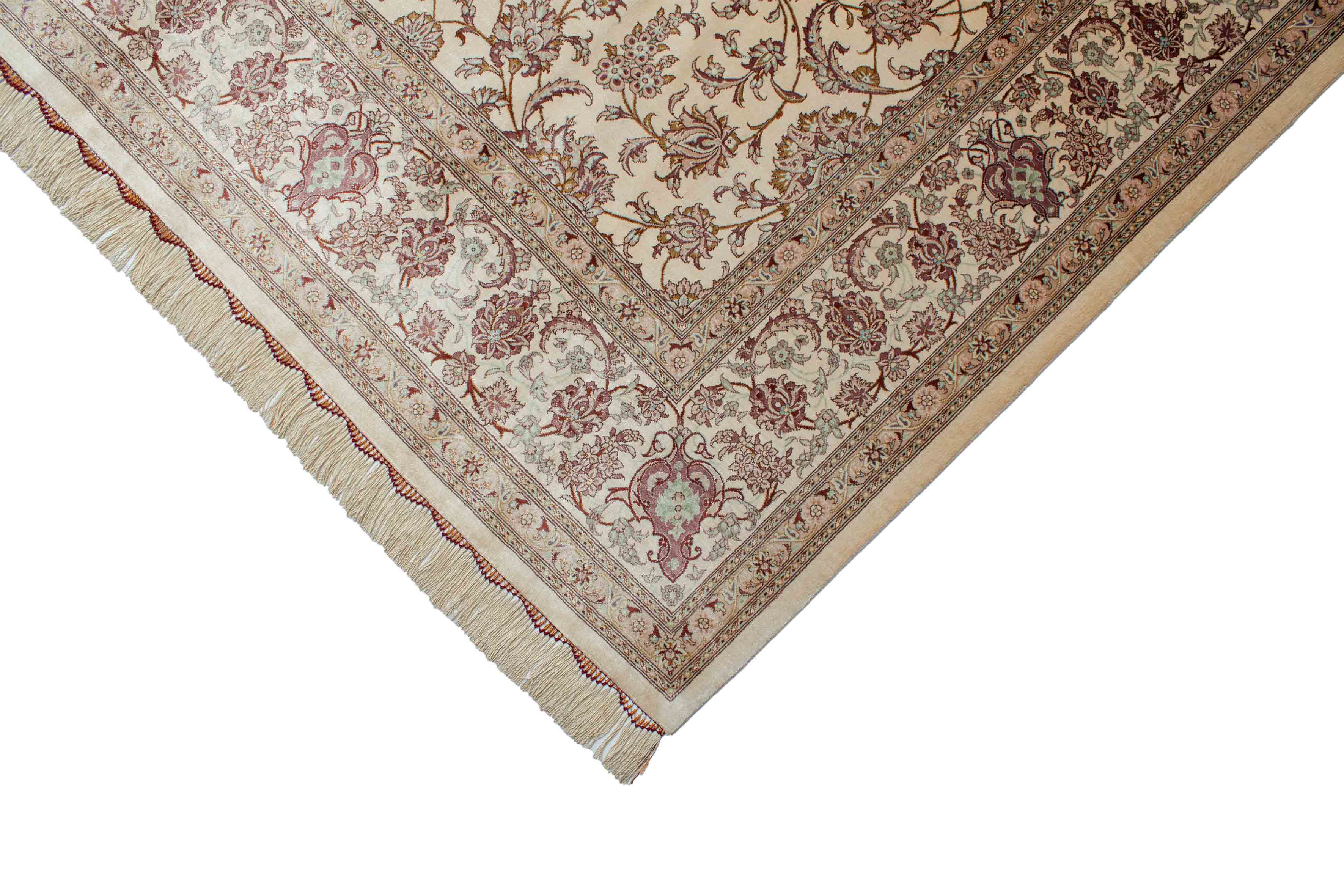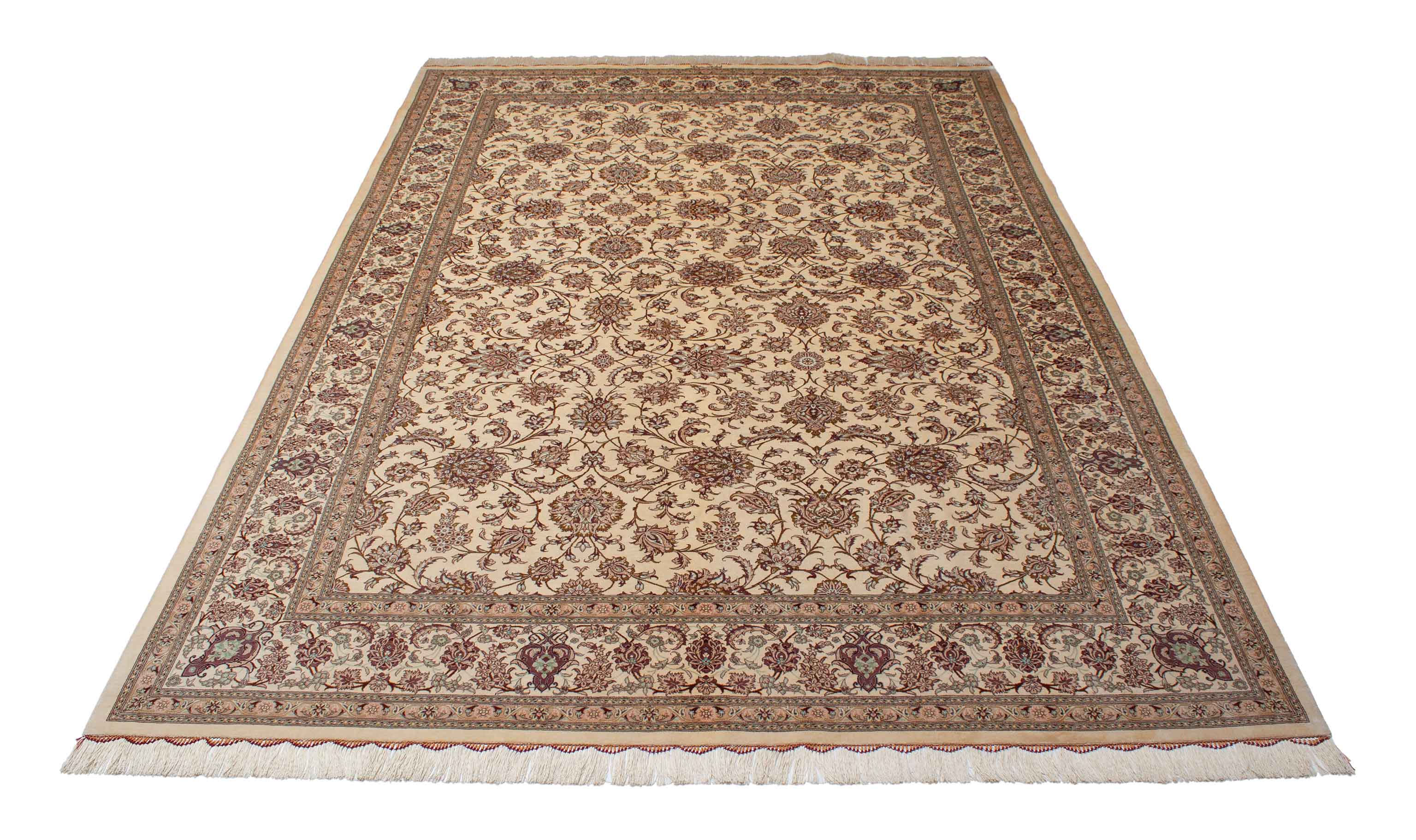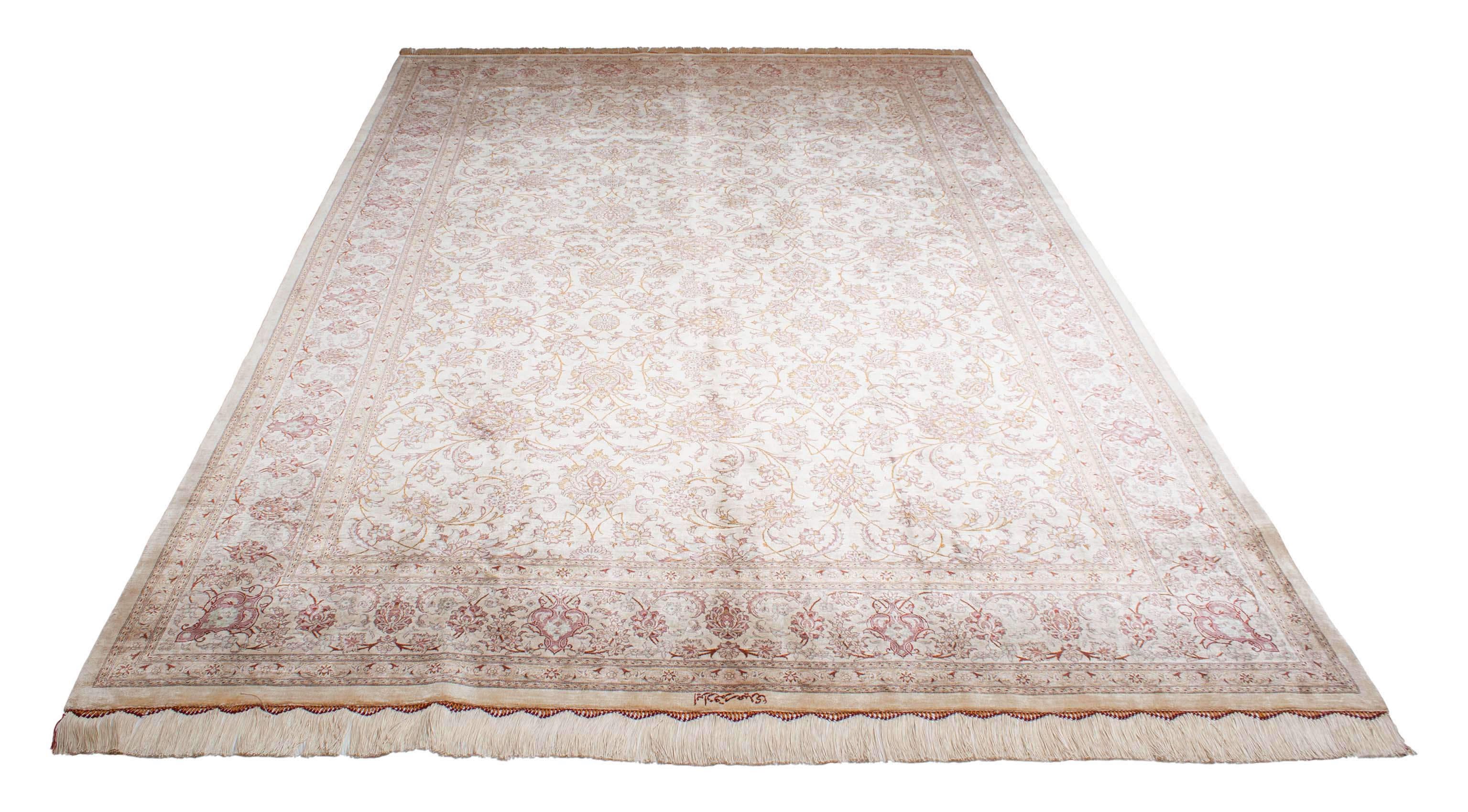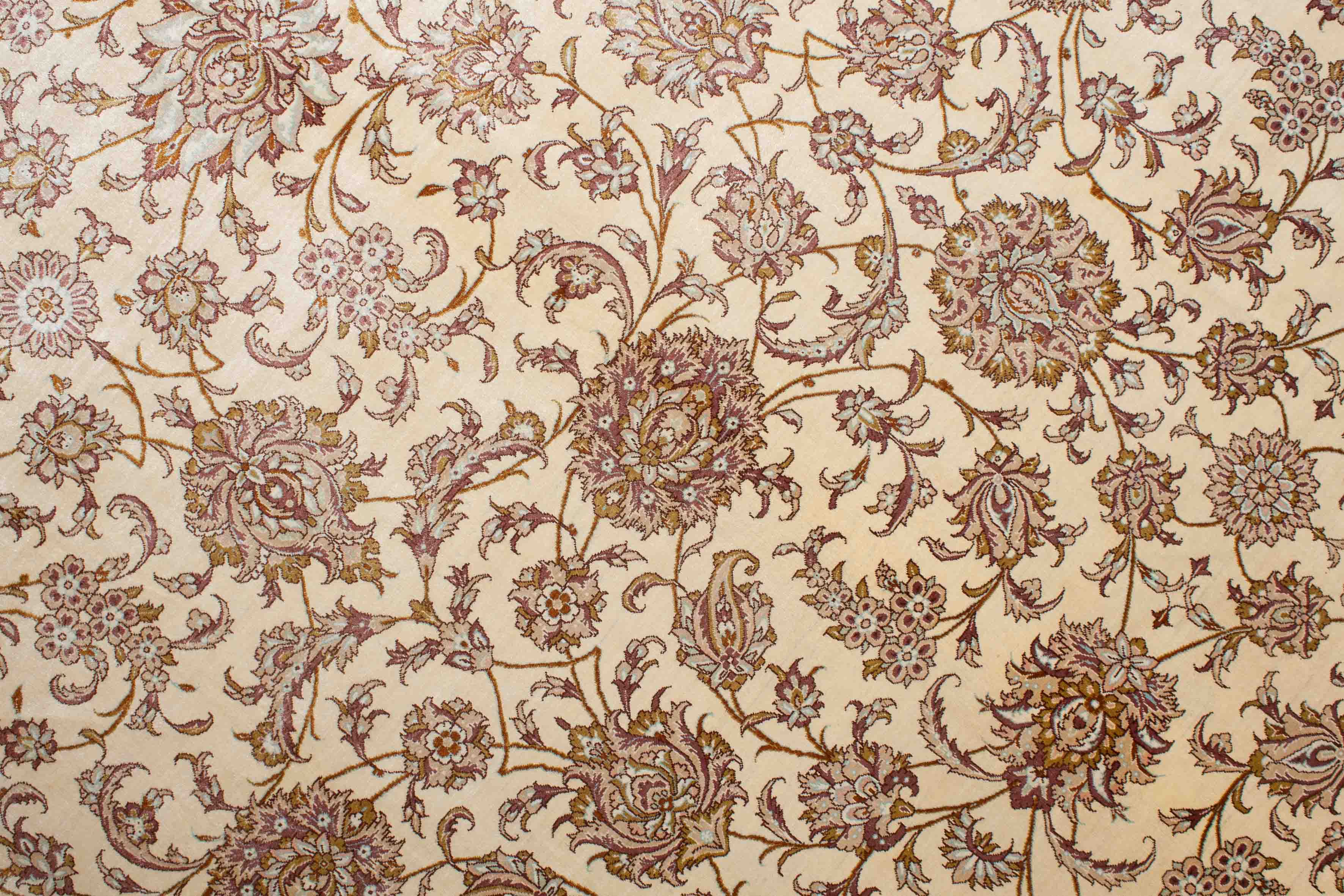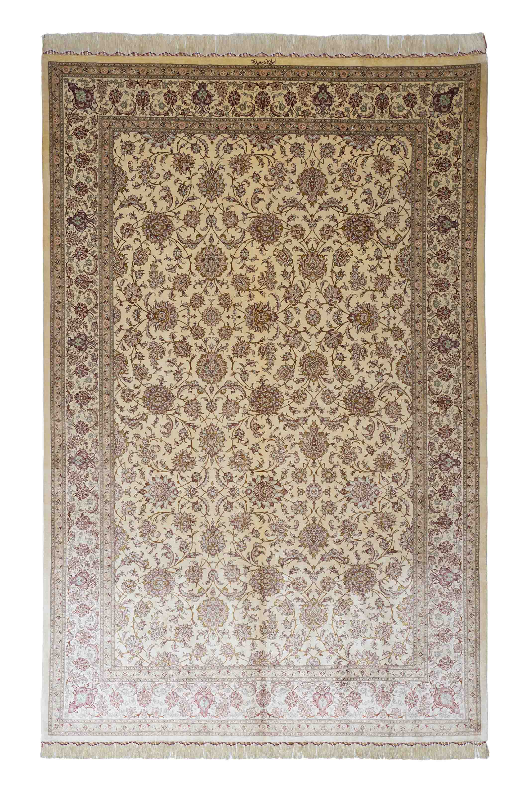 Floraler Ghom en soie pure, beige avec bordure et signature
