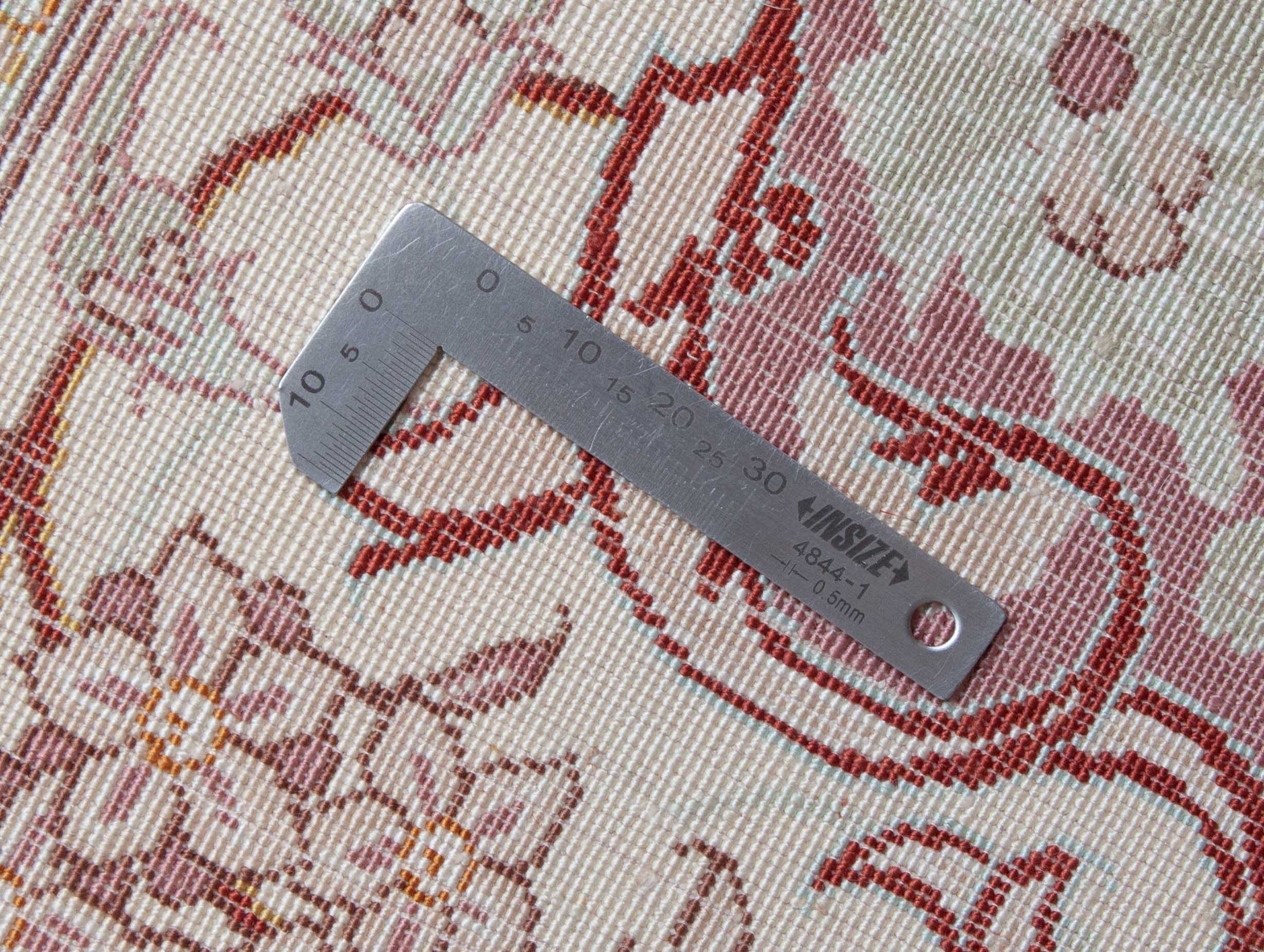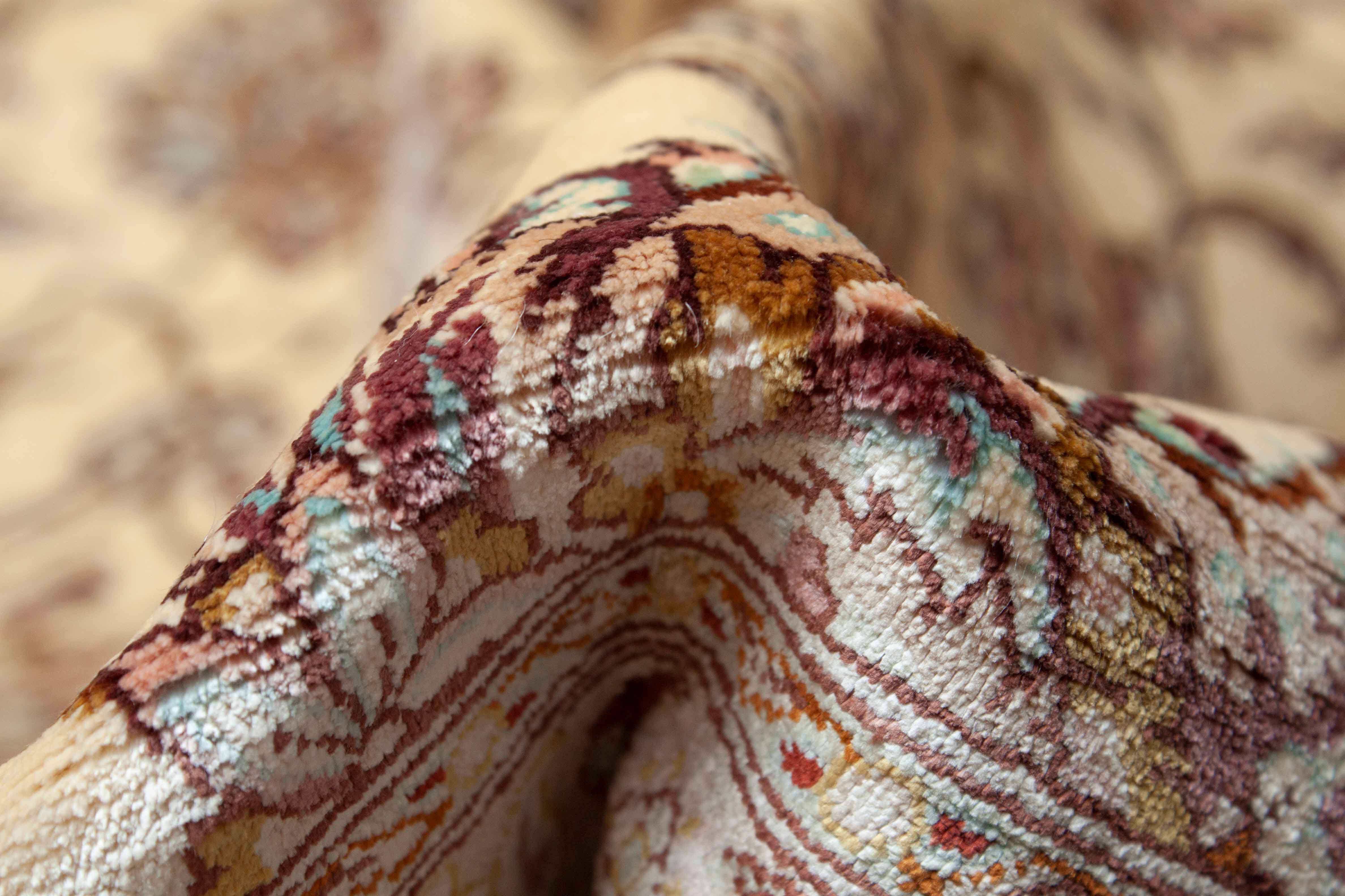 The Silk de ce ghom fait briller les couleurs du motif dans différentes nuances, selon l'incidence de la lumière. Il fait de ce joyau un véritable bijou et crée une atmosphère confortable et en même temps très élégante et de haute qualité dans la pièce. La soie est obtenue à la main des cocons de l'araignée de soie. Comme les fils de soie individuels sont extrêmement longs, des fils très fins peuvent être produits qui sont néanmoins résistants à la déchirure avec un faible poids. Des nœuds de tapis plus petits peuvent être fabriqués avec le fil mince et ainsi des motifs plus fin peuvent être produits. Par conséquent, les plus beaux tapis du monde sont faits à la main de la pure soie. Dans ce fossé, même le métro était pure soie fait. En raison du matériau mince mais durable des fils de trame et de chaîne, un bouton particulièrement fin et donc un motif particulièrement fin est possible.
