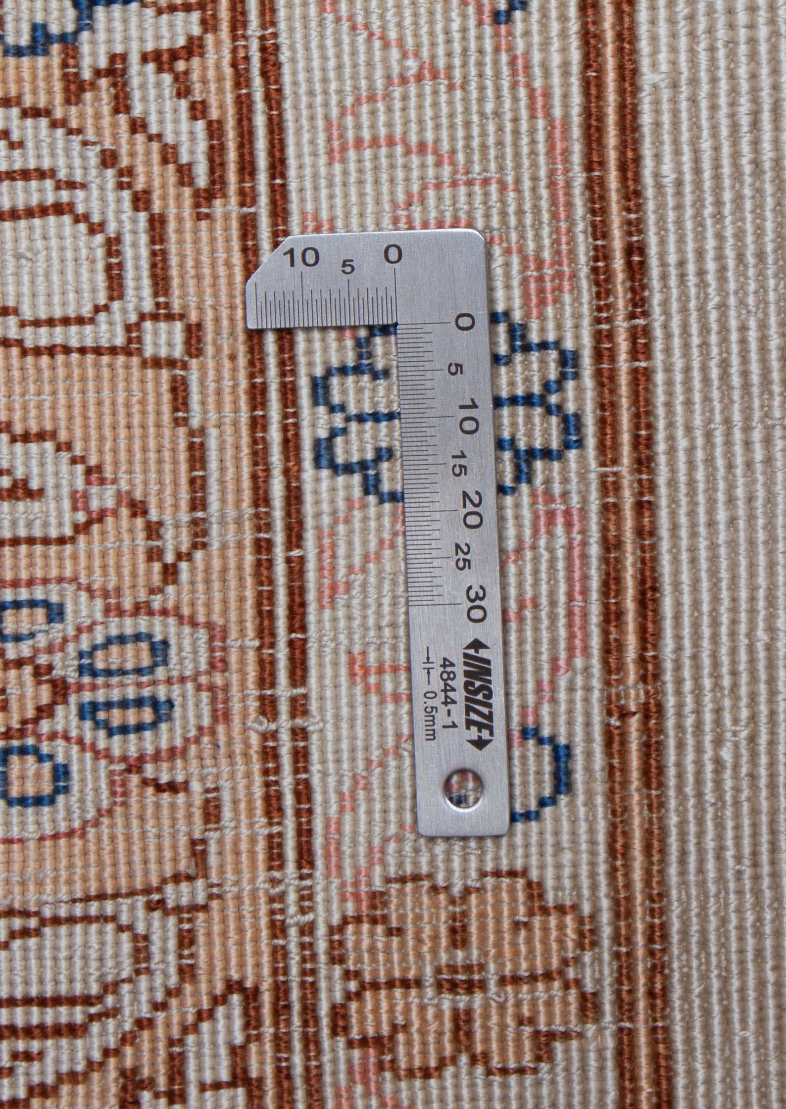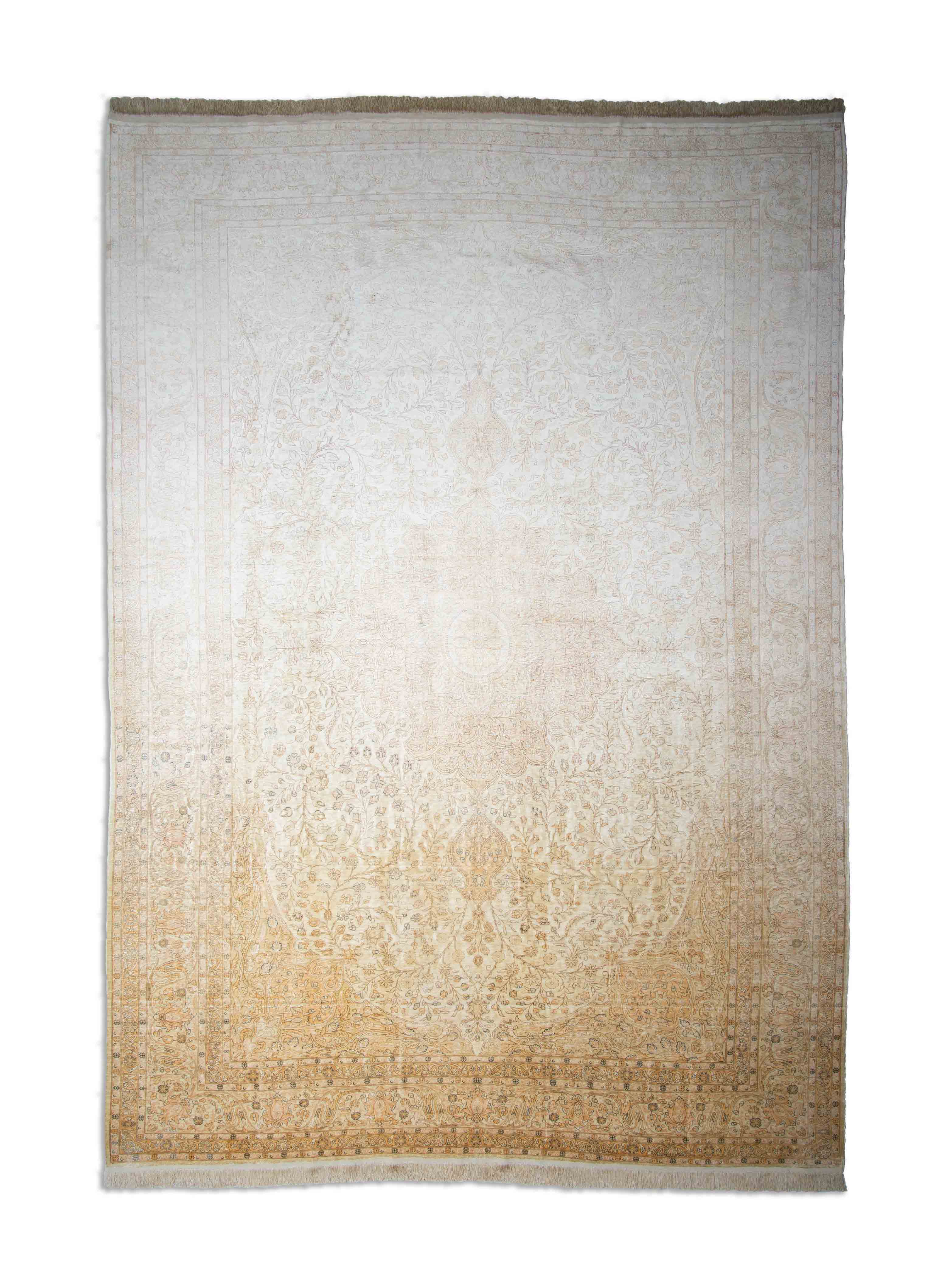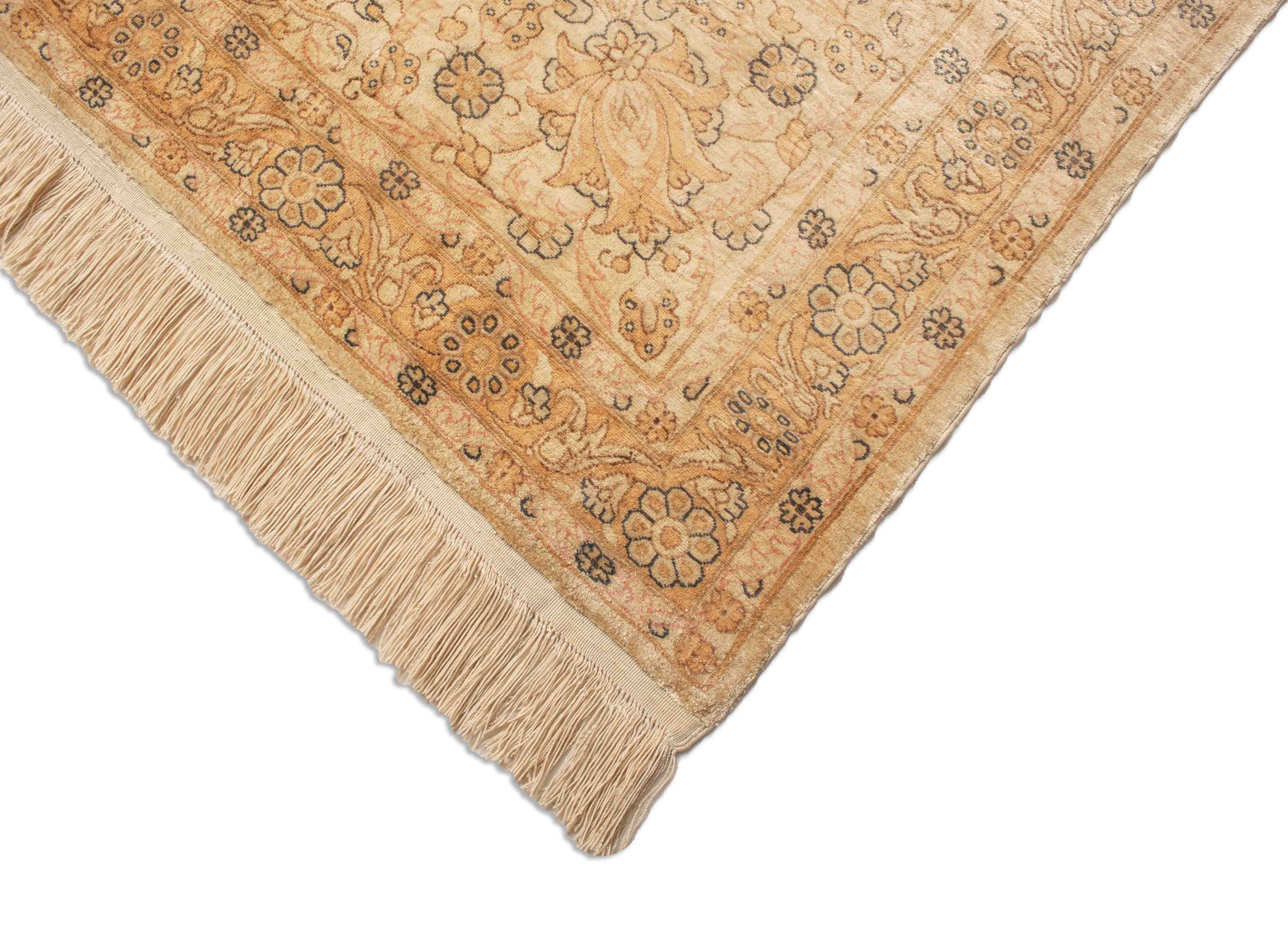 The Silk la Flore de ce Hereke laisse briller les couleurs du motif dans différentes nuances, selon la lumière. Il fait de cet ici un véritable accent et crée une atmosphère confortable et en même temps très élégante et de haute qualité dans la pièce. La soie est obtenue à la main des cocons de l'araignée de soie. Comme les fils de soie individuels sont extrêmement longs, des fils très fins peuvent être produits qui sont néanmoins résistants à la déchirure avec un faible poids. Des nœuds de tapis plus petits peuvent être fabriqués avec le fil mince et ainsi des motifs plus fin peuvent être produits. Par conséquent, les plus beaux tapis du monde sont faits à la main de la pure soie. Dans ce Hereke même le souterrain était pure soie fait. En raison du matériau mince mais durable des fils de trame et de chaîne, un bouton particulièrement fin et donc un motif particulièrement fin est possible.