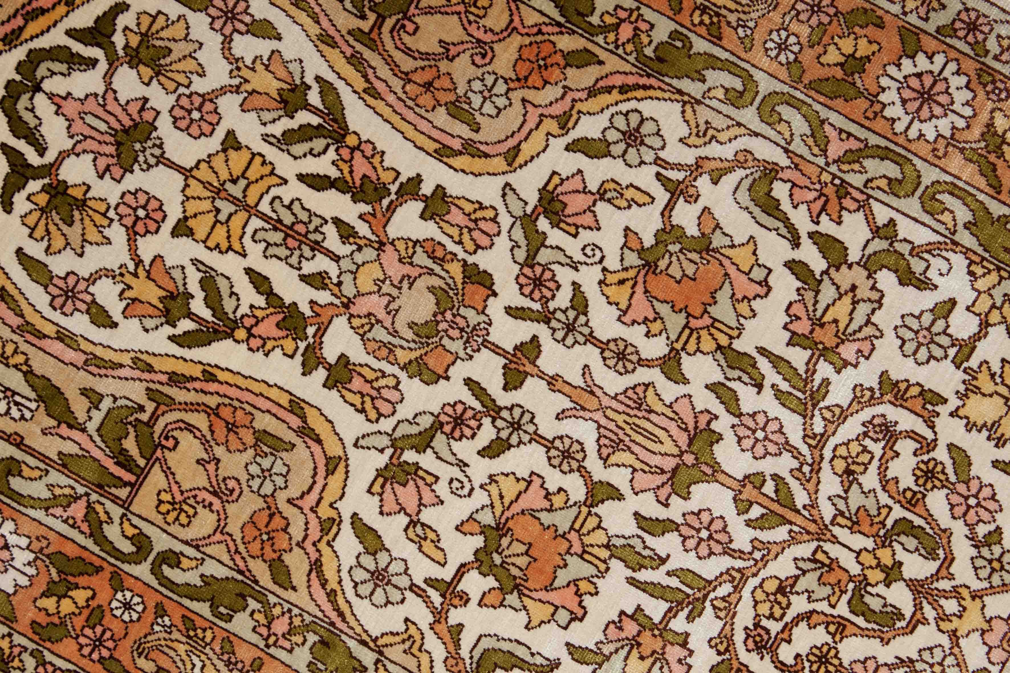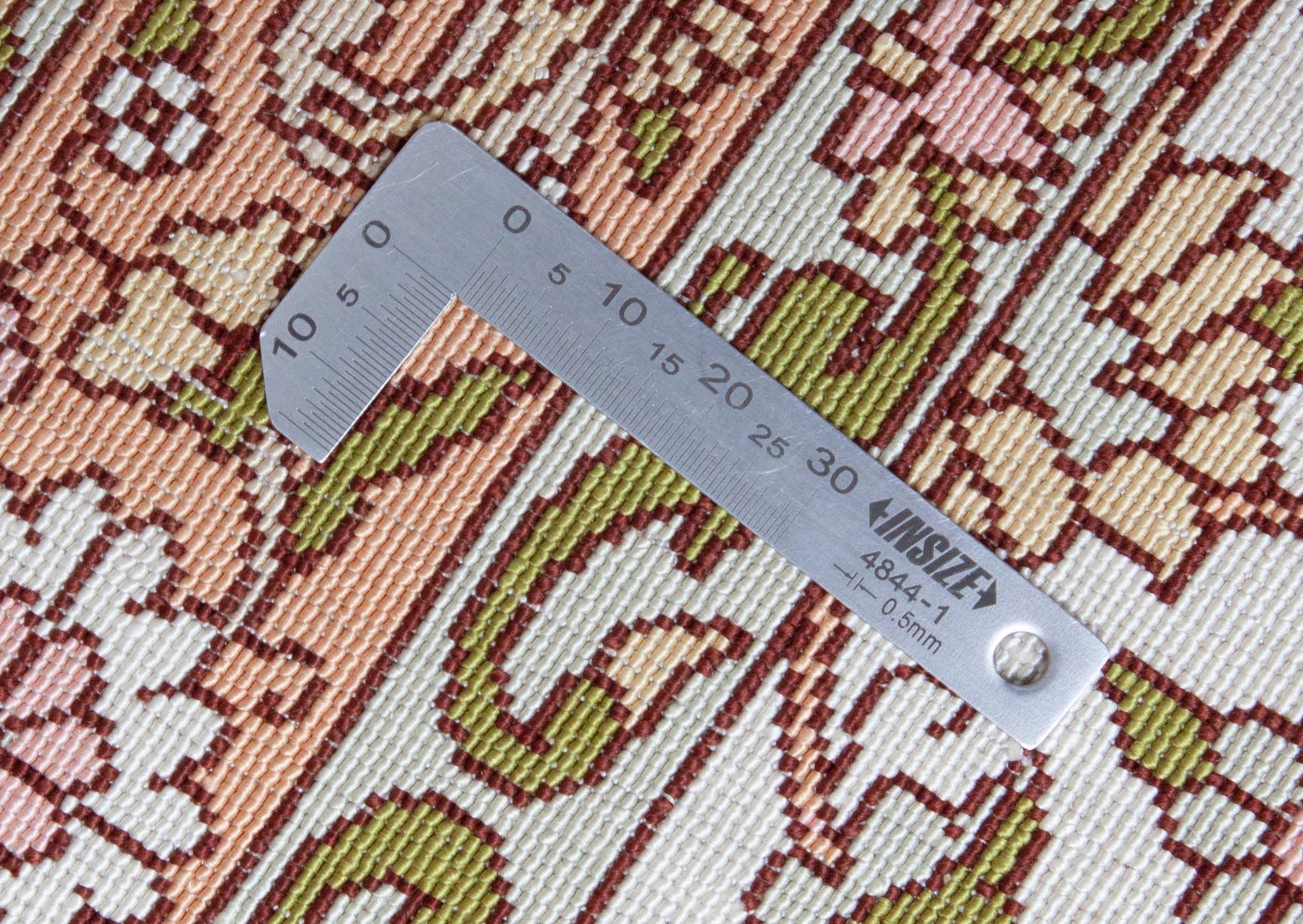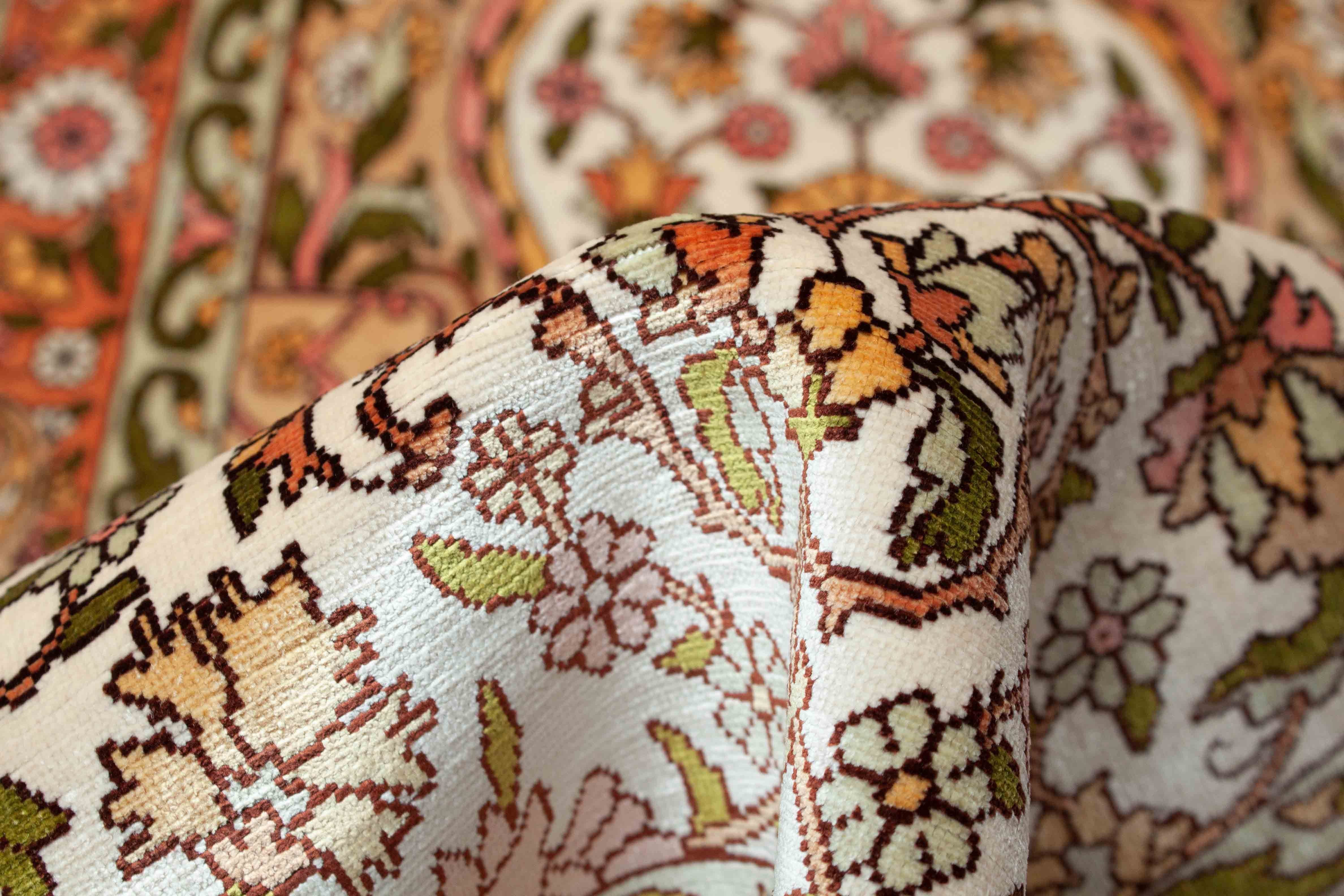 The Silk la Flore de ce Hereke laisse briller les couleurs du motif dans différentes nuances, selon la lumière. Il fait de cet ici un véritable accent et crée une atmosphère confortable et en même temps très élégante et de haute qualité dans la pièce. La soie est obtenue à la main des cocons de l'araignée de soie. Comme les fils de soie individuels sont extrêmement longs, des fils très fins peuvent être produits qui sont néanmoins résistants à la déchirure avec un faible poids. Des nœuds de tapis plus petits peuvent être fabriqués avec le fil mince et ainsi des motifs plus fin peuvent être produits. Par conséquent, les plus beaux tapis du monde sont faits à la main de la pure soie. Dans ce Hereke même le souterrain était pure soie fait. En raison du matériau mince mais durable des fils de trame et de chaîne, un bouton particulièrement fin et donc un motif particulièrement fin est possible.