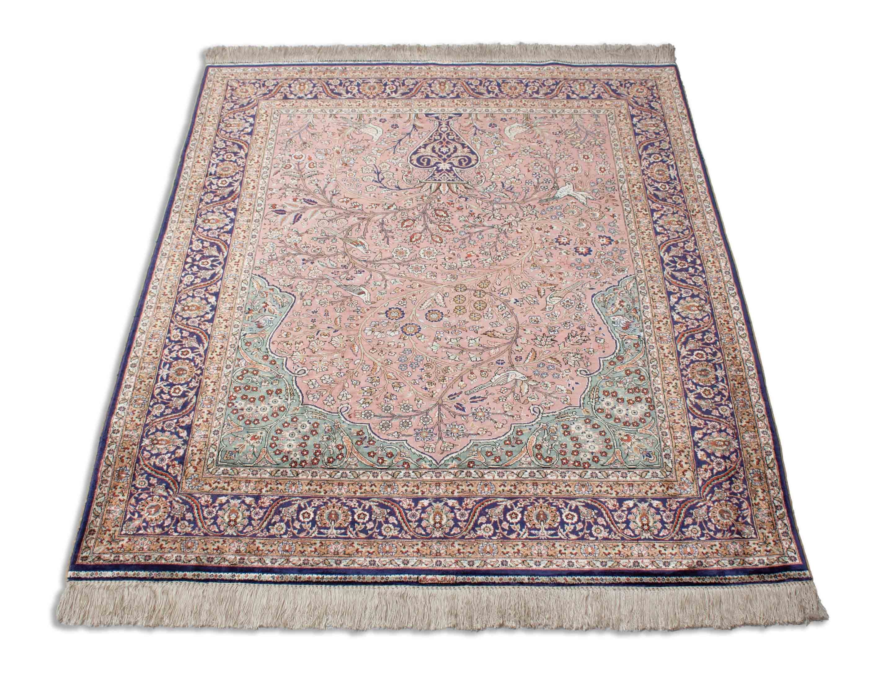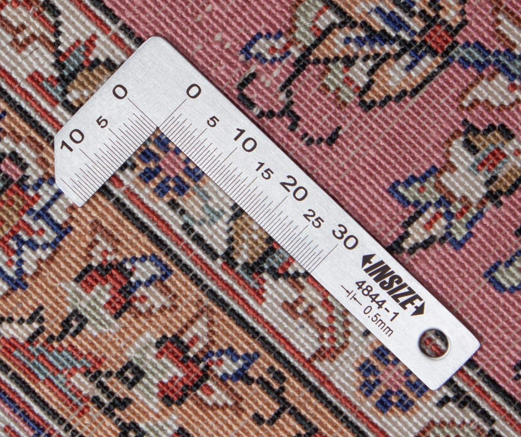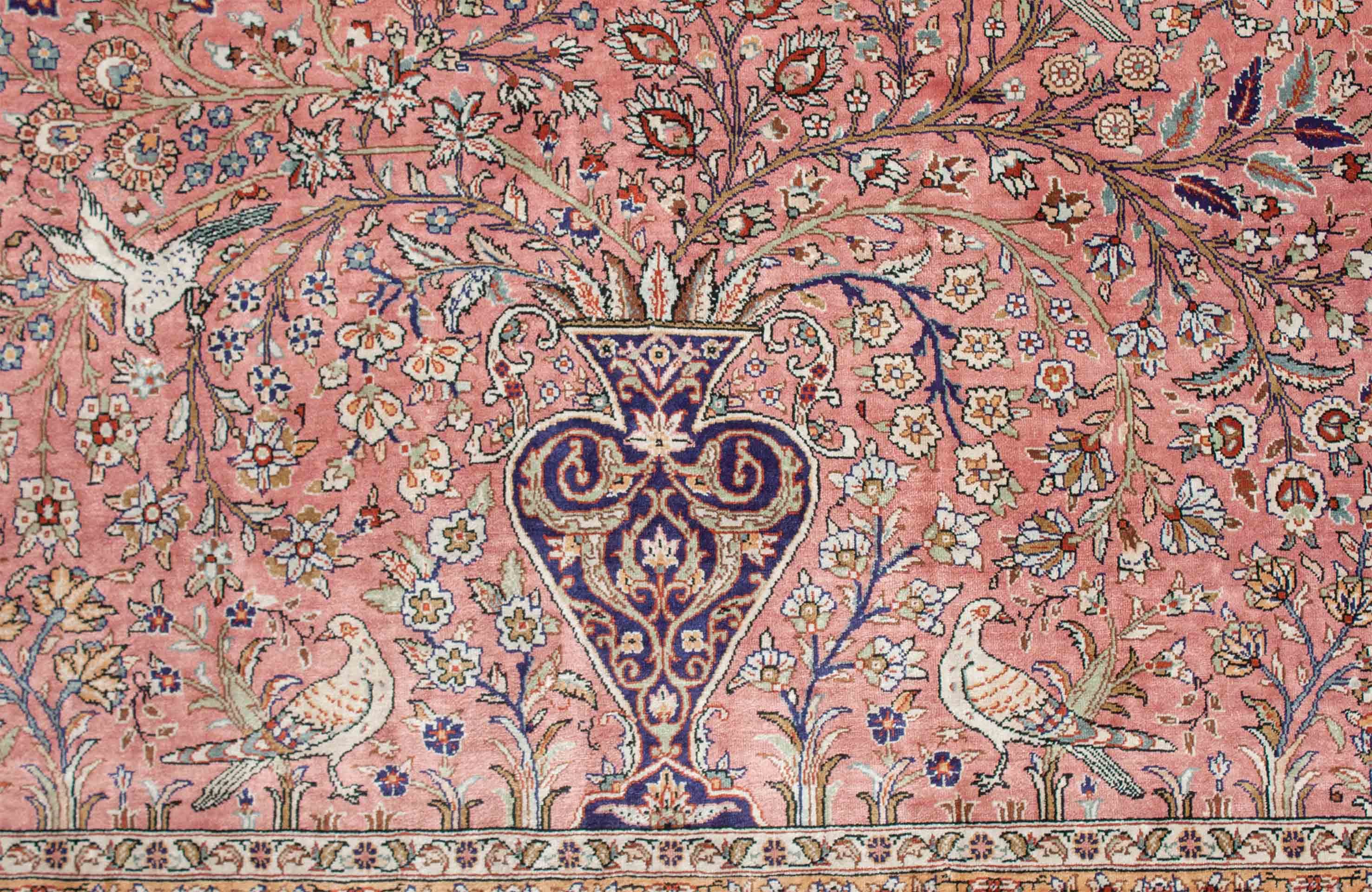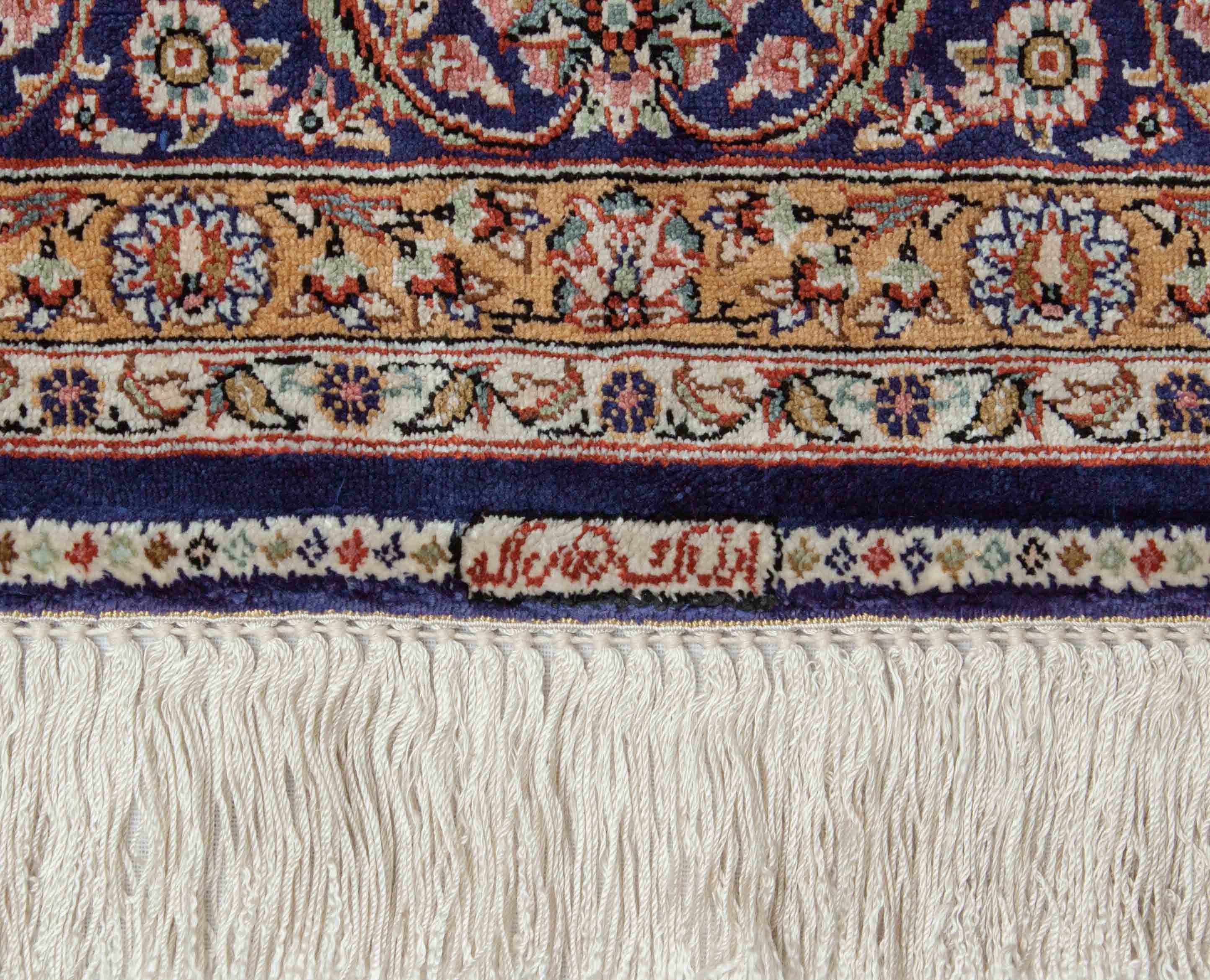 The Silk la Flore de ce Hereke laisse briller les couleurs du motif dans différentes facettes, selon l'incidence de la lumière. Il en fait un véritable bijou et crée une atmosphère confortable et en même temps très élégante et de haute qualité dans la pièce. La soie est obtenue à la main des cocons de l'araignée de soie. Comme les fils de soie individuels sont extrêmement longs, des fils très fins peuvent être produits qui sont néanmoins résistants à la déchirure avec un faible poids. Des nœuds de tapis plus petits peuvent être fabriqués avec le fil mince et ainsi des motifs plus fin peuvent être produits. Par conséquent, les plus beaux tapis du monde sont faits à la main de la pure soie. Dans ce Hereke même le souterrain était pure soie fait. En raison du matériau mince mais durable des fils de trame et de chaîne, un bouton particulièrement fin et donc un motif particulièrement fin est possible.