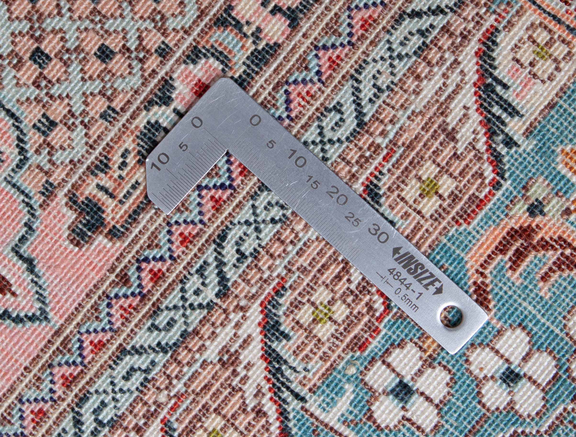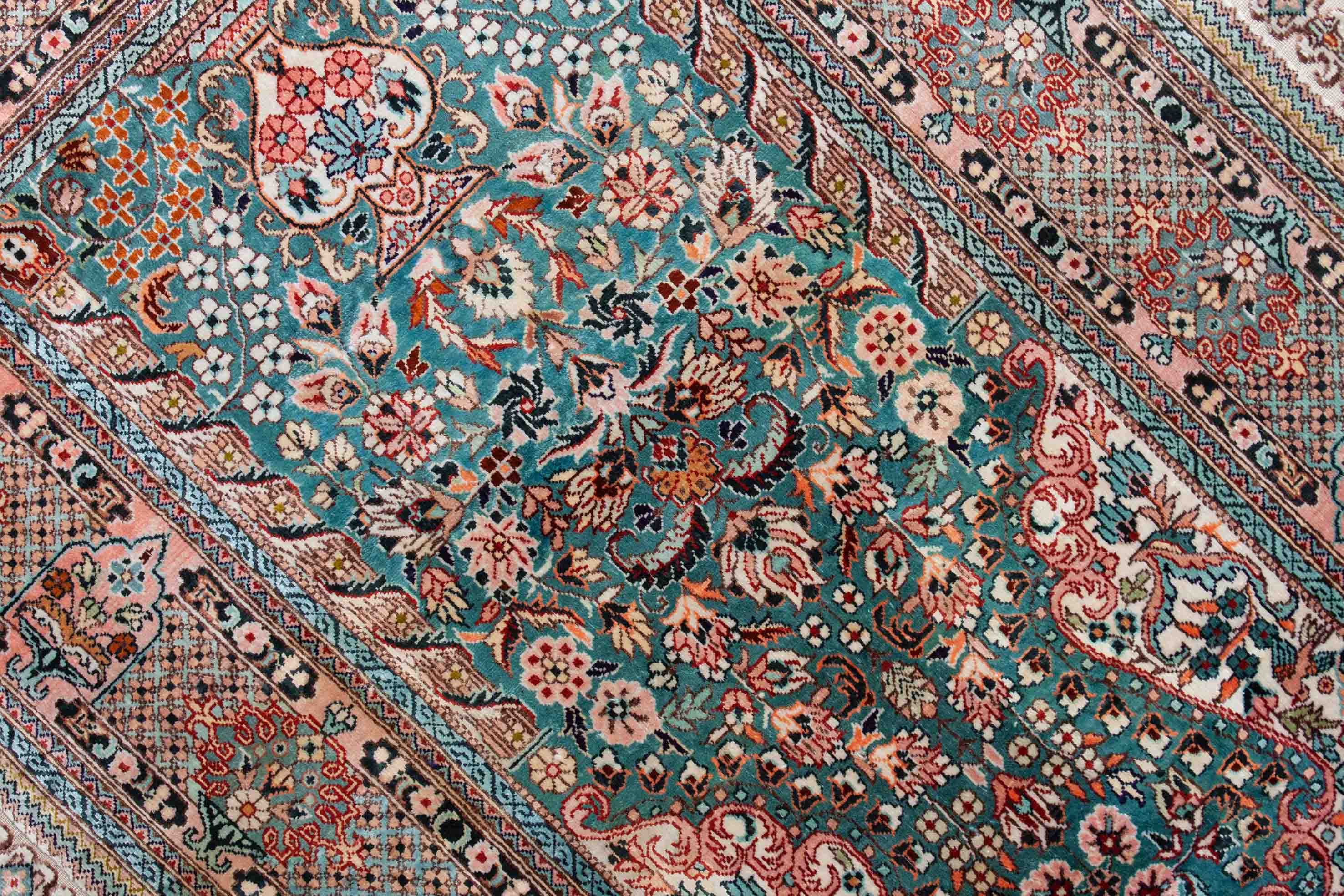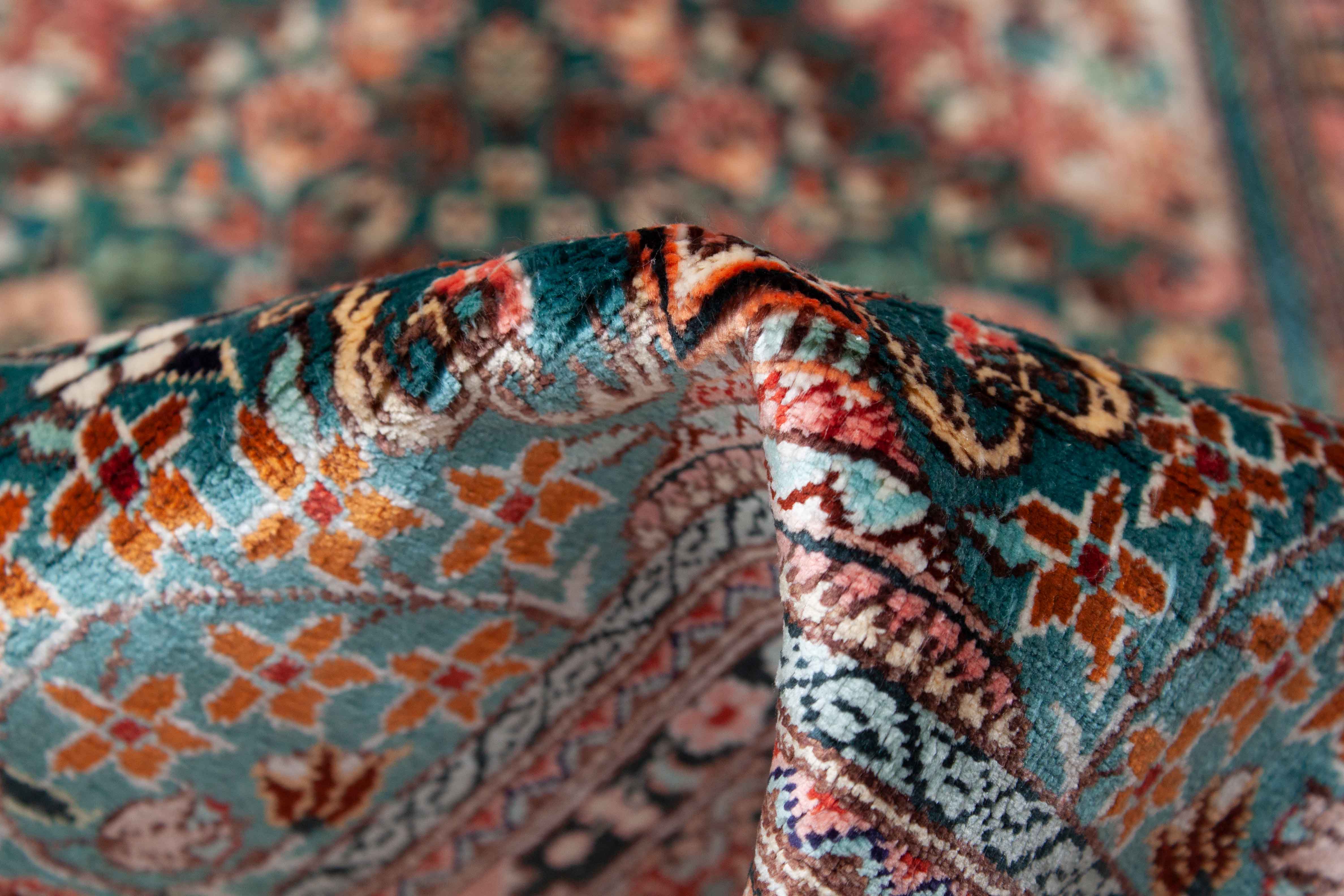 The Silk la Flore de ce Hereke laisse briller les couleurs du motif dans différentes facettes, selon l'incidence de la lumière. Il fait de cet ici un véritable accent et crée une atmosphère confortable et en même temps très élégante et de haute qualité dans la pièce. La soie est obtenue à la main des cocons de l'araignée de soie. Comme les fils de soie individuels sont extrêmement longs, des fils très fins peuvent être produits qui sont néanmoins résistants à la déchirure avec un faible poids. Des nœuds de tapis plus petits peuvent être fabriqués avec le fil mince et ainsi des motifs plus fin peuvent être produits. Par conséquent, les plus beaux tapis du monde sont faits à la main de la pure soie. Dans ce Hereke même le souterrain était pure soie fait. En raison du matériau mince mais durable des fils de trame et de chaîne, un bouton particulièrement fin et donc un motif particulièrement fin est possible.