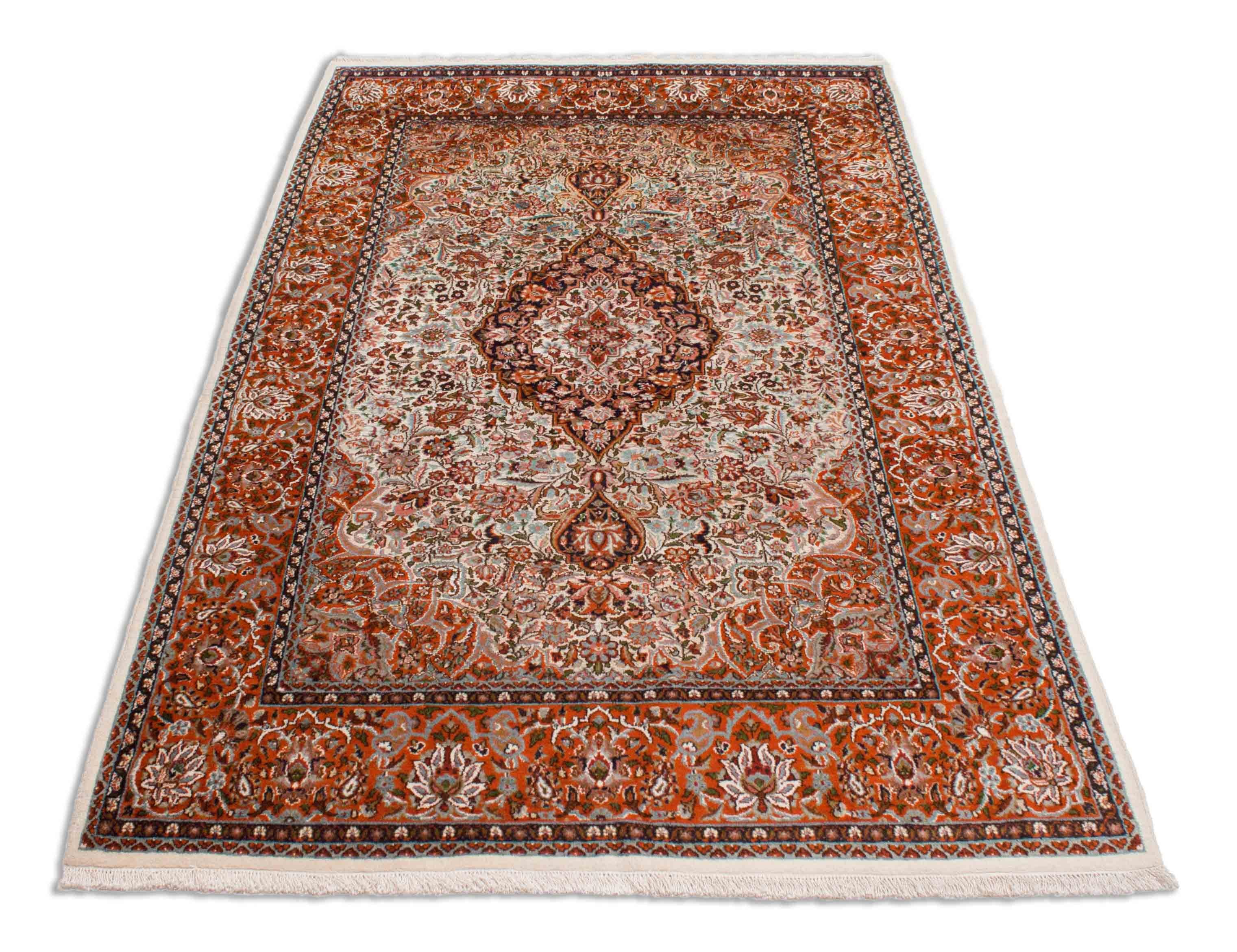 Le Flor de ce tapis en cachemire a été fait de haute qualité laine vierge fait main. Des détails de motif individuels ont également été mis en évidence par le gloss de coton mercerisé.