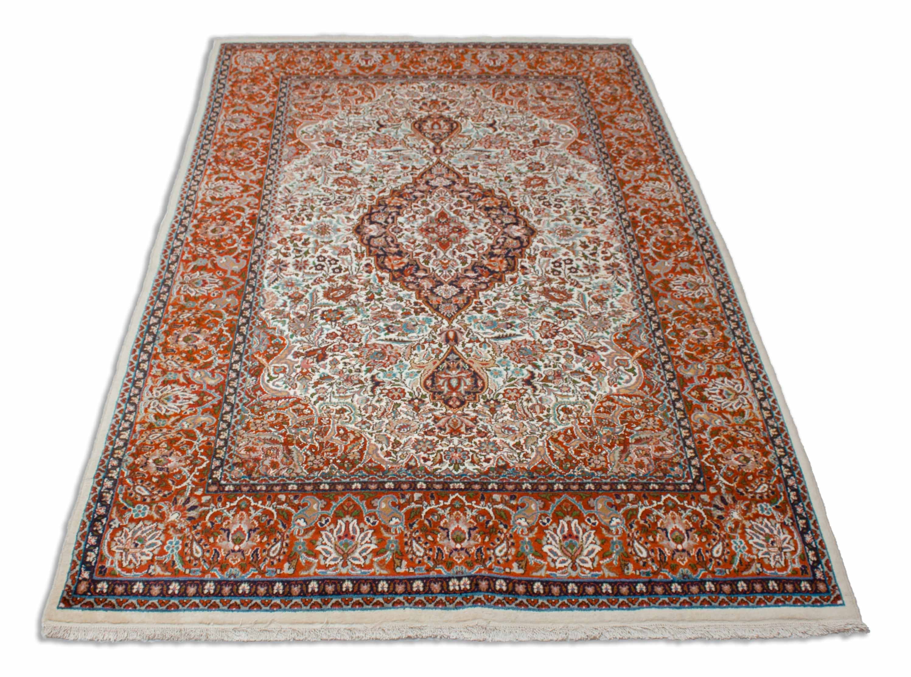 L'arrière-plan de ce tapis de Cachemire est Creméwhite. Dans l'impression totale, la rouille de couleur rouge domine. Le bord est fait dans les couleurs rouge rouille et blanc crème. Dans le centre bleu foncé, les couleurs cremé blanc et rouge gris sont combinées.