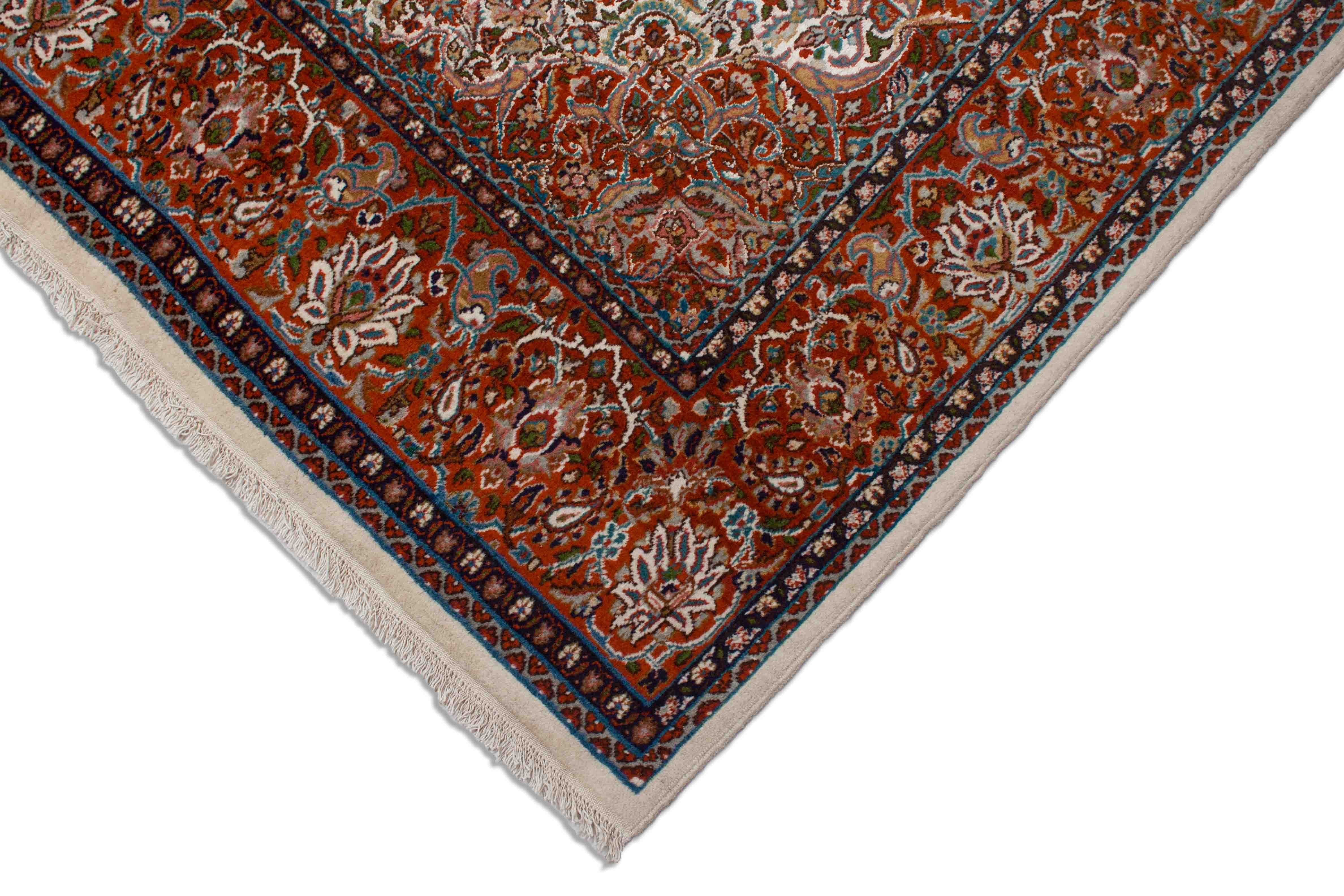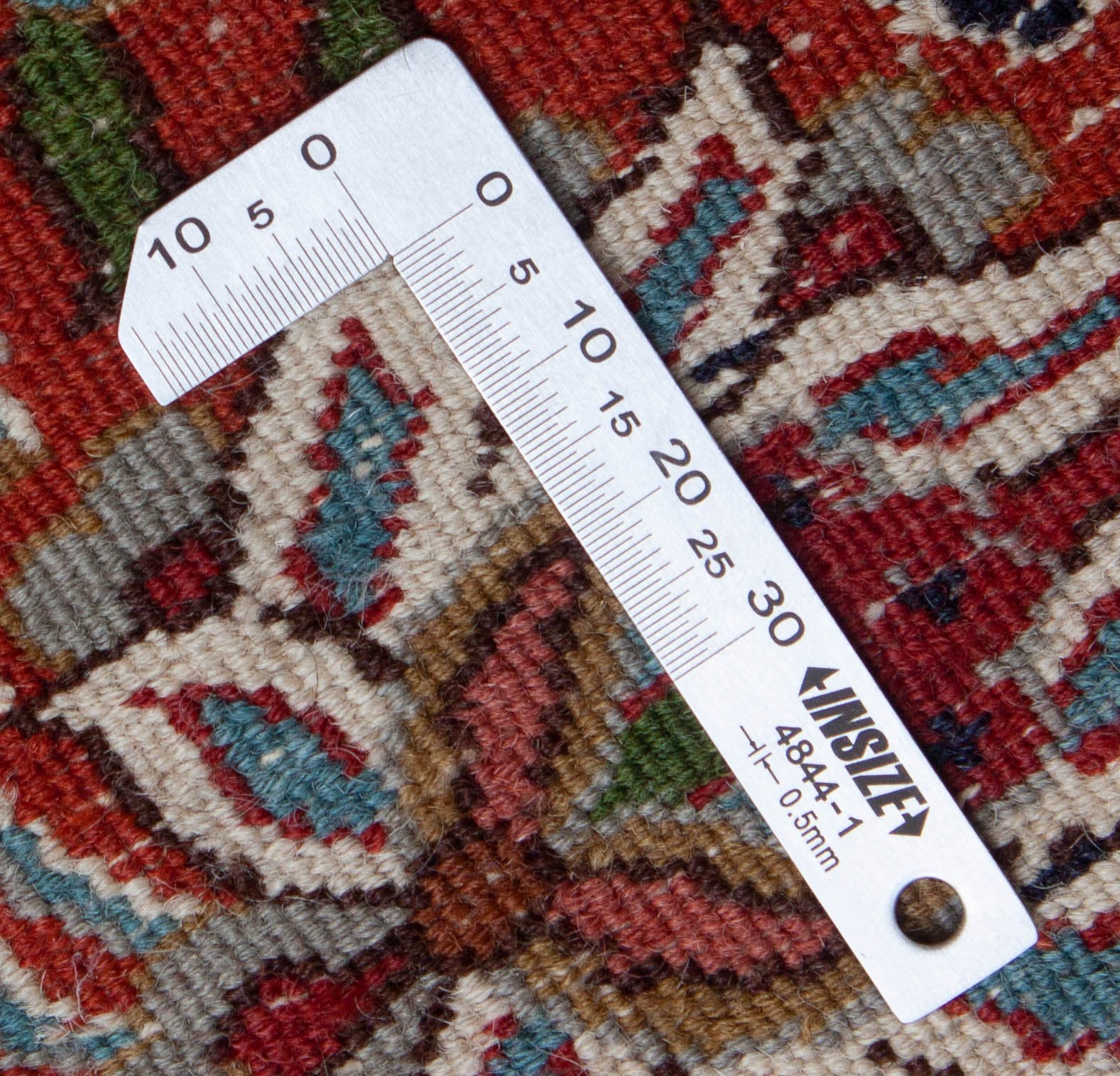 Au milieu du champ central de ce tapis en cachemire se trouve le centre symétrique, qui aussi médaillon est appelé. La conception du terrain est subordonnée au médaillon, de sorte que l'impression surgit que le médaillon conduit sur le terrain.