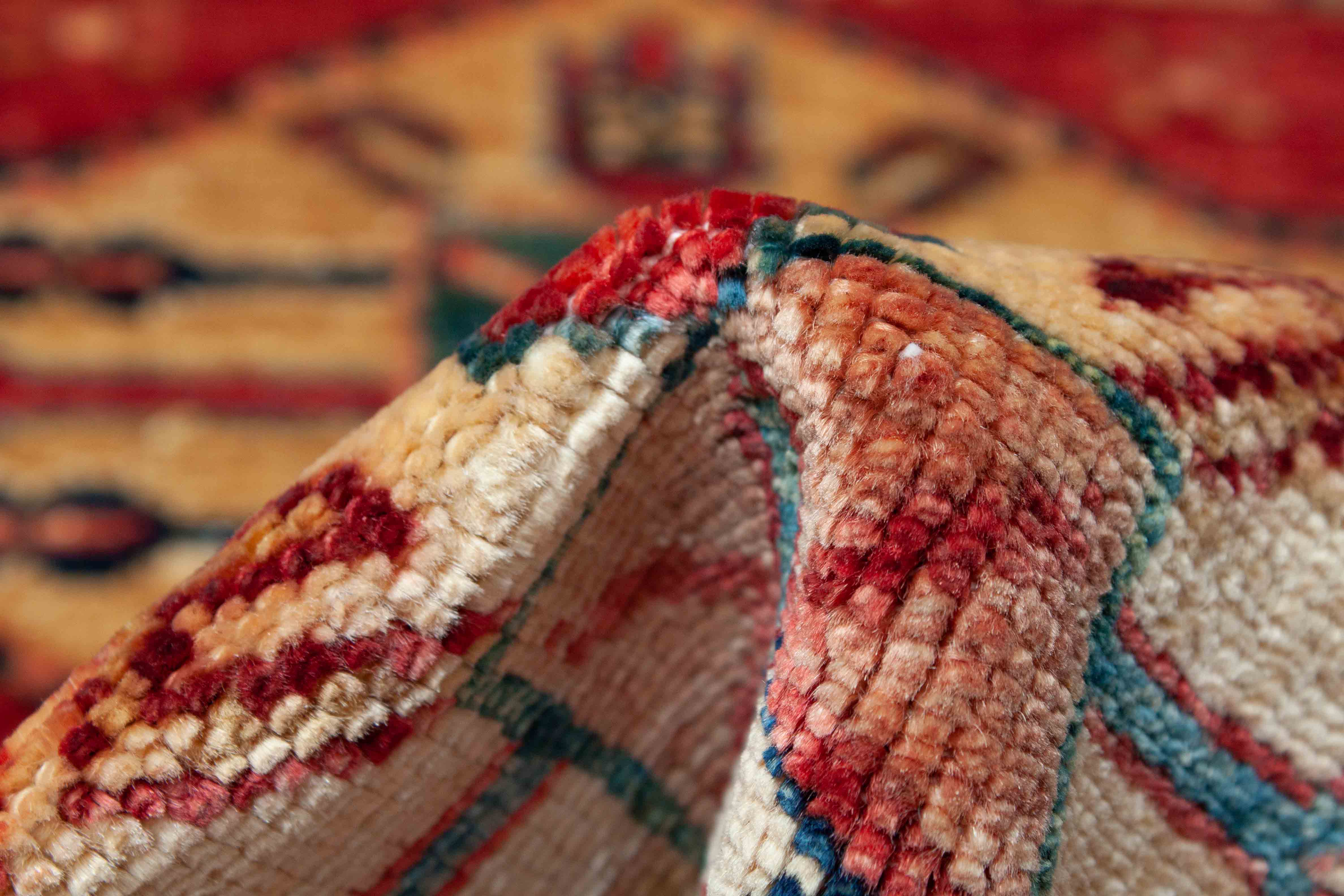 La surface de ce cazak agit mélodie. Les changements de couleur et les teintes claires du fil Flor font briller les couleurs et rendent le tapis insensible à la contamination. En raison de ces soi-disant sauts de couleur, le tapis est plus vif. La fusion se produit parce que la laine de ce Kazak était à la main. Pendant la coloration, les colorants naturels sont absorbés différemment.
