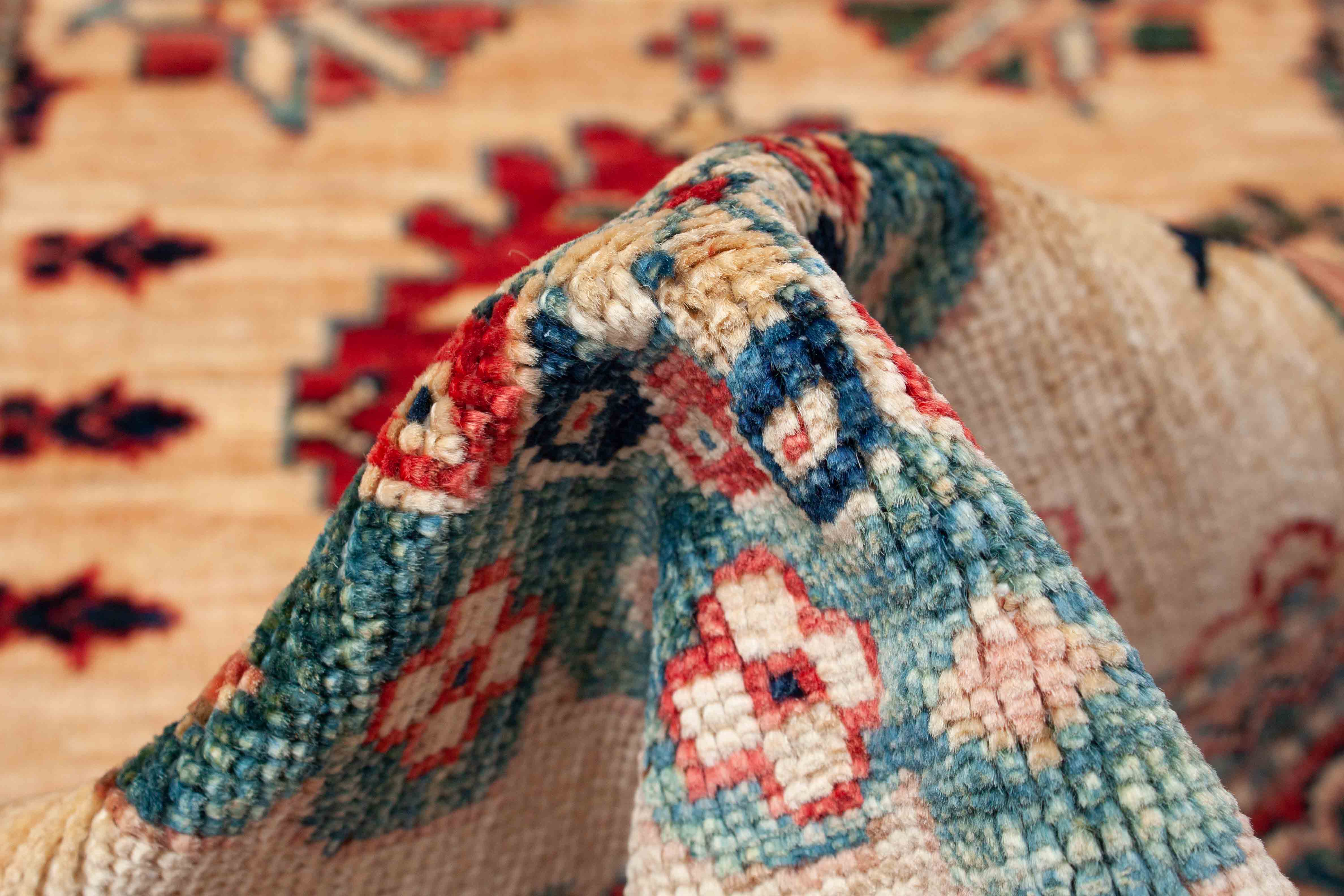 La surface de ce cazak agit mélodie. Les changements de couleur et les teintes claires du fil Flor font briller les couleurs et rendent le tapis insensible à la contamination. En raison de ces soi-disant sauts de couleur, le tapis est plus vif. La fusion se produit parce que la laine de ce Kazak était à la main. Pendant la coloration, les colorants naturels sont absorbés différemment.