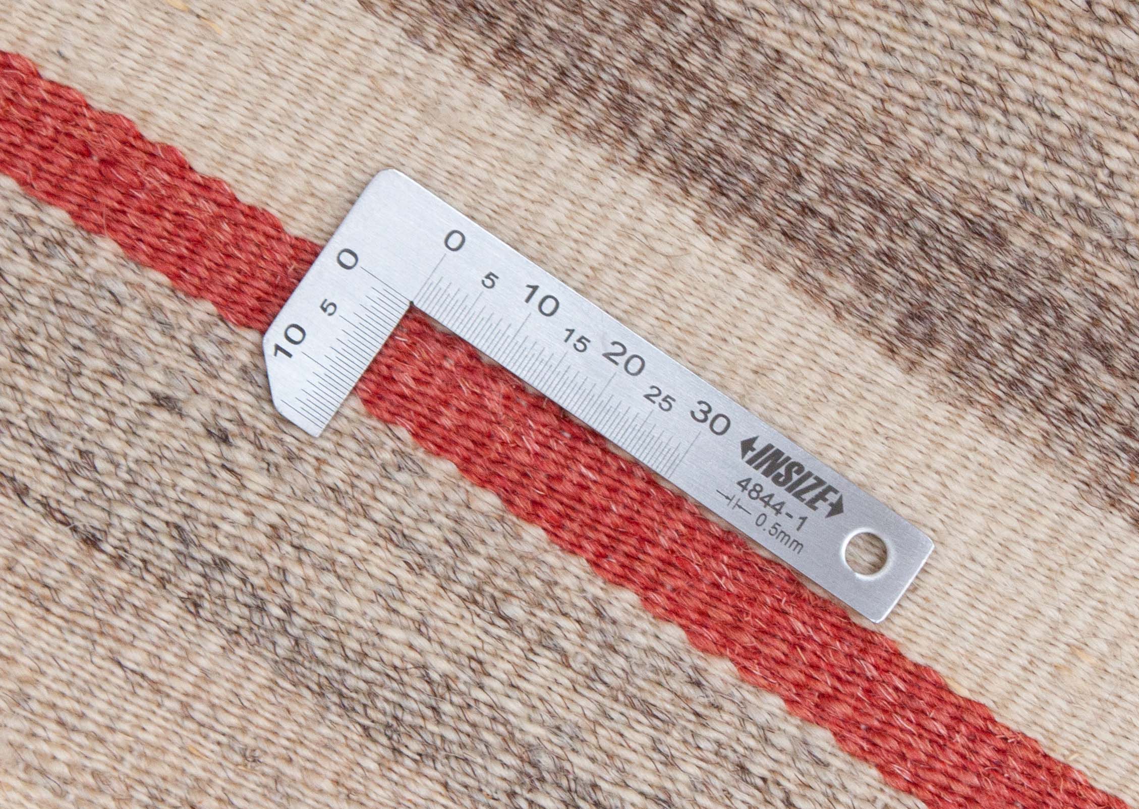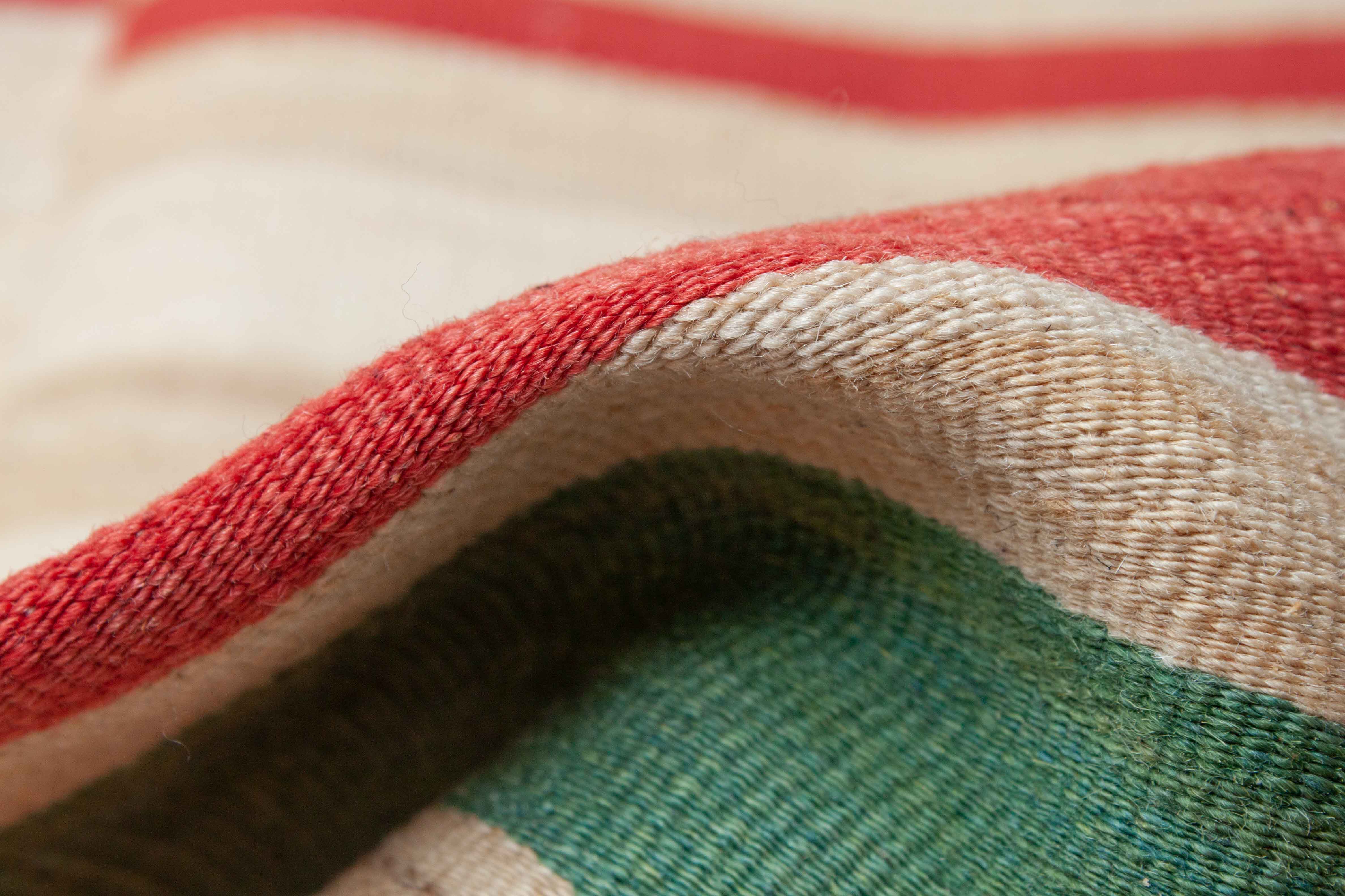 La surface de ce Kelim agit mélodie. Les changements de couleur et les teintes claires du fil Flor font briller les couleurs et rendent le tapis insensible à la contamination. En raison de ces soi-disant sauts de couleur, le tapis est plus vif. La fusion se produit parce que la laine de ce Kelim était à portée de main. Pendant la coloration, les colorants naturels sont absorbés différemment.