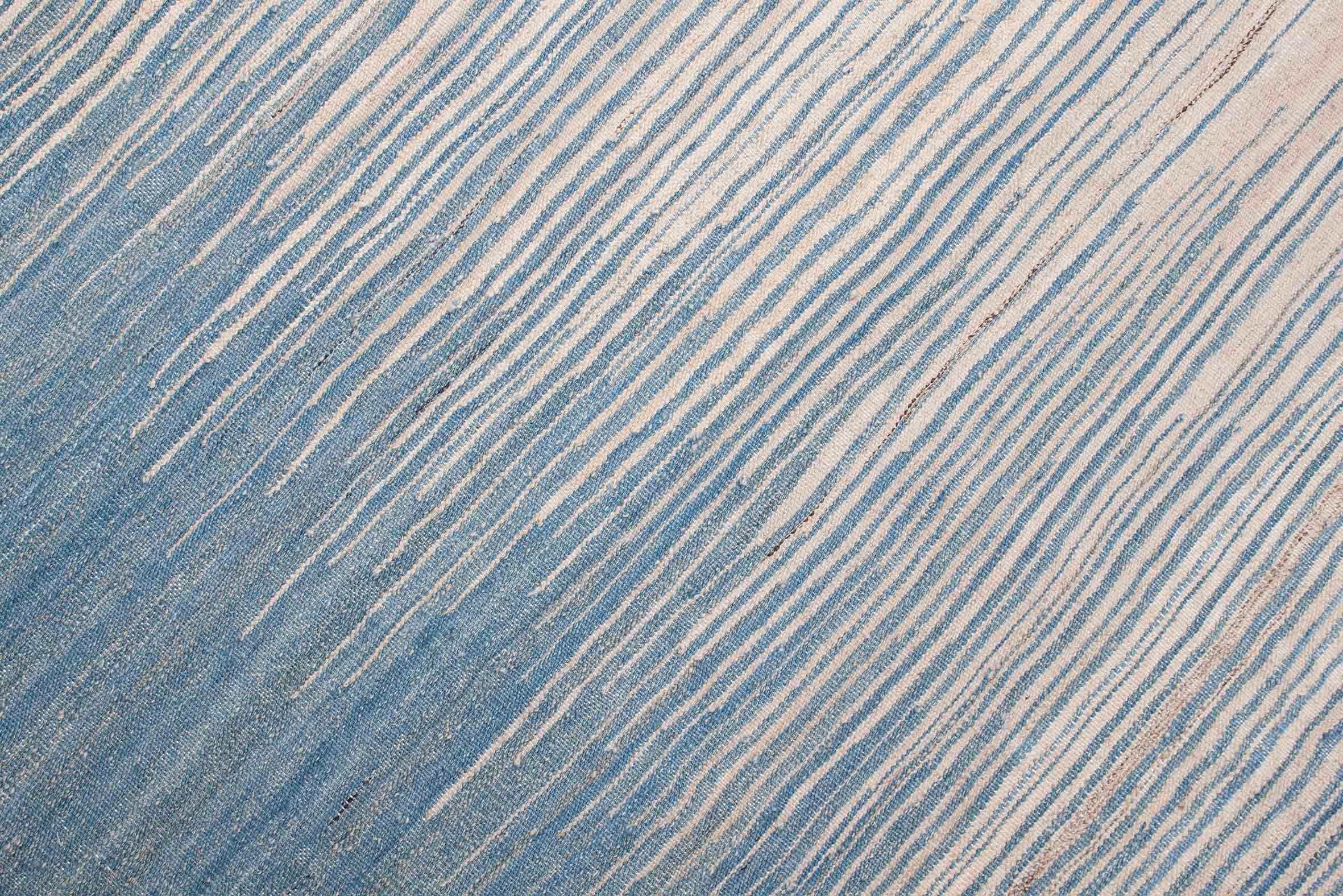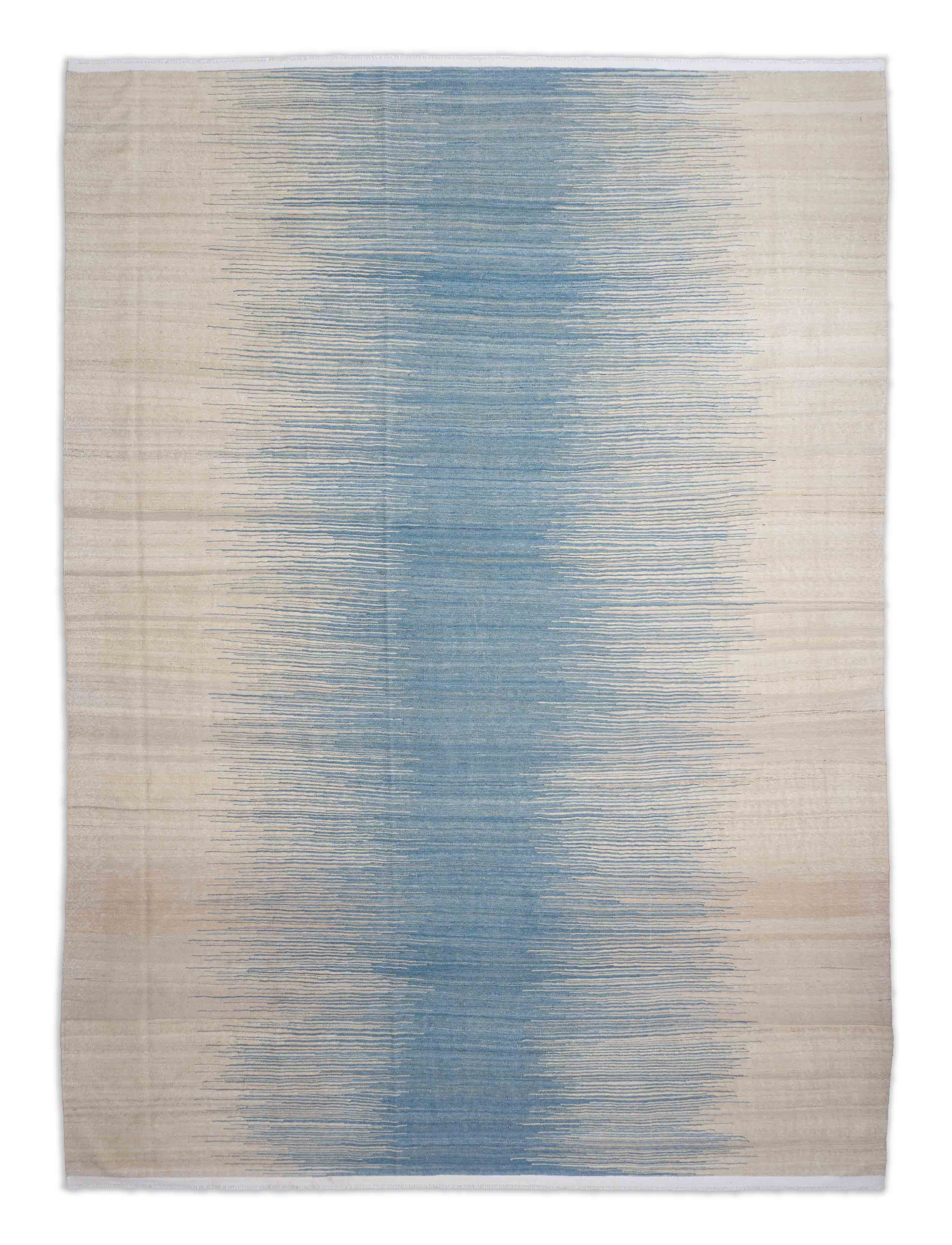 Le fond de ce Kelim est bleu clair. En général, les couleurs dominent aussi le beige et le bleu clair.