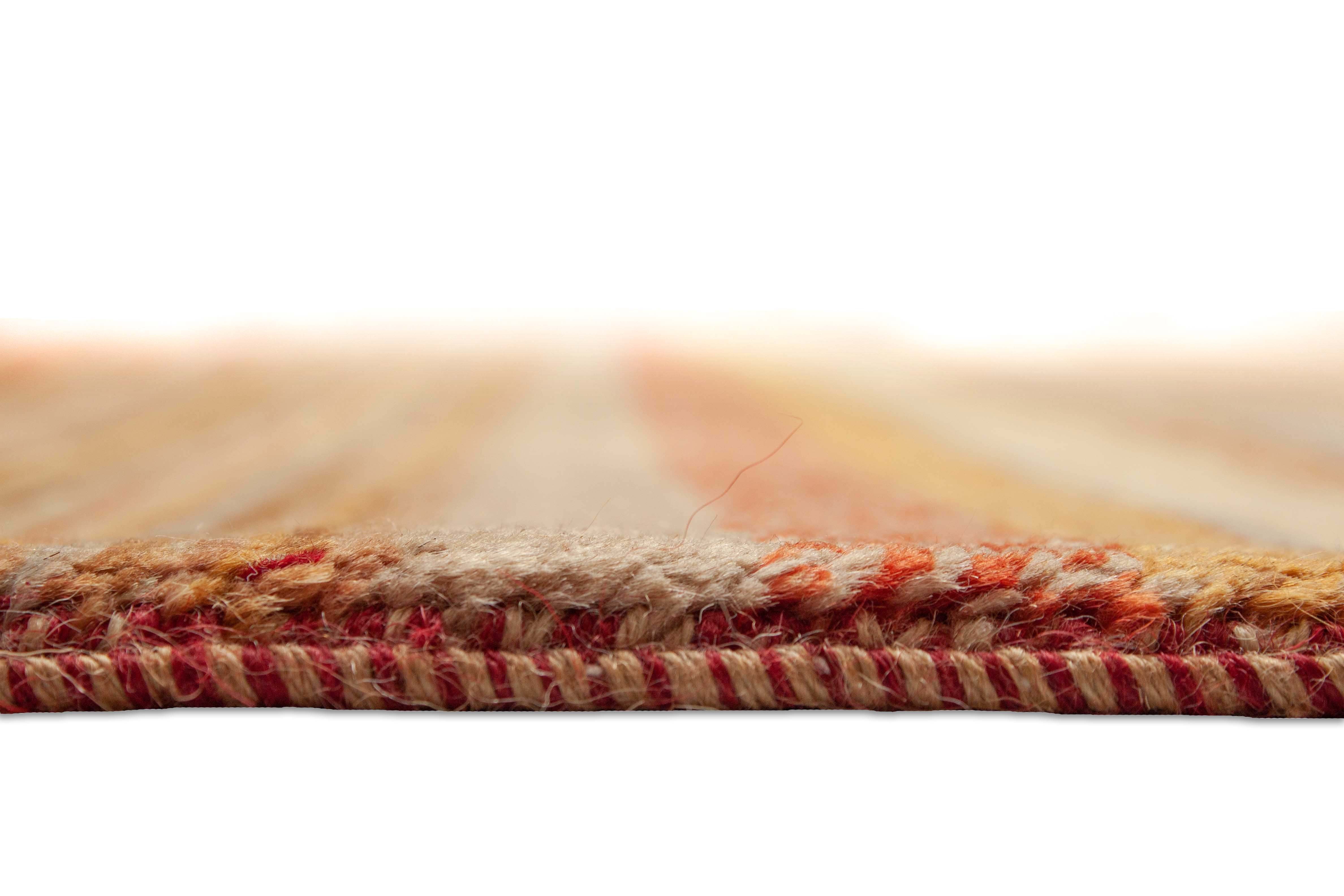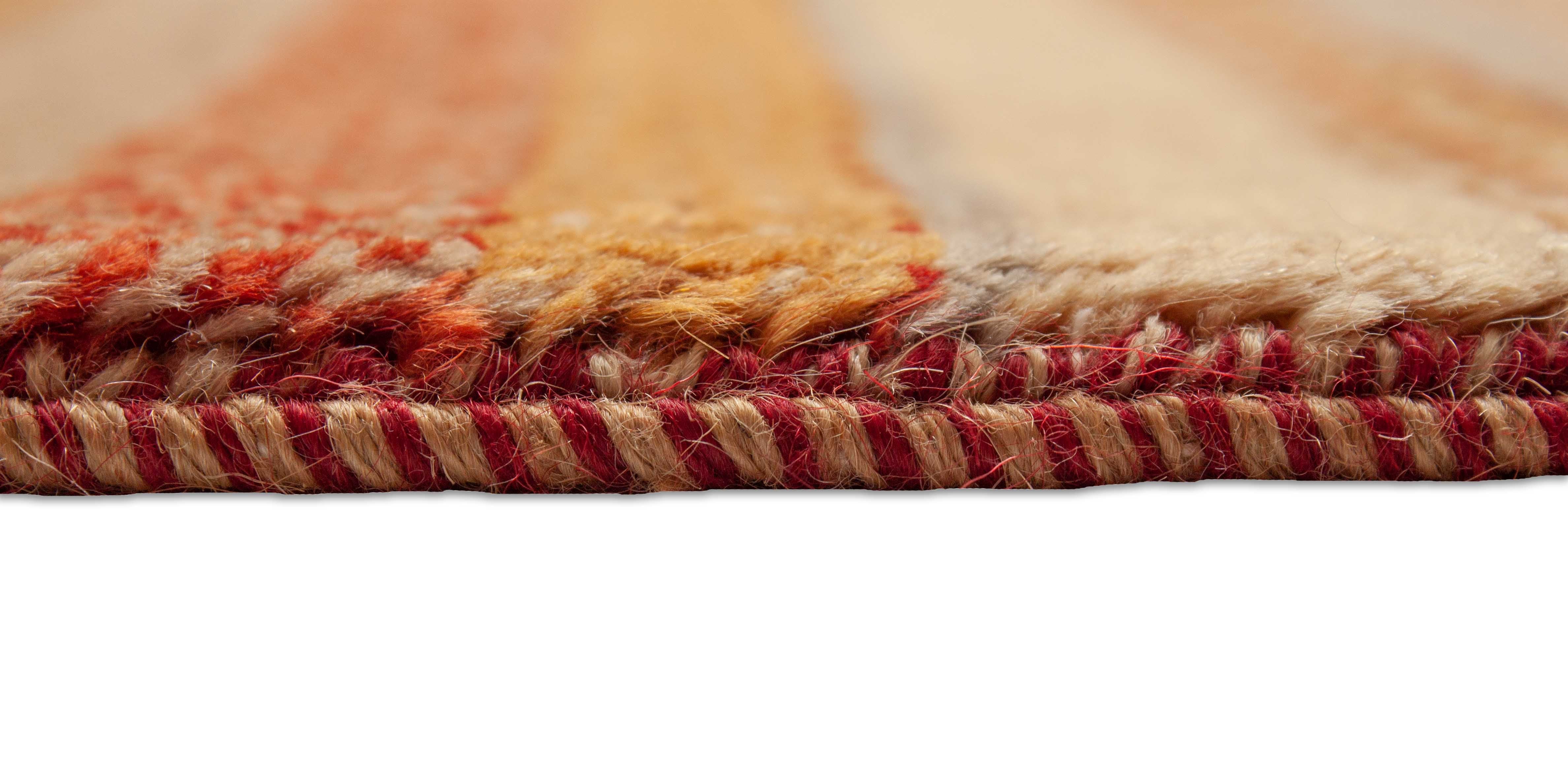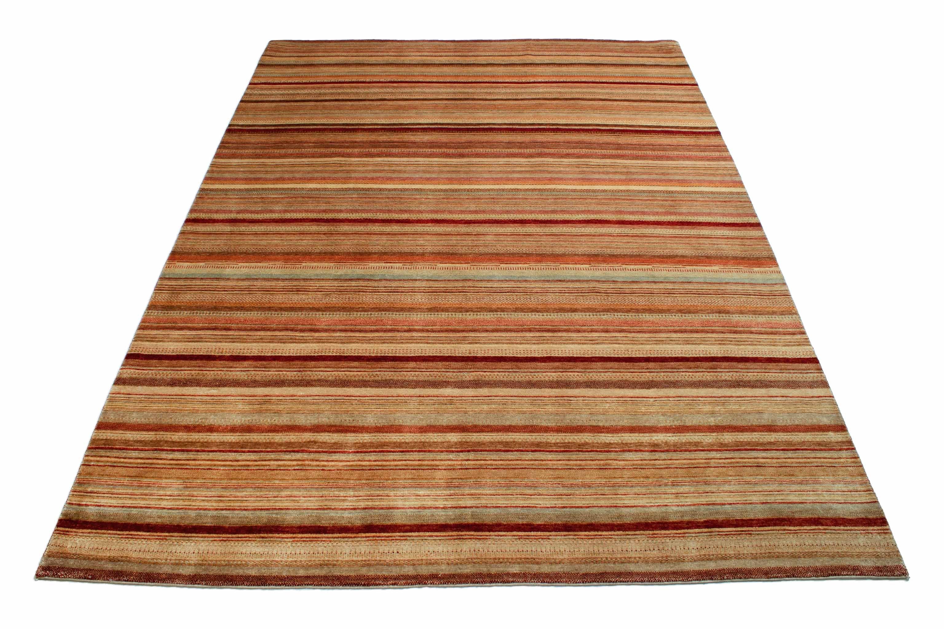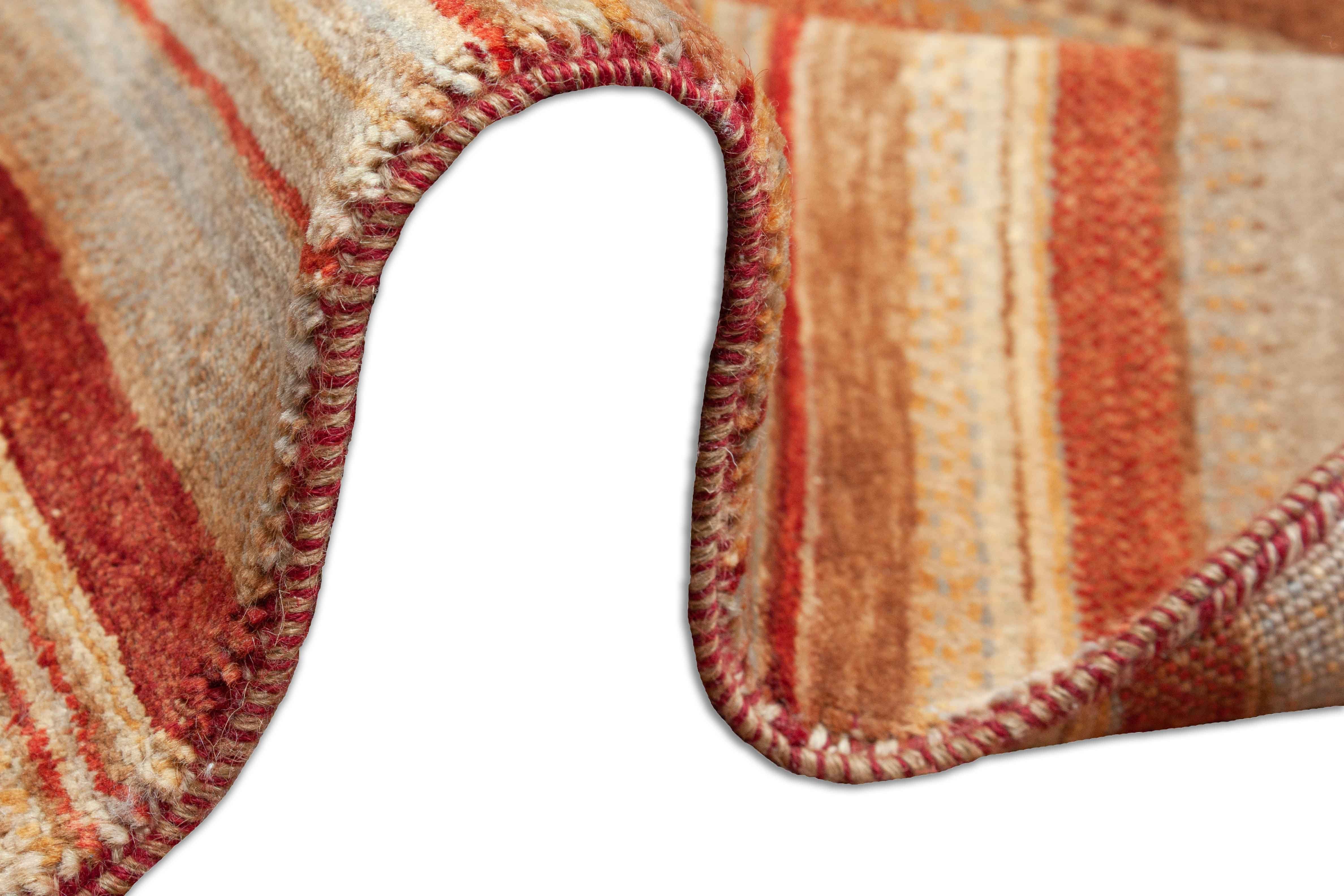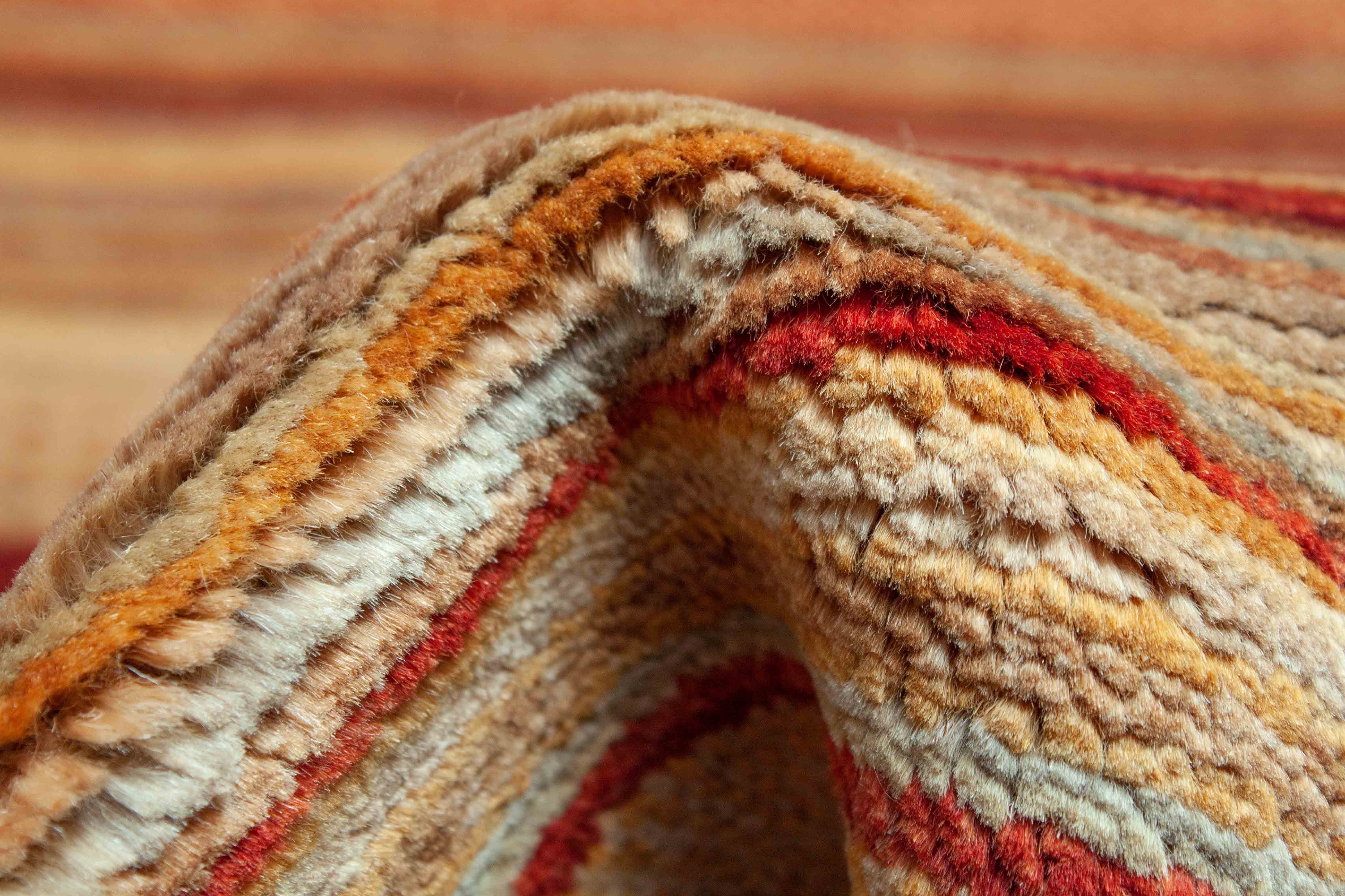 Le motif de ce tapis incarne des bandes croisées et des profils de couleur qui sont maintenus dans des tons de terre de rouge rouillé à jaune. Le motif rappelle le design de bande typique de la compagnie de mode italienne Missoni.