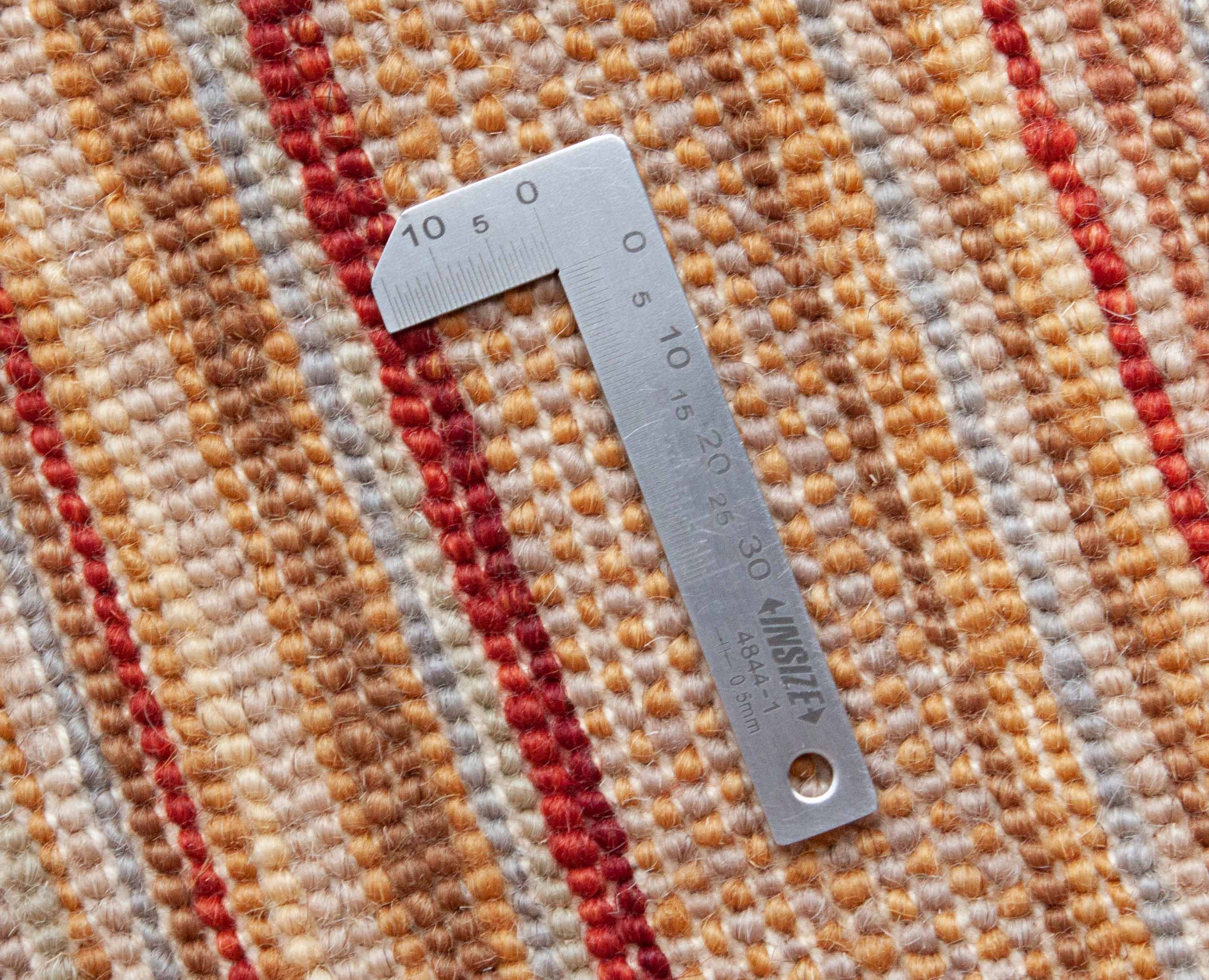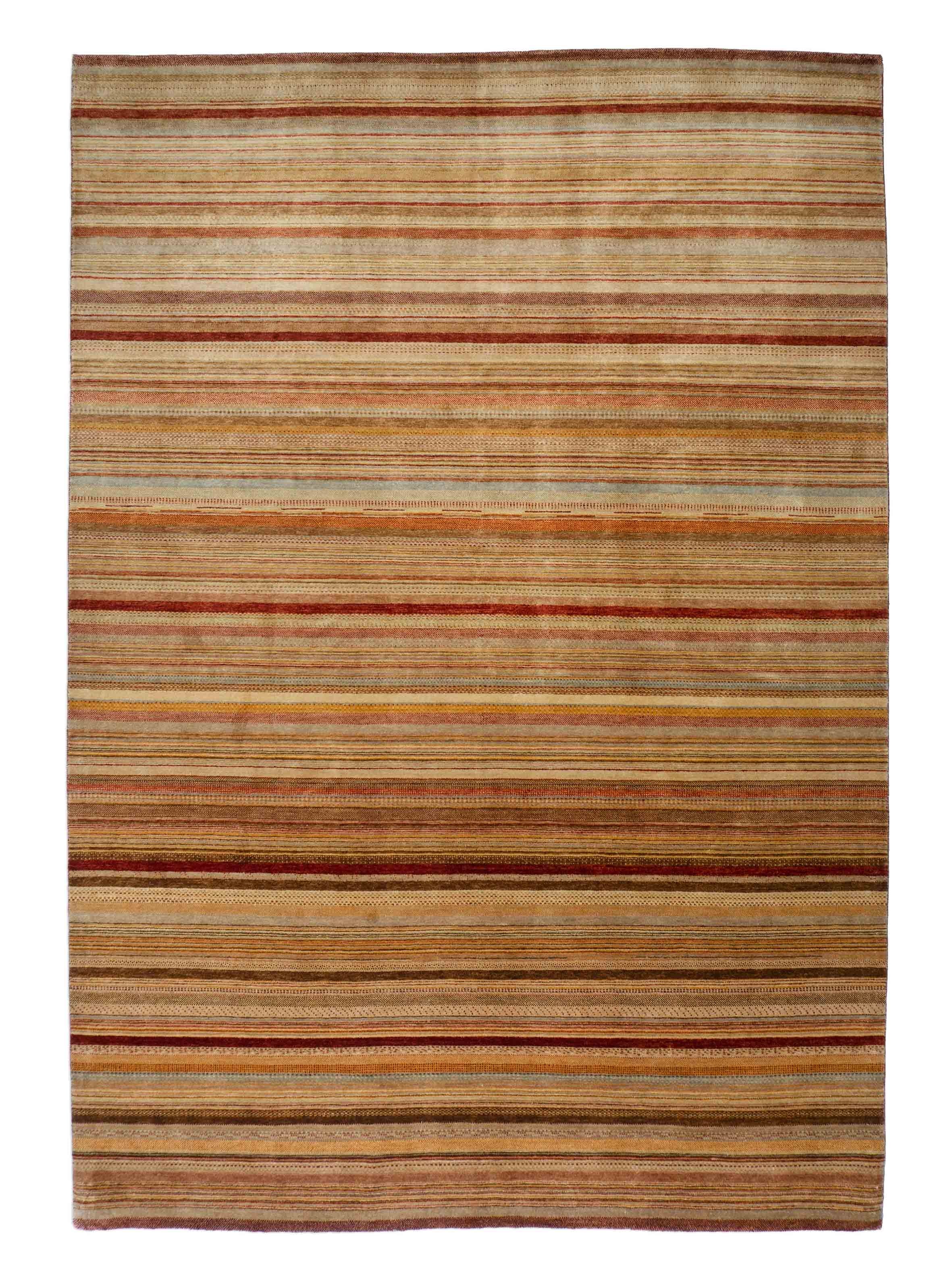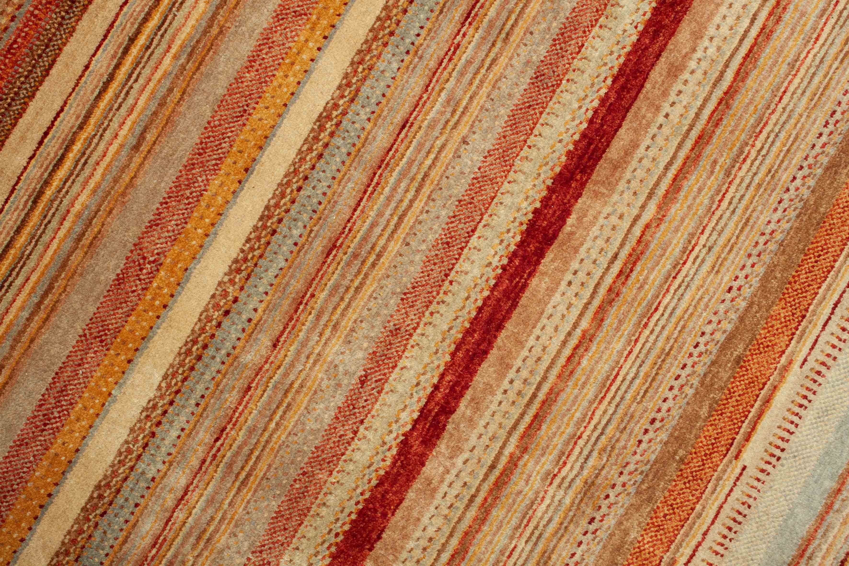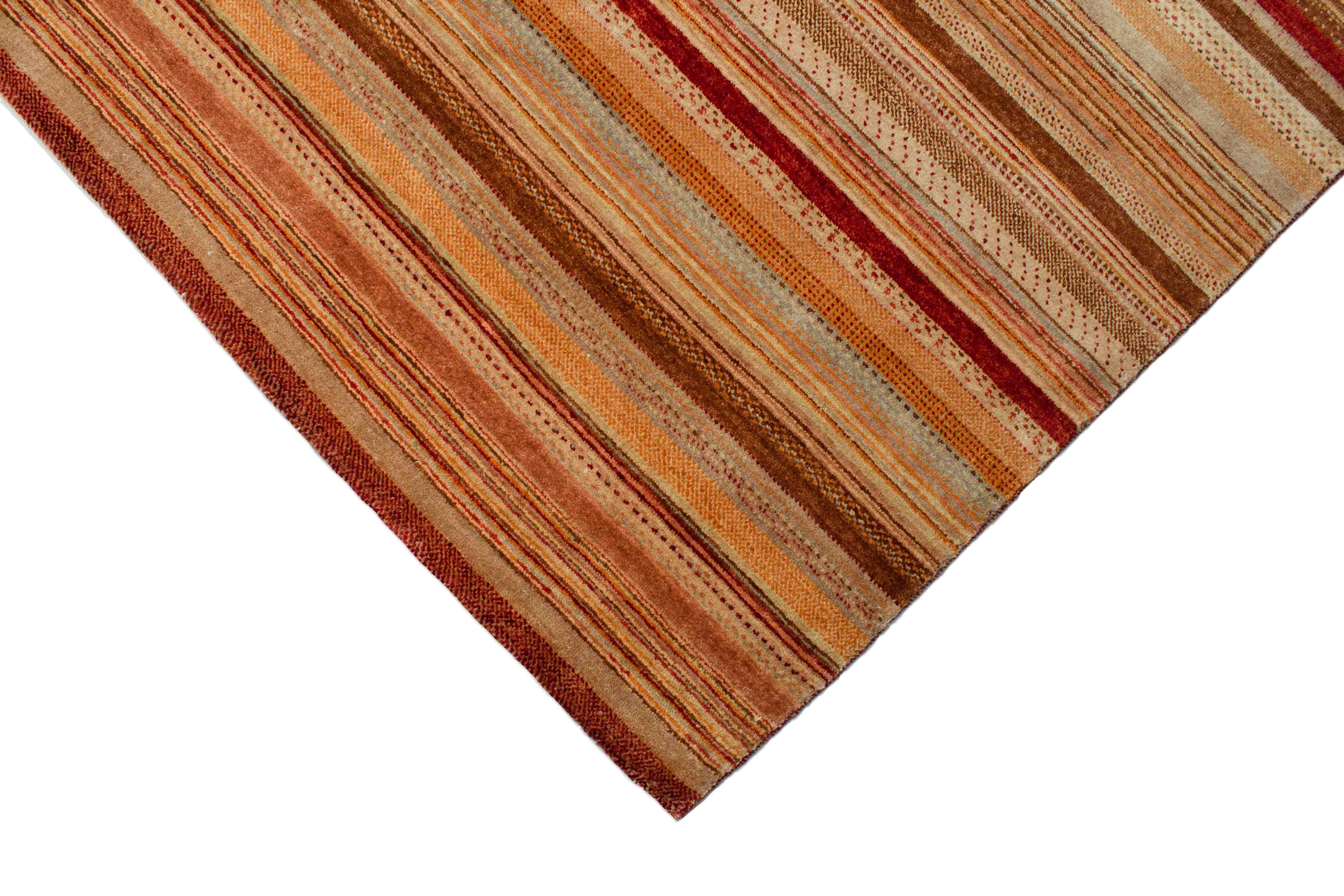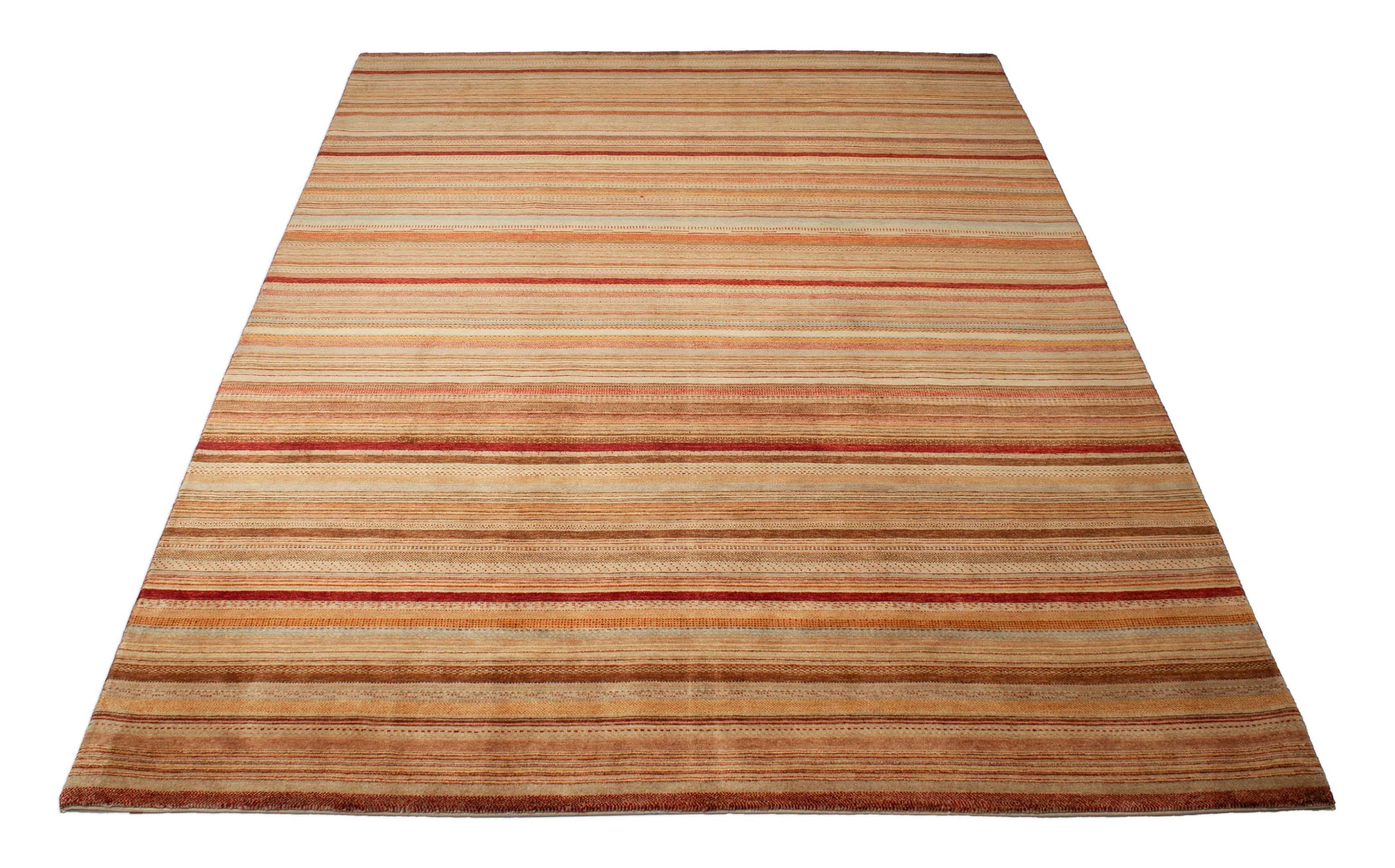 Le motif de ce tapis incarne des bandes croisées et des profils de couleur qui sont maintenus dans des tons de terre de rouge rouillé à jaune. Le motif rappelle le design de bande typique de la compagnie de mode italienne Missoni.