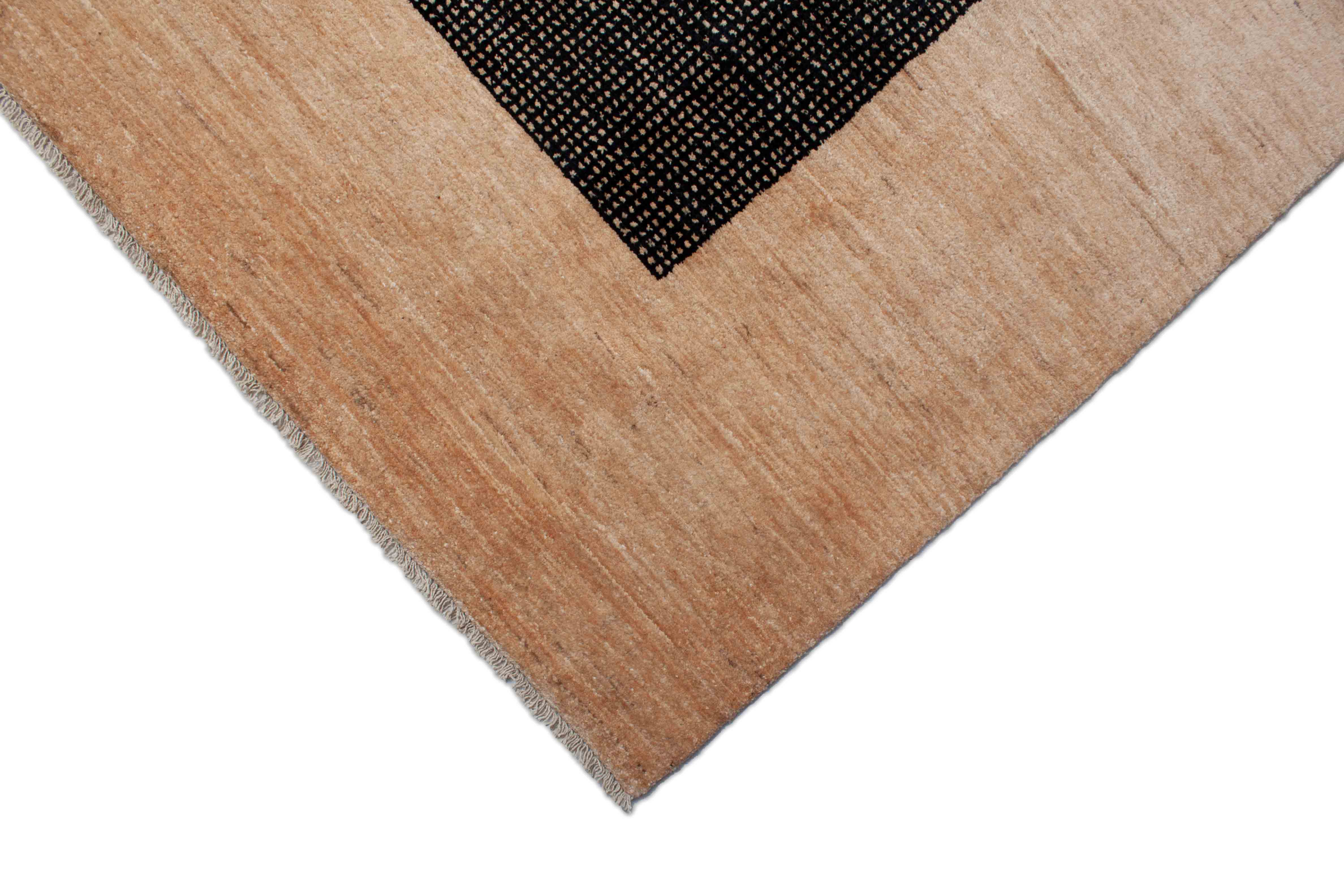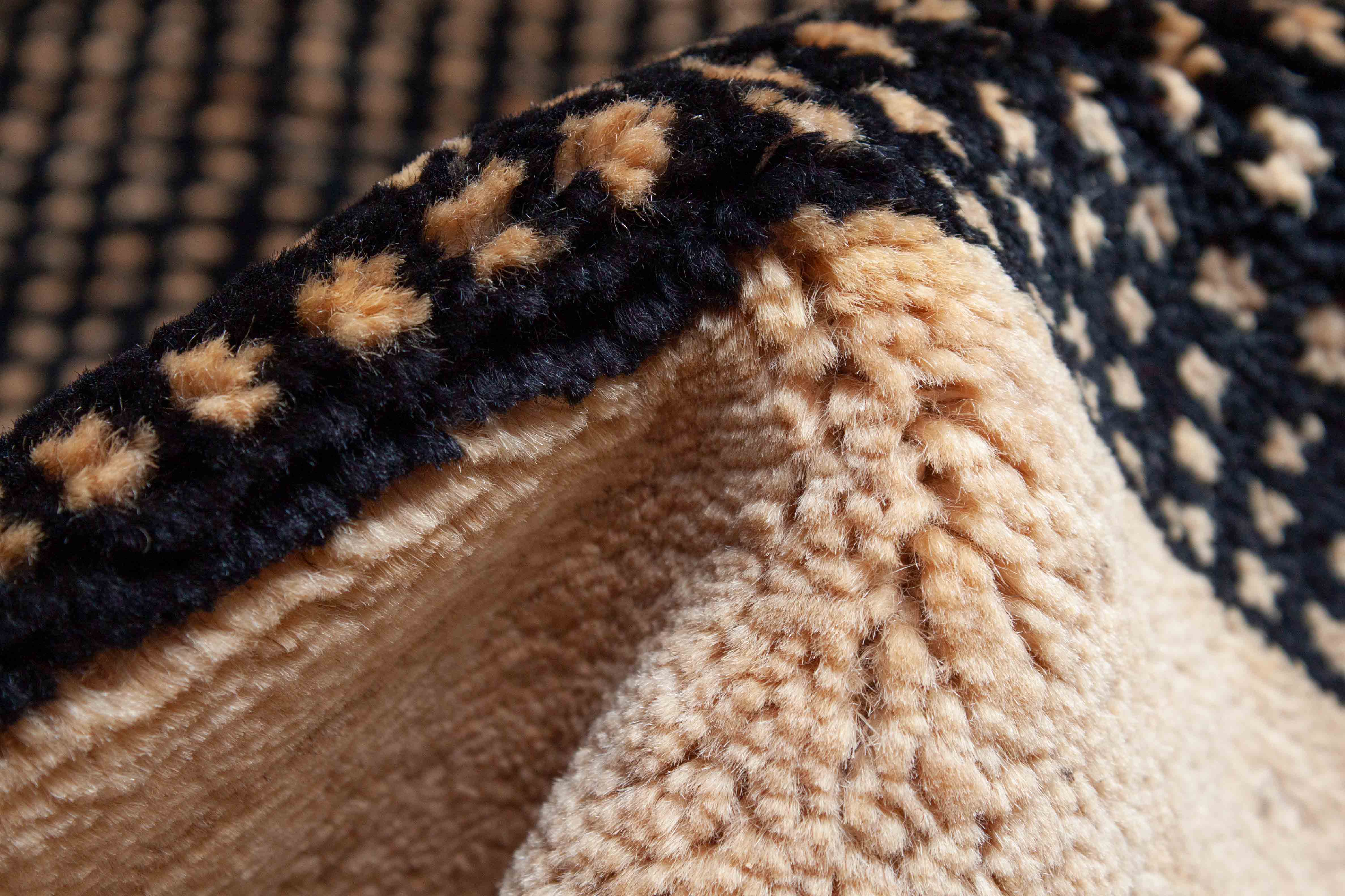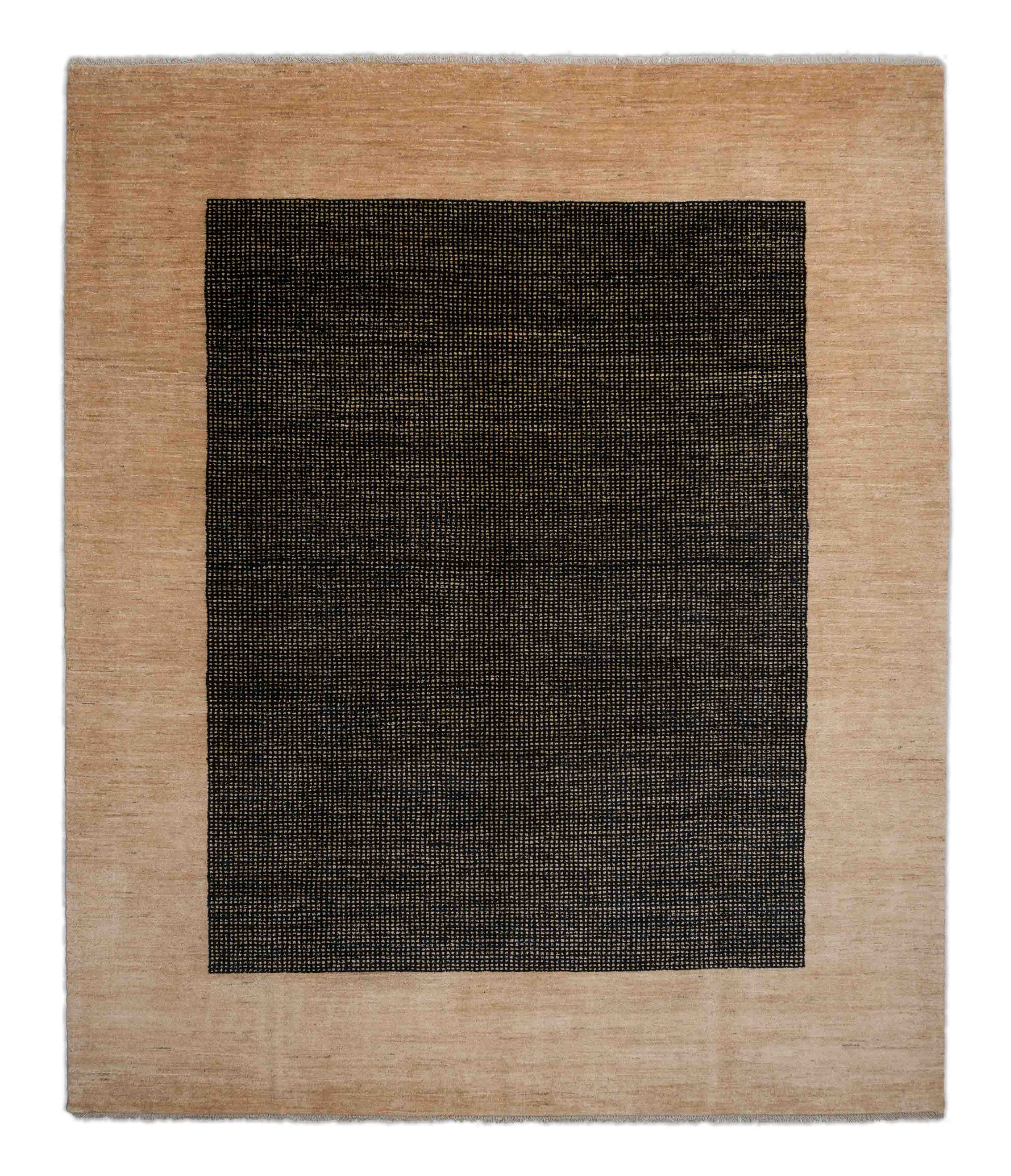 Le champ noir monochrome est Border encadré en beige. Cela donne la profondeur du tapis malgré son design relativement simple.