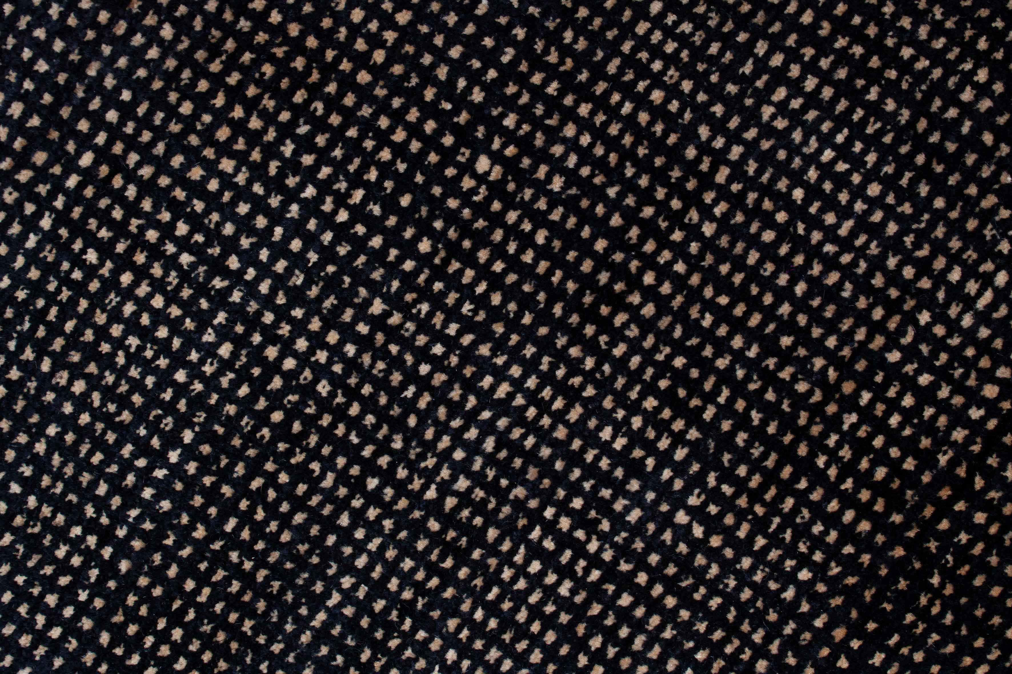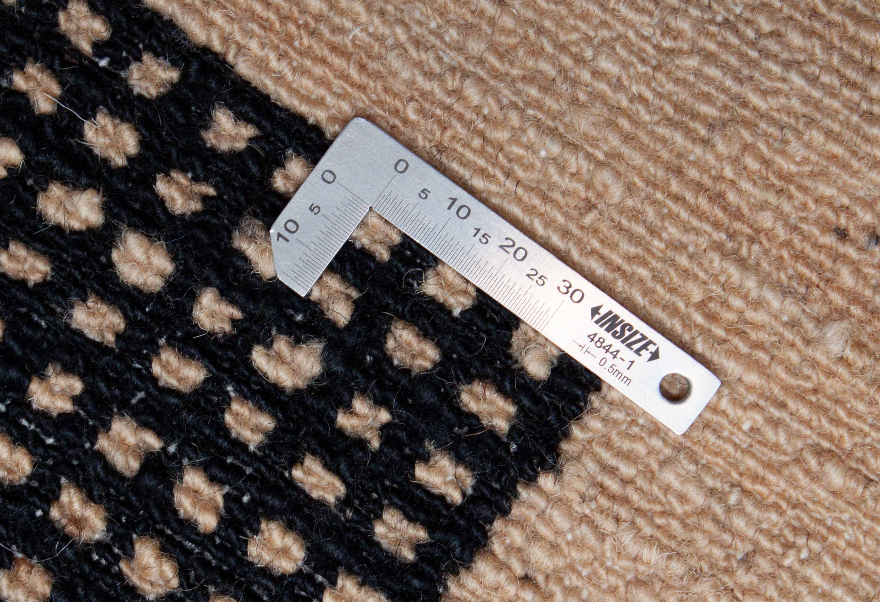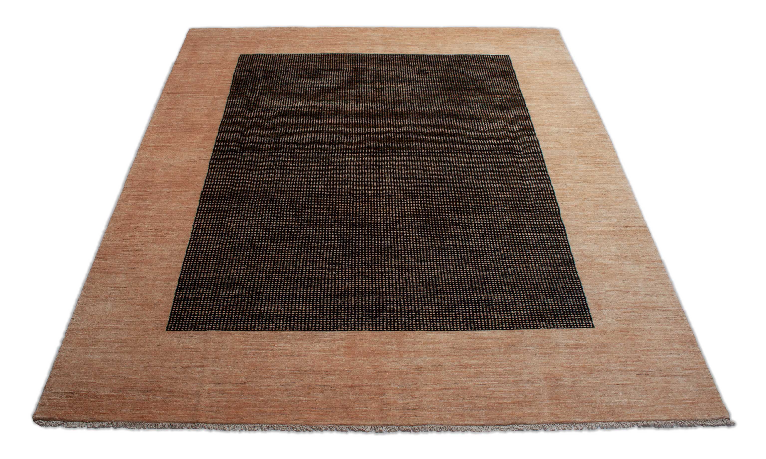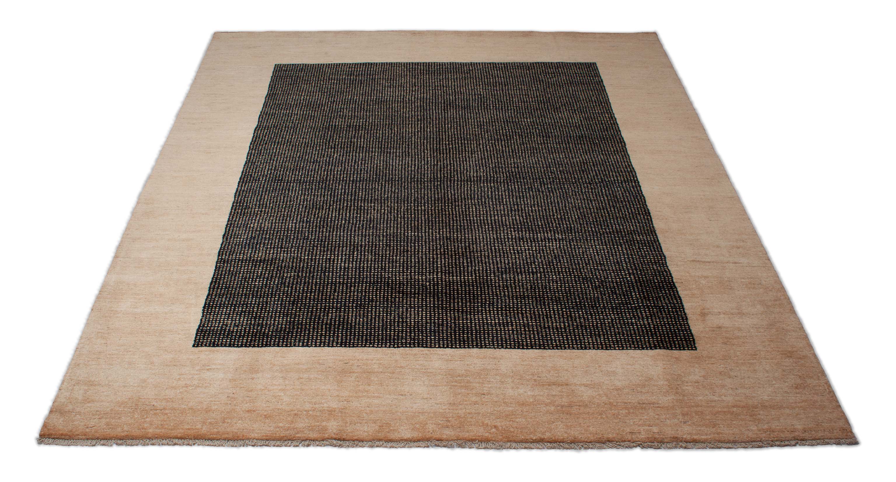 Le champ noir monochrome est Border encadré en beige. Cela donne la profondeur du tapis malgré son design relativement simple.