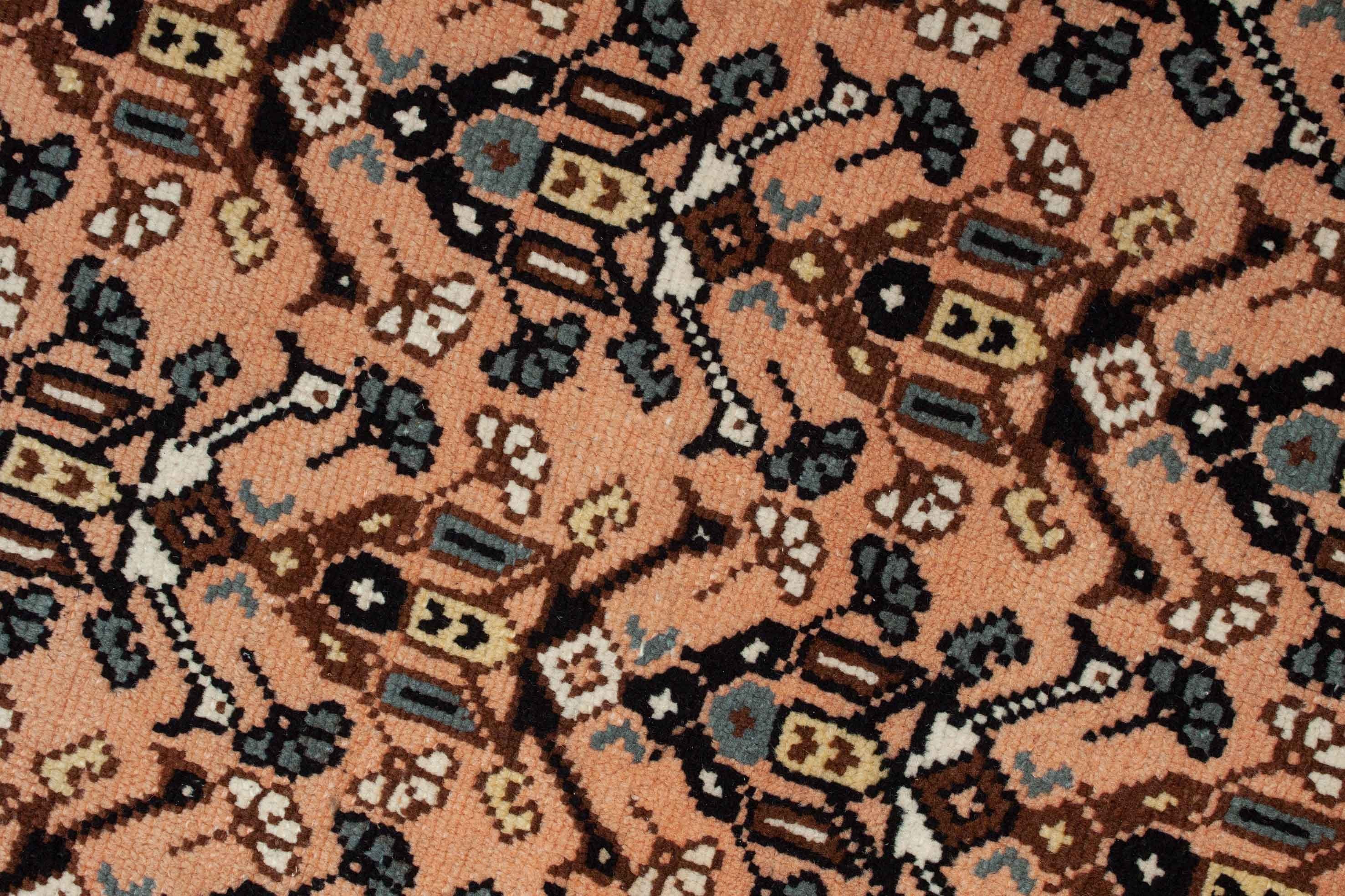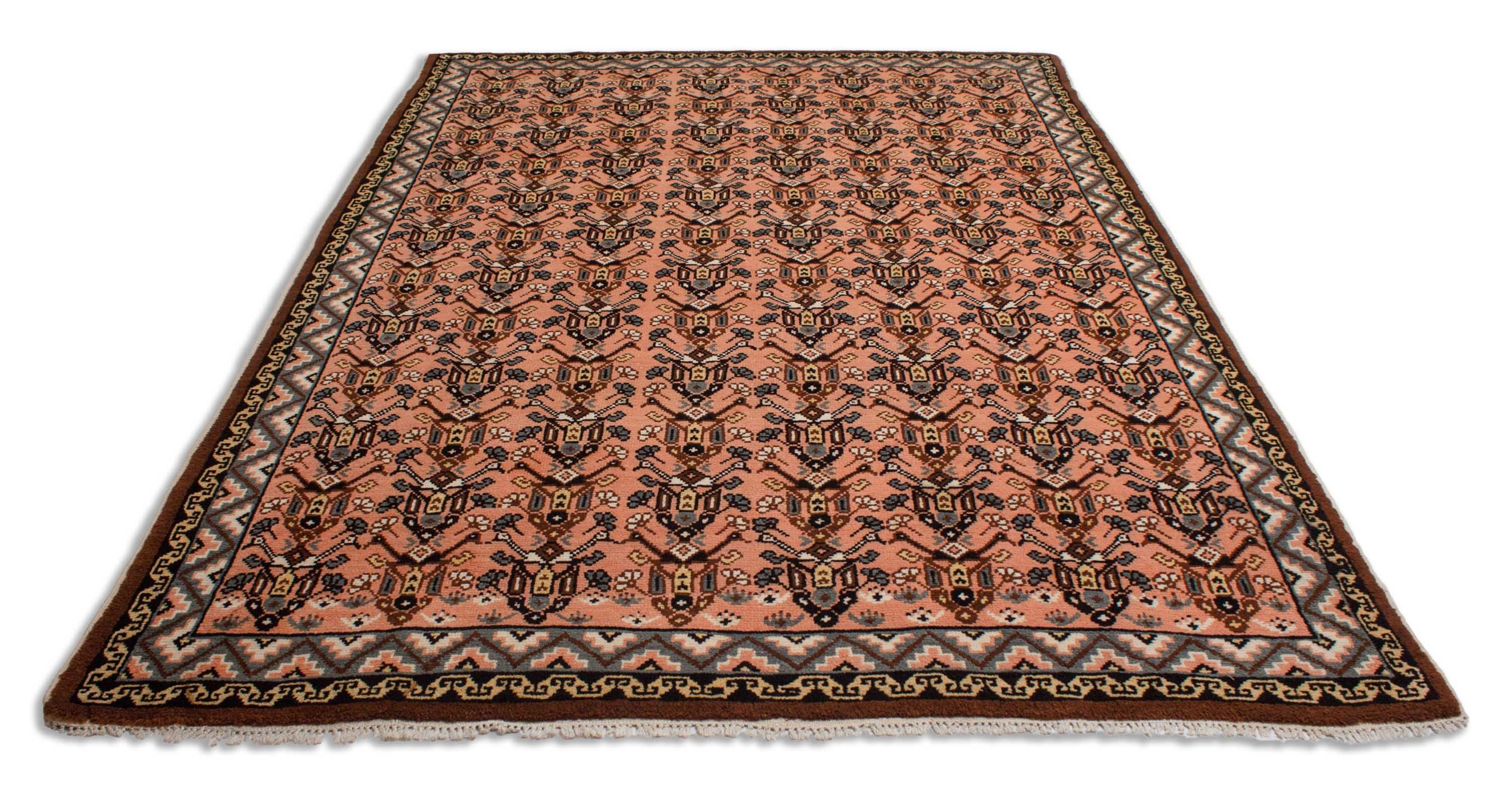 L'arrière-plan de ce tapis oriental marocain est Altrosa. Le bord est conçu dans les couleurs bleu foncé, gris bleu et bleu foncé.