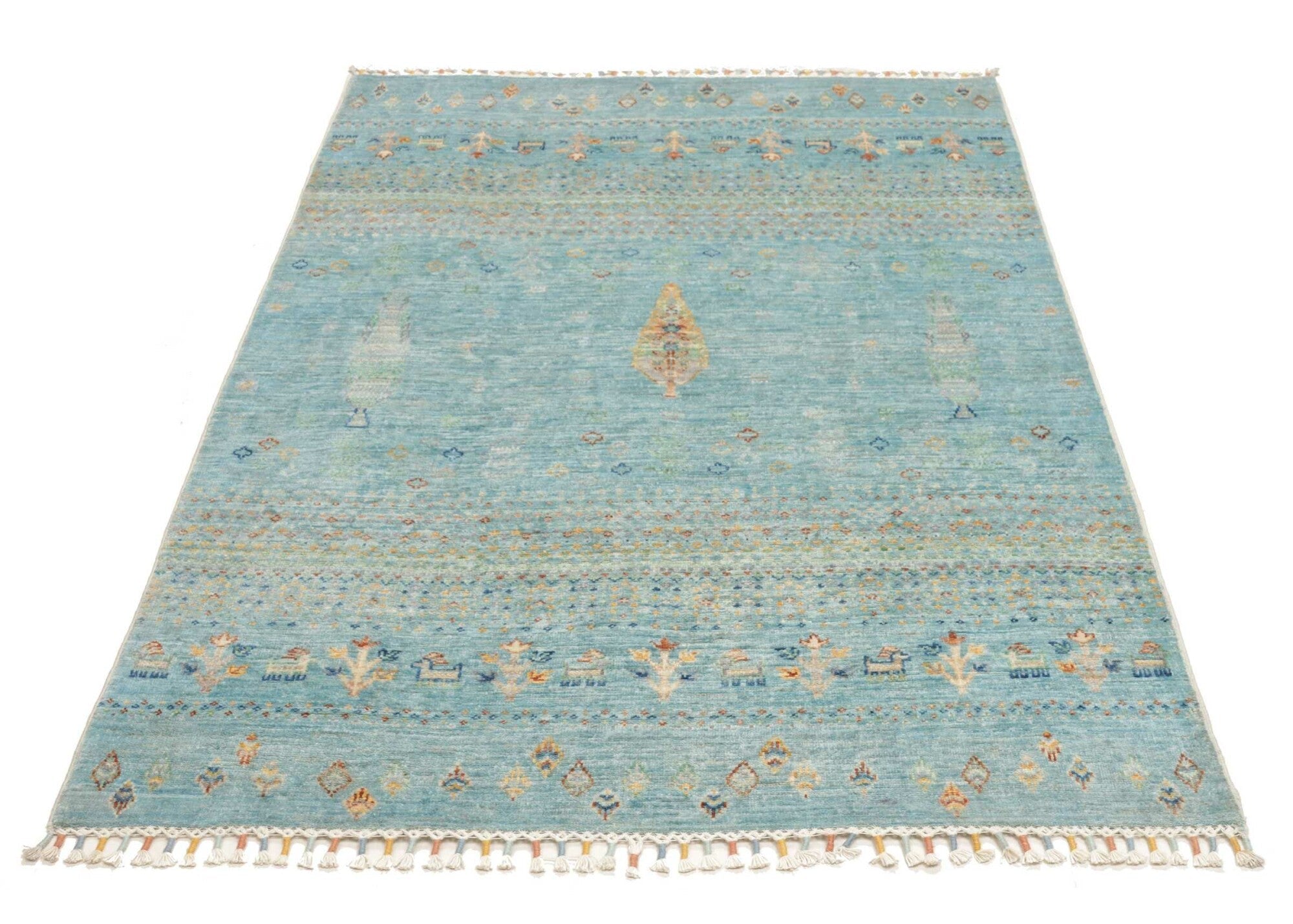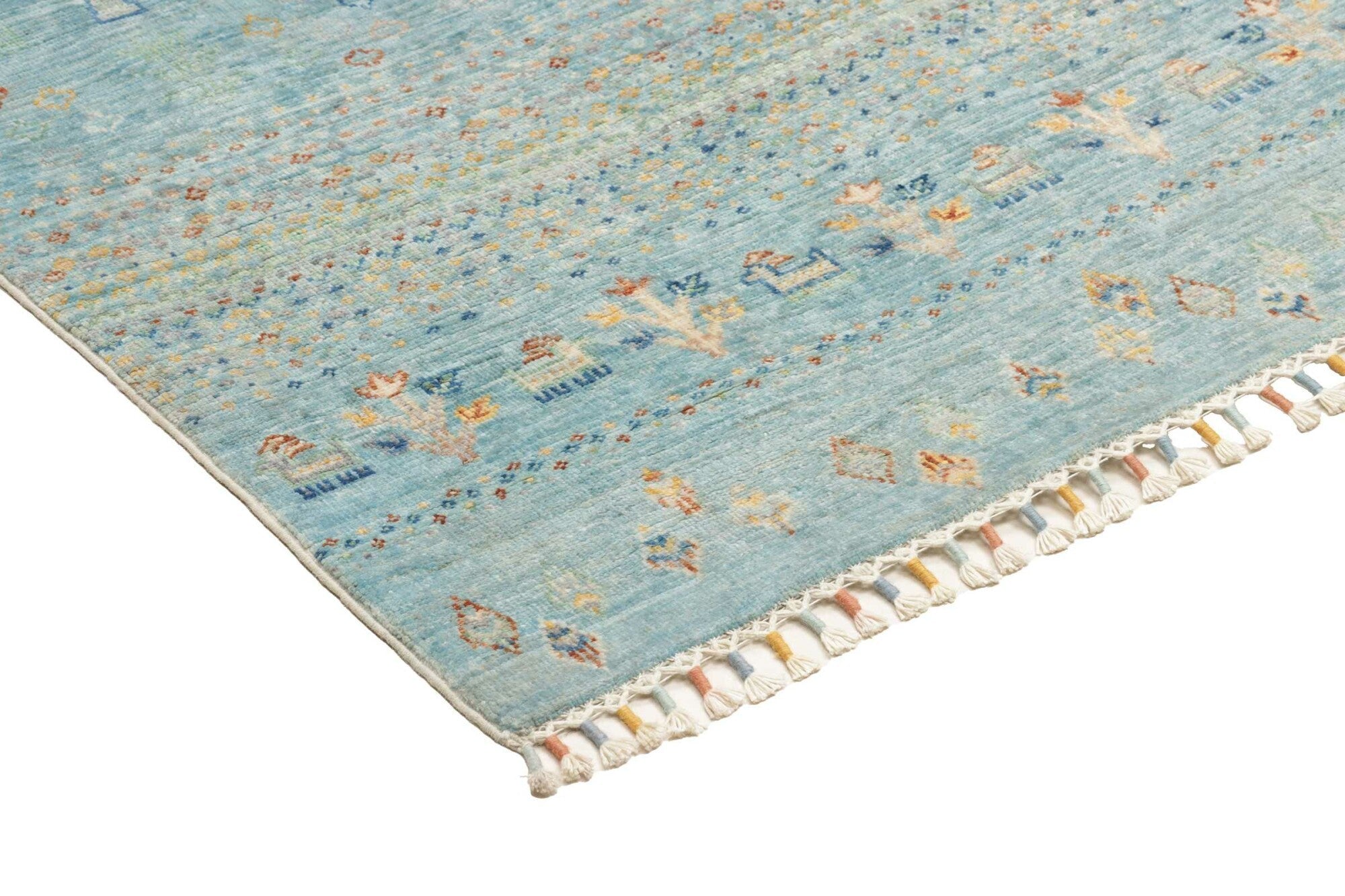Das Muster dieses handgeknüpften Oxiana Teppichs ist angelehnt an die traditionellen, usbekischen Muster. Ursprünglich wurde vor allem in der Region um Samarkand und Oxiana Teppiche mit einem ähnlichen Muster geknüpft. Unsere Oxiana Teppiche sind auf den zeitgenössischen Geschmack abgestimmt: Harmonische Farbkompositionen aus Naturfarben schmeicheln dem traditionellen Muster. Die Oxiana Teppiche zieren farbenfrohe Querstreifen, die sich mit phantasievoll gemusterten Bereichen abwechseln. Die gemusterten Teile zeigen geometrische Kompositionen, die an ein Kazak Muster erinnern. Charakteristisch ist außerdem, dass die Fransen in kleinen Bündeln zusammengefasst und mit verschiedenfarbigen Fäden umwickelt wurden.