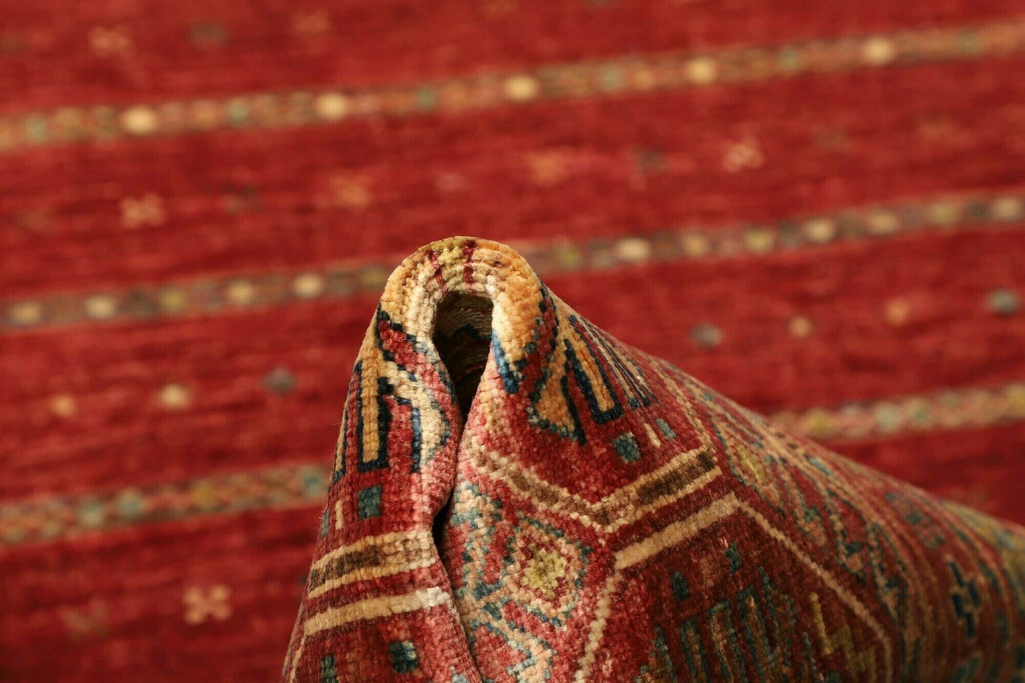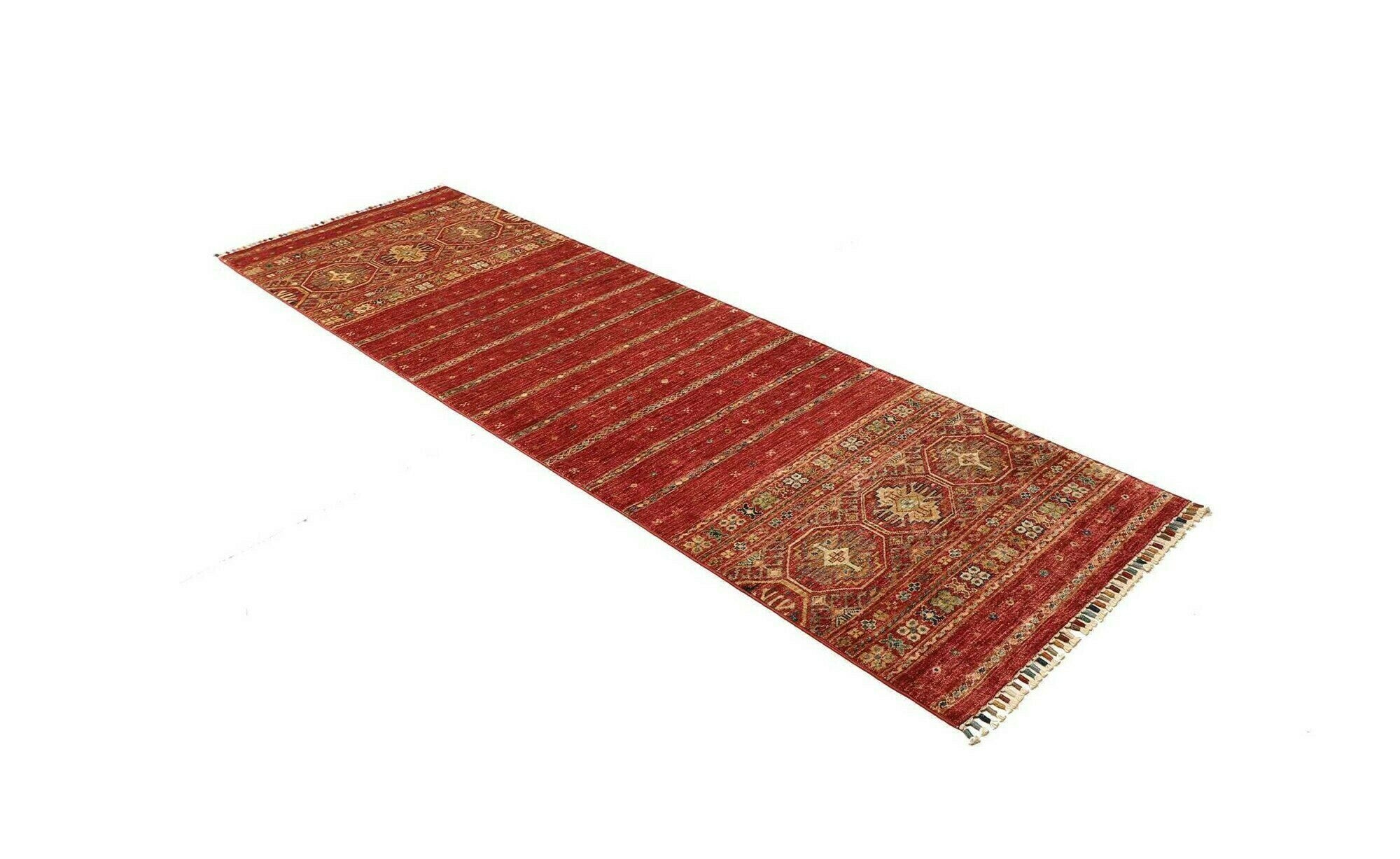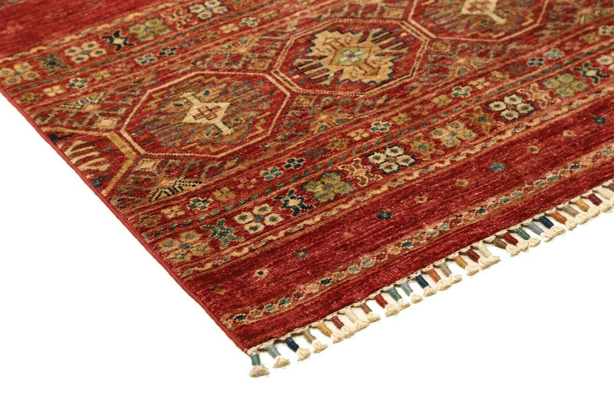 Das Muster dieses handgeknüpften Oxiana Teppichs ist angelehnt an die traditionellen, usbekischen Muster. Ursprünglich wurde vor allem in der Region um Samarkand und Oxiana Teppiche mit einem ähnlichen Muster geknüpft. Unsere Oxiana Teppiche sind auf den zeitgenössischen Geschmack abgestimmt: Harmonische Farbkompositionen aus Naturfarben schmeicheln dem traditionellen Muster. Die Oxiana Teppiche zieren farbenfrohe Querstreifen, die sich mit phantasievoll gemusterten Bereichen abwechseln. Die gemusterten Teile zeigen geometrische Kompositionen, die an ein Kazak Muster erinnern. Charakteristisch ist außerdem, dass die Fransen in kleinen Bündeln zusammengefasst und mit verschiedenfarbigen Fäden umwickelt wurden.