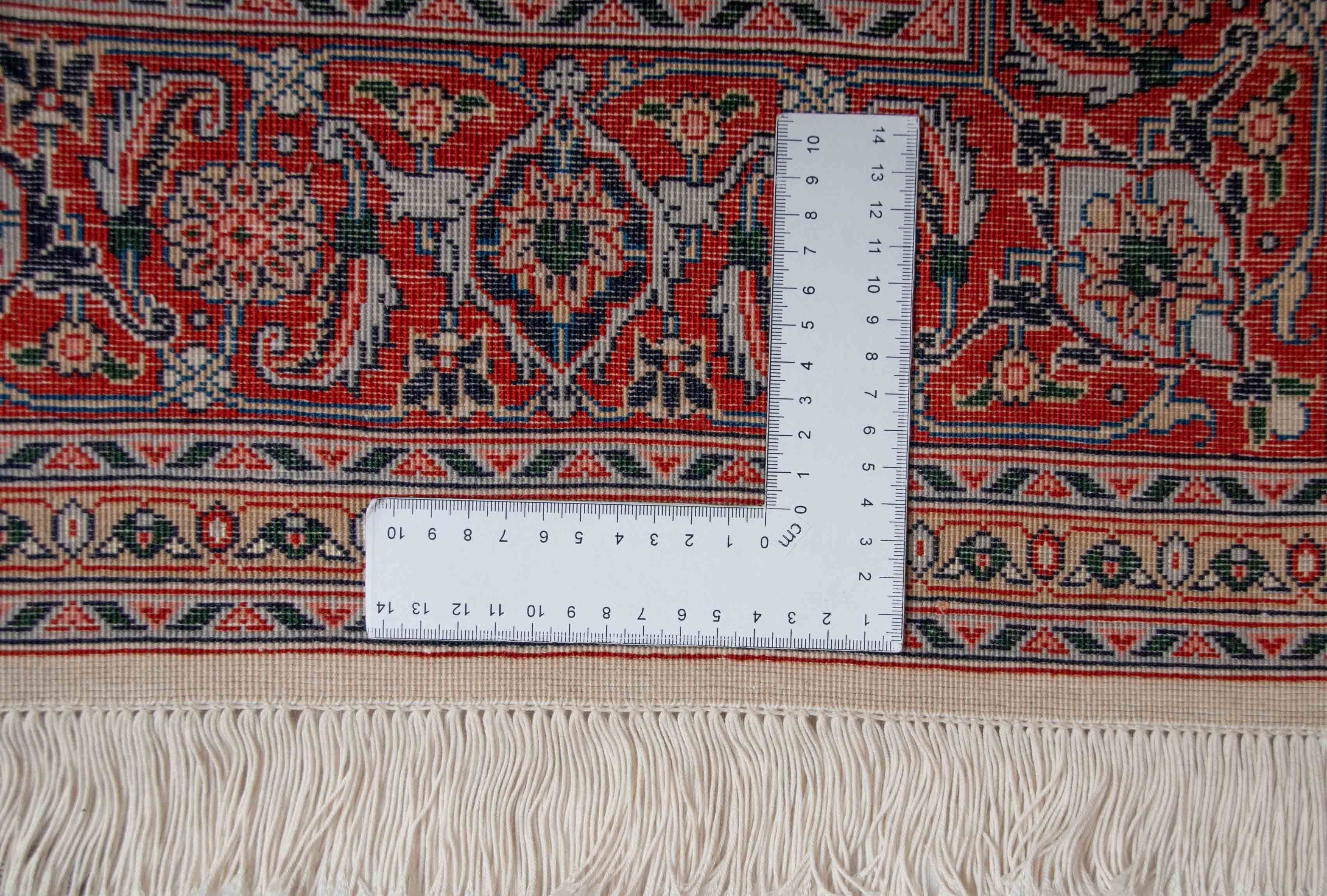 La fleur de ce Täbriz a été faite maïs et Silk fait main. La laine de cork ou de curk est un fil particulièrement fin, presque velours sensible. La laine de liège est retirée du cou, le ventre et l'intérieur des jambes des moutons et est particulièrement de haute qualité. Le motif de ce téthère est fixé avec une soie pure brillante, qui est obtenue à la main à partir des cocons de la casserole de soie. Les éléments de soie créent un contraste éclatant et laissent les couleurs briller dans différentes facettes, selon la lumière. Les fils de tissage et de distorsion de ce tissu se composent de Coton. Le matériau polyvalent est résistant à la déchirure et extensible et donc particulièrement adapté à un sous-vêtement durable.
