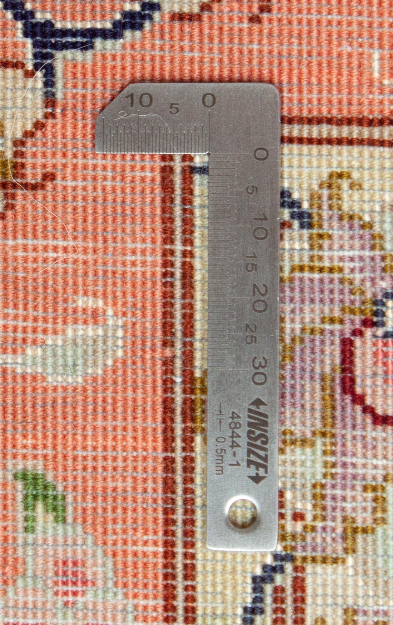 La fleur de ce Täbriz a été faite maïs et Silk fait main. La laine de cork ou de curk est un fil particulièrement fin, presque velours sensible. La laine de liège est retirée du cou, le ventre et l'intérieur des jambes des moutons et est particulièrement de haute qualité. Le motif de ce téthère est fixé avec une soie pure brillante, qui est obtenue à la main à partir des cocons de la casserole de soie. Les éléments de soie créent un contraste éclatant et laissent les couleurs briller dans différentes nuances, selon la lumière. Les fils de tissage et de distorsion de ce tissu se composent de Coton. Le matériau polyvalent est résistant à la déchirure et extensible et donc particulièrement adapté à un sous-vêtement durable.