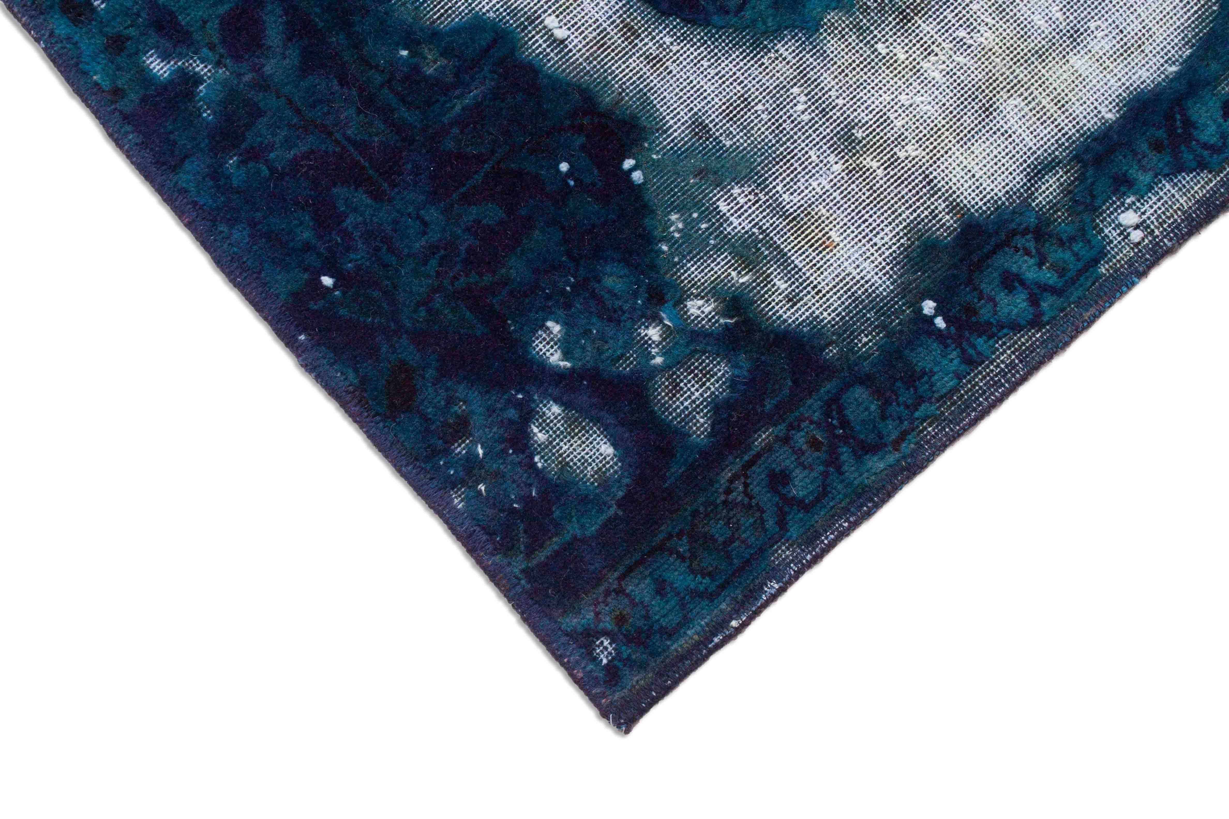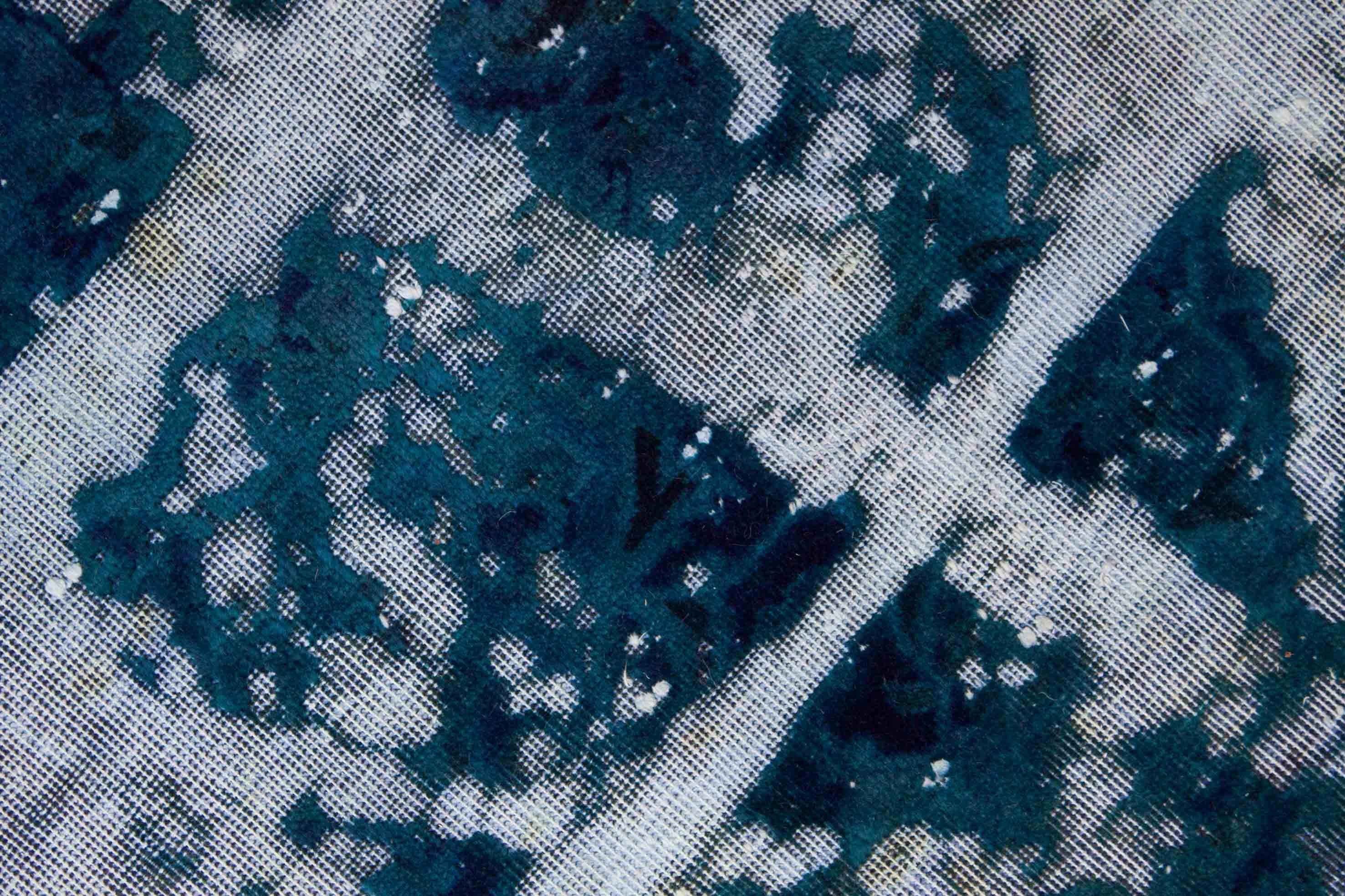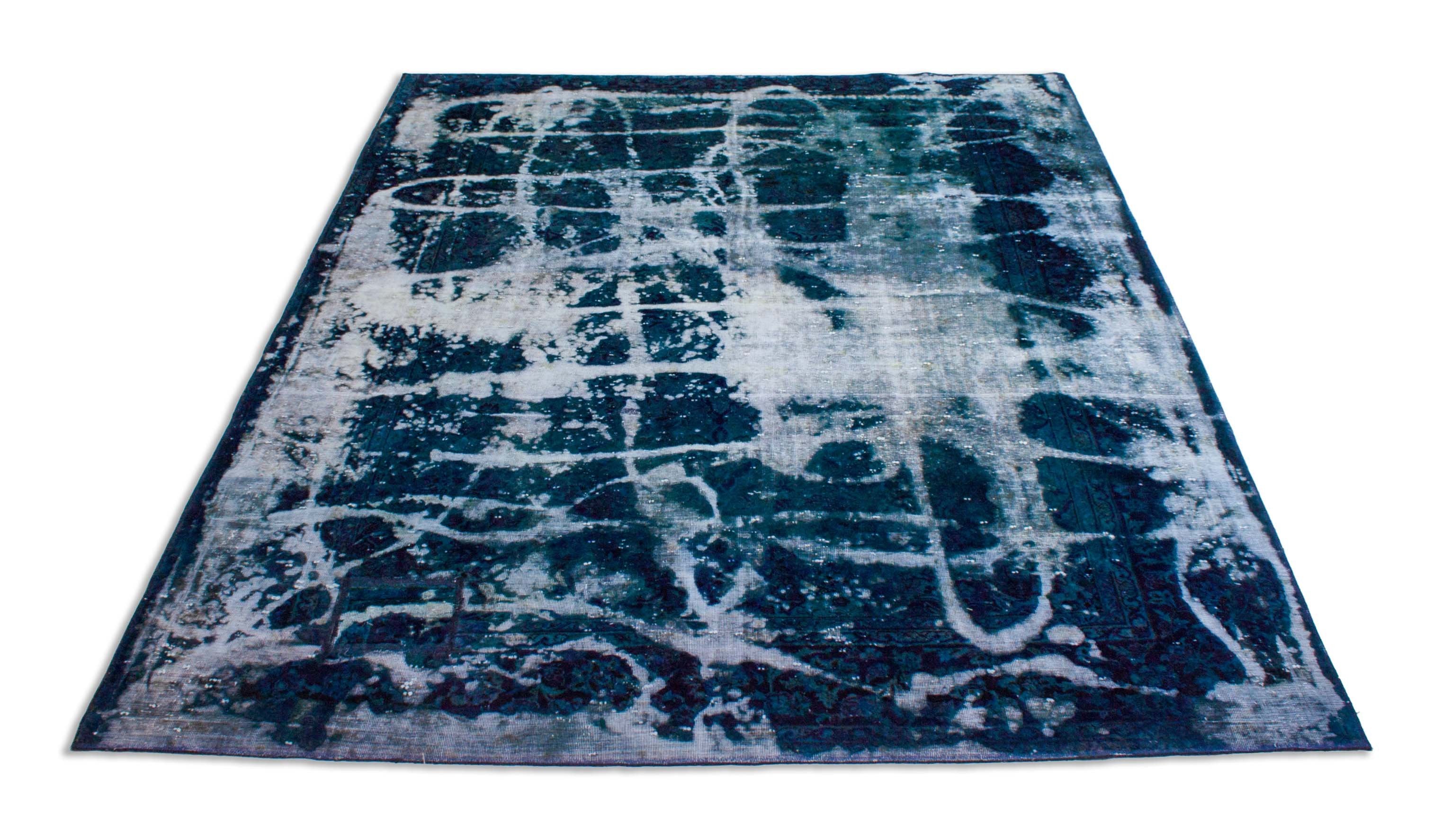 Certains de nos vieux tapis orientaux donnent un aspect plus moderne à travers une procédure élaborée. Ces tapis qu'on appelle Vintage Carpets. Vintage Carpets sont des objets design où l'artisanat traditionnel rencontre l'ameublement contemporain. La nouvelle coloration donne aux modèles traditionnels des tapis orientaux un caractère intemporel. Les tapis, qui ne sont plus dans la tendance en raison de leur coloration, deviendront une telle Second life dans une robe plus moderne. L'utilisation de vieux tapis comme matière première pour les nouveaux produits est économies de ressources et durables. Cette pièce est une vraie, mais était un Perse classique. Au plus tard, c'est un vrai eye-catcher ! Le tapis a été décoloré et coloré bleu dans Navi. En outre, le Flor a été enlevé à de grandes parties de sorte que seulement dans certains endroits le modèle classique, oriental reste à voir. Cette œuvre abstraite, allie classique et moderne et le eye-catcher parfait pour votre décor !