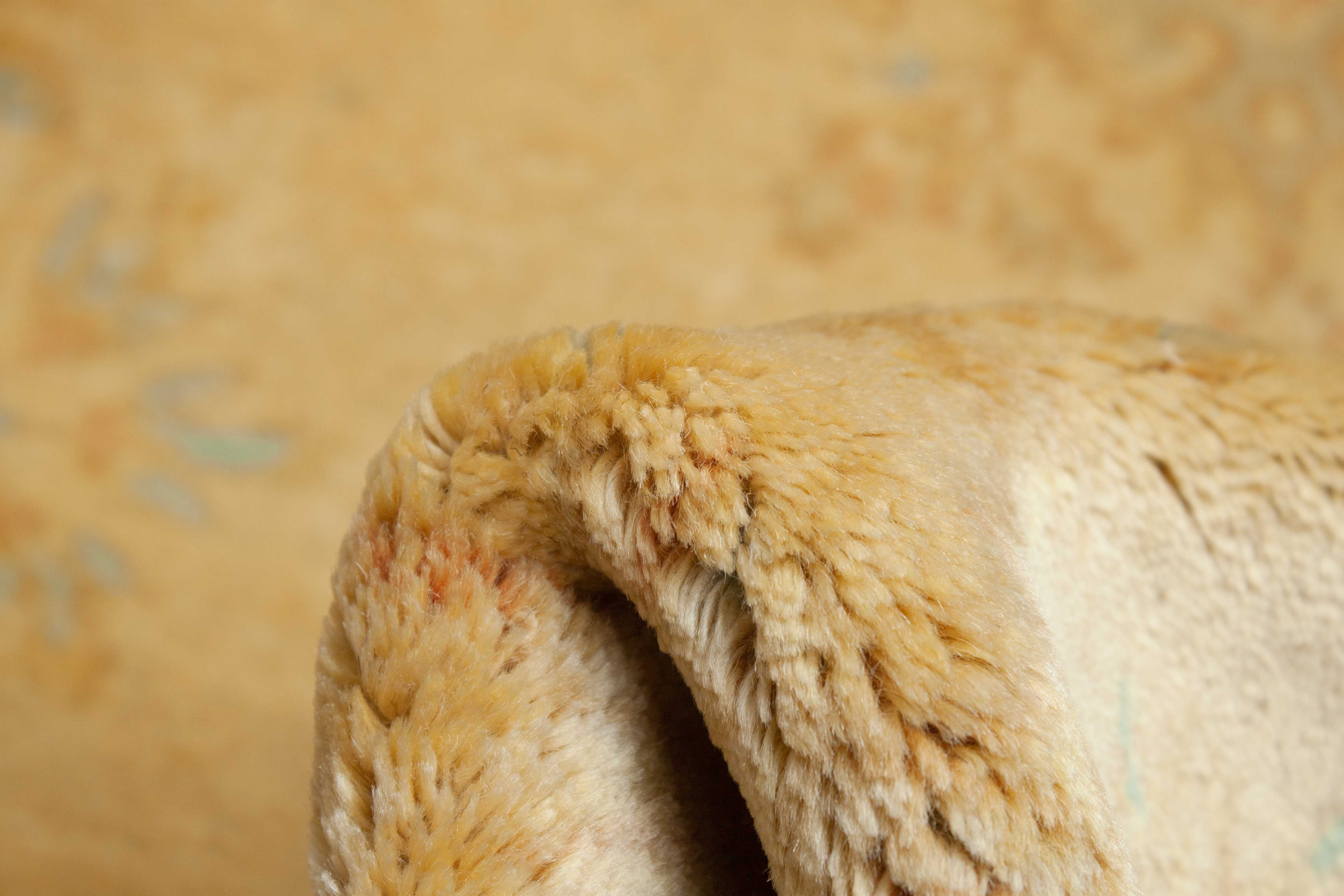 L'arrière-plan de ce Yazd est l'or. Le bord est tenu en or. Dans le centre brun clair, les couleurs turquoise et le beige gris sont combinées.