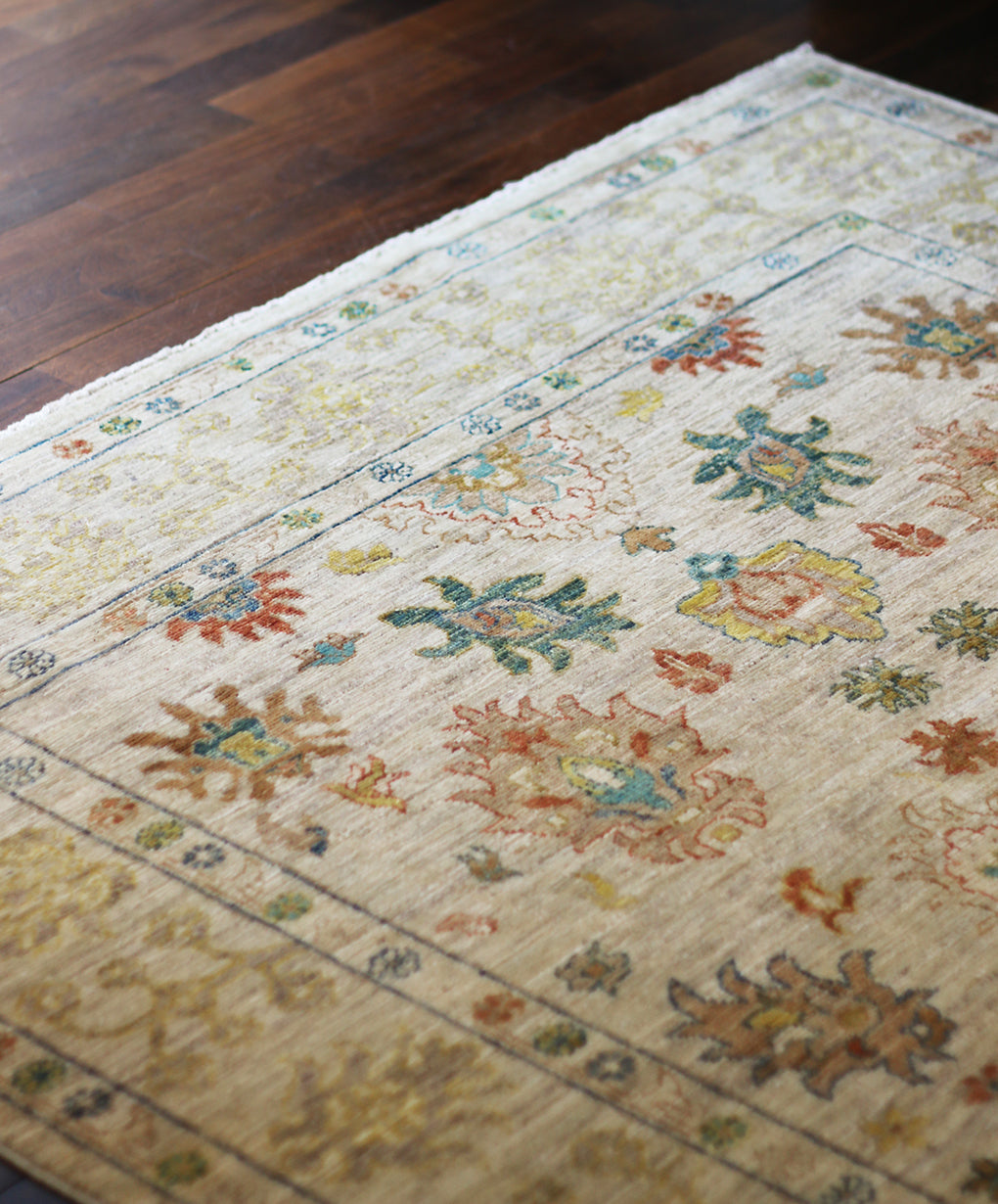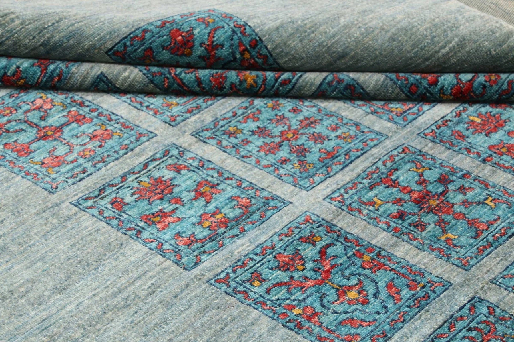 Das Muster der handgeknüpften Oxiana Teppiche ist angelehnt an die traditionellen, usbekischen Muster. Ursprünglich wurde vor allem in der Region um Samarkand und Oxiana Teppiche mit einem ähnlichen Muster geknüpft. Unsere Oxiana Teppiche sind auf den zeitgenössischen Geschmack abgestimmt: Harmonische Farbkompositionen aus Naturfarben schmeicheln dem traditionellen Muster. Die Oxiana Teppiche zieren farbenfrohe Querstreifen, die sich mit phantasievoll gemusterten Bereichen abwechseln. Die gemusterten Teile zeigen geometrische Kompositionen, die an ein Kazak Muster erinnern. Charakteristisch ist außerdem, dass die Fransen in kleinen Bündeln zusammengefasst und mit verschiedenfarbigen Fäden umwickelt wurden.