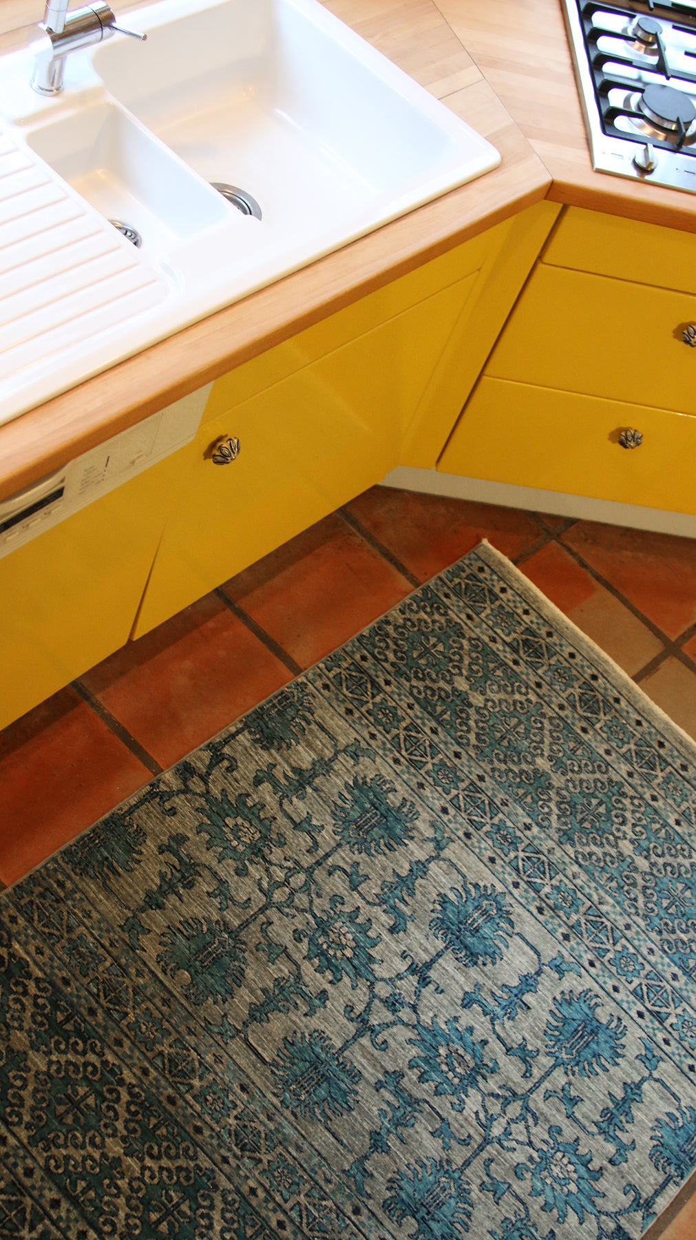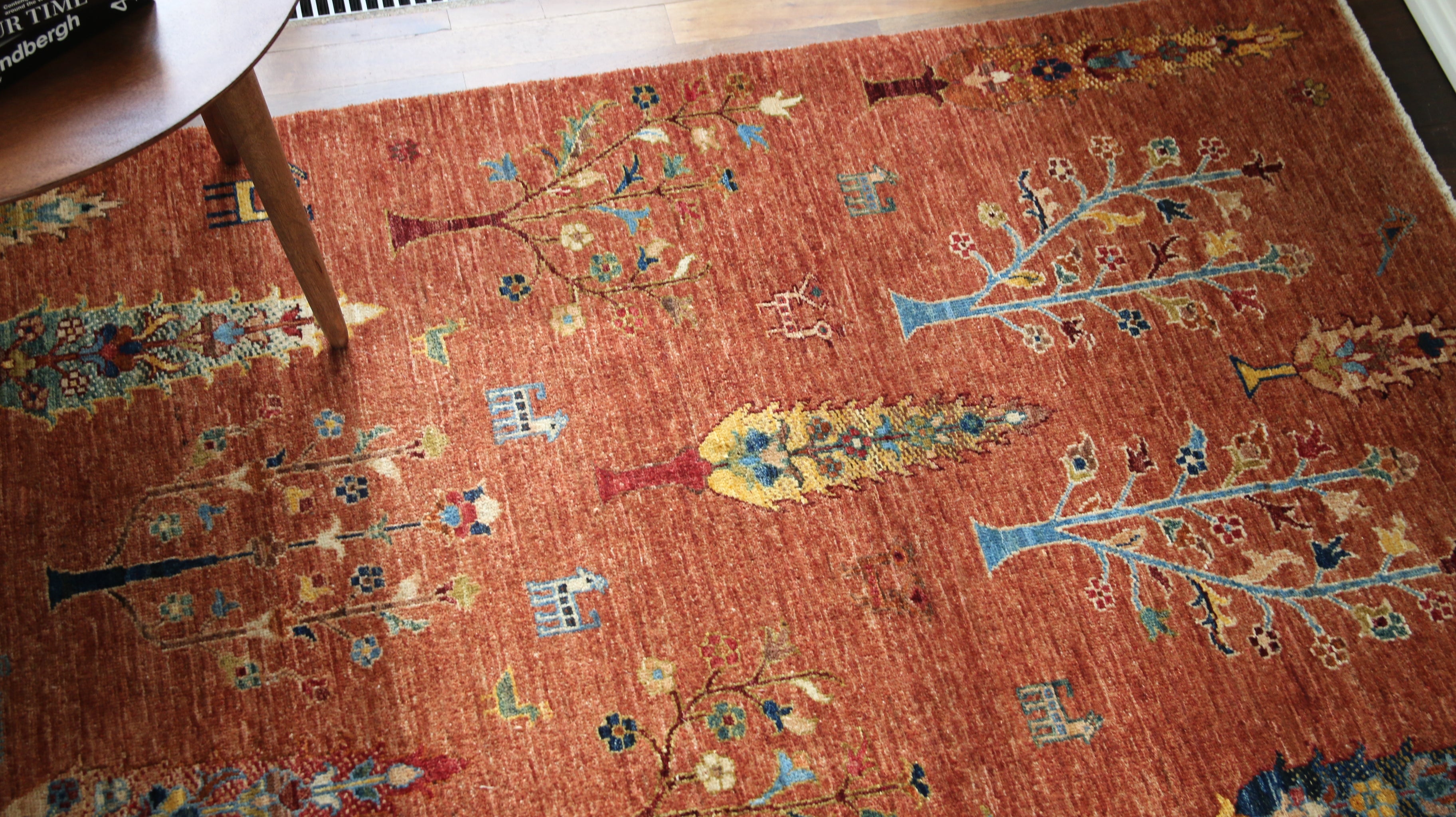 Die Tuja Teppiche zieren Elemente des Lebensbaums. Wir haben zwei Varianten Tuja Motivs entwickelt: Bei einer Variante wirken verschiedene Tuja-Motive wie zufällig auf dem Teppich verteilt. Bei der anderen Variante sind einzelne Ranken und Blätter in längst verlaufenden verschiedenfarbigen Streifen angeordnet, die von einer monochromen Bordüre umrandet sind. Dabei sind unsere Tuja Teppiche sind auf den zeitgenössischen Geschmack abgestimmt: Harmonische Farbkompositionen aus Naturfarben schmeicheln den Variationen des traditionellen Musters. Charakteristisch ist außerdem, dass die Fransen – wie bei unseren Oxiana Teppichen – in kleinen Bündeln zusammengefasst und mit verschiedenfarbigen Fäden umwickelt wurden.