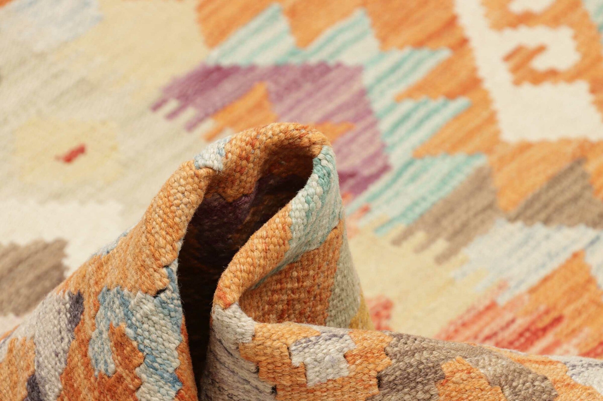 Die Schuss-Fäden dieses Kelim Teppichs bestehen aus handgesponnener, mit Pflanzenfarben gefärbter Schafwolle. Vor dem Weben des Teppichs wurden dafür zunächst Schafe geschoren und die Wolle anschließend gereinigt, gekämmt und schließlich gesponnen. Nach dem Spinnen wird die Wolle der Kelim Teppiche in einem aufwendigen Prozess mit Naturfarben gefärbt. Der Flor der Kelim Teppiche wirkt wegen dieses traditionellen Verfahrens trocken und leicht pelzig. Die Kett-Fäden dieses Kelims bestehen aus Wolle.