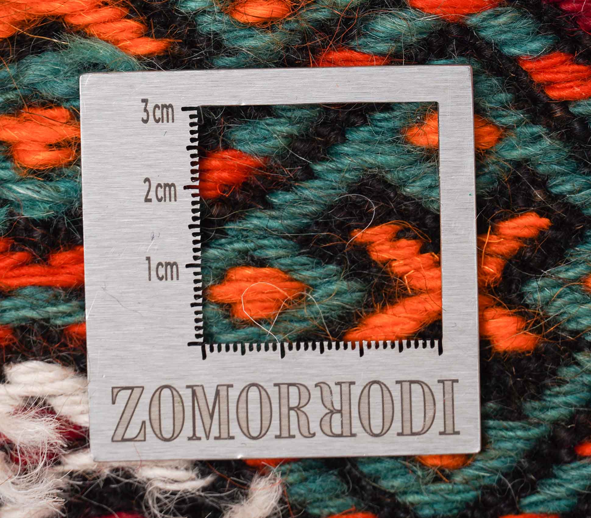 Im Muster dieses Kelim-Beutels stechen insbesondere die Rauten hervor. Rauten sind ein auf einer Spitze stehender Rhombus, dessen vier gleiche Seiten im Orientteppich gezackt, abgesteppt oder mit Haken besetzt sein können. Die Raute gehört zu den ältesten Grundformen im Orientteppich. Sie hat in der islamischen Welt eine symbolischen Bedeutung: Sie versinnbildlich die Unsterblichkeit der Seele. Daher ist sie sehr häufig als Füllmotiv anzutreffen.