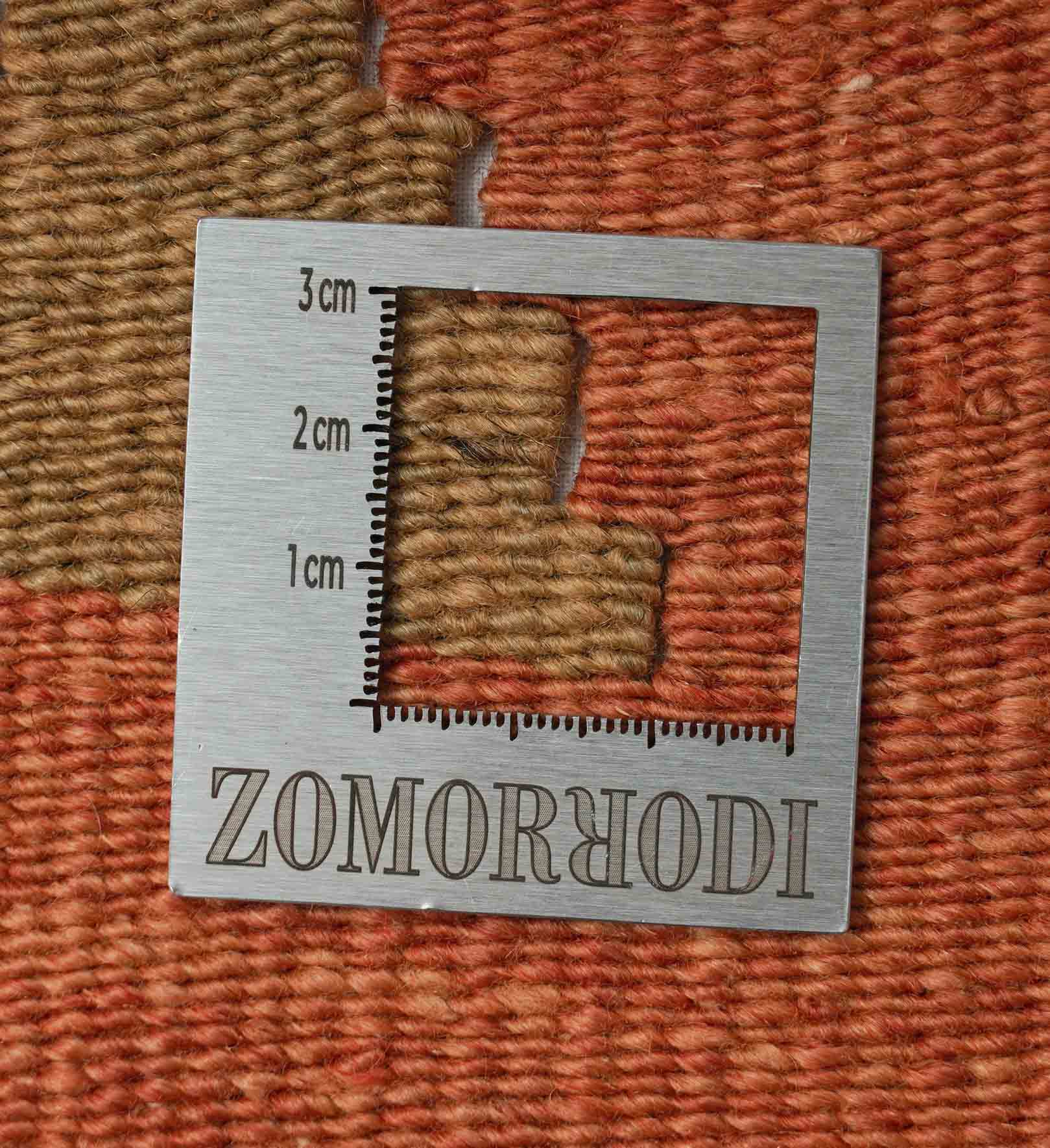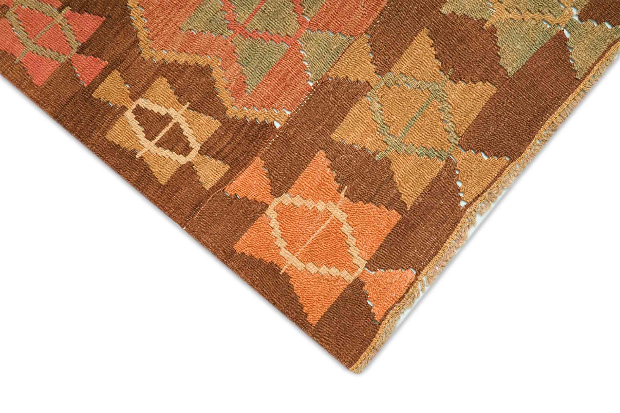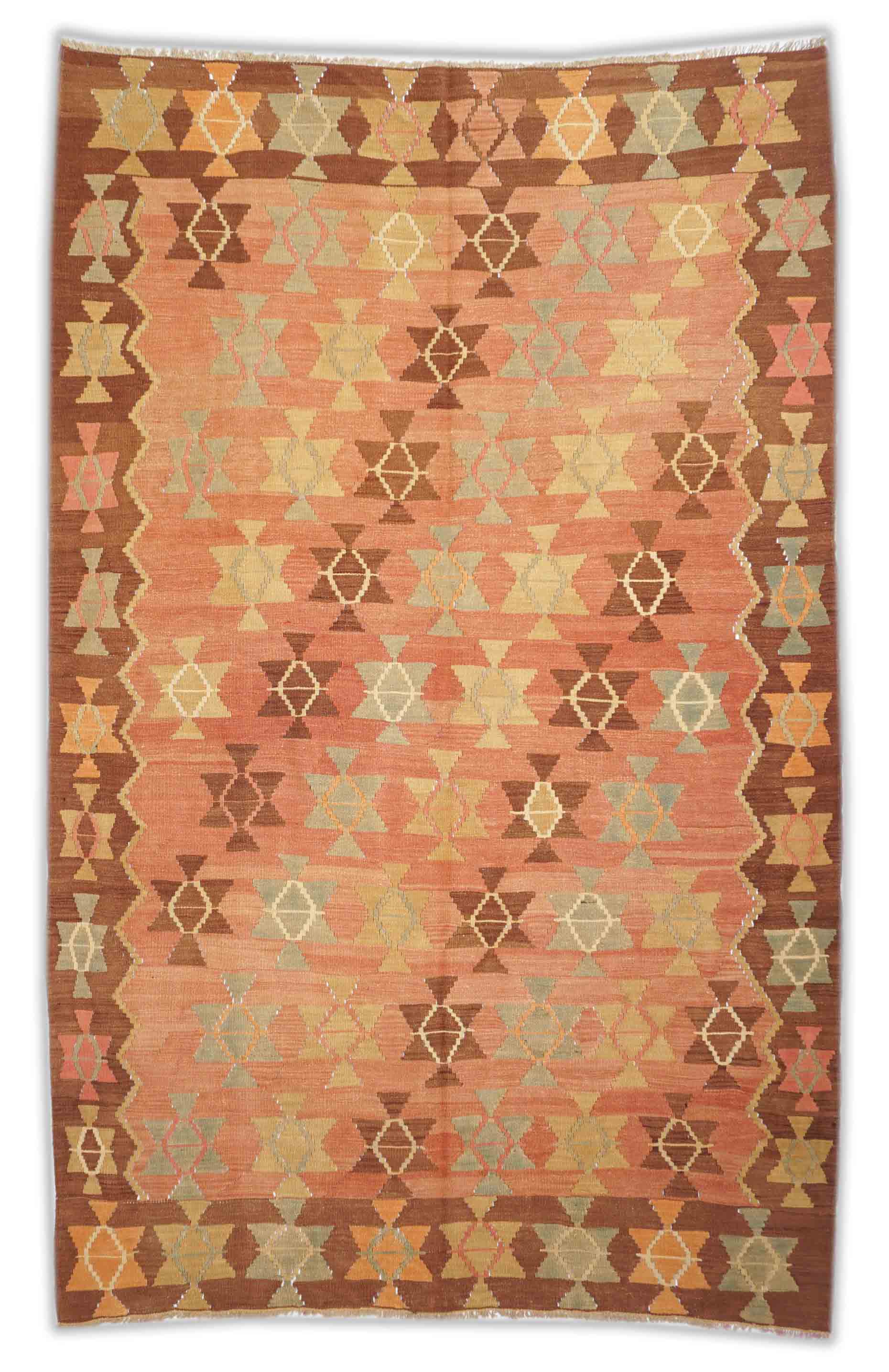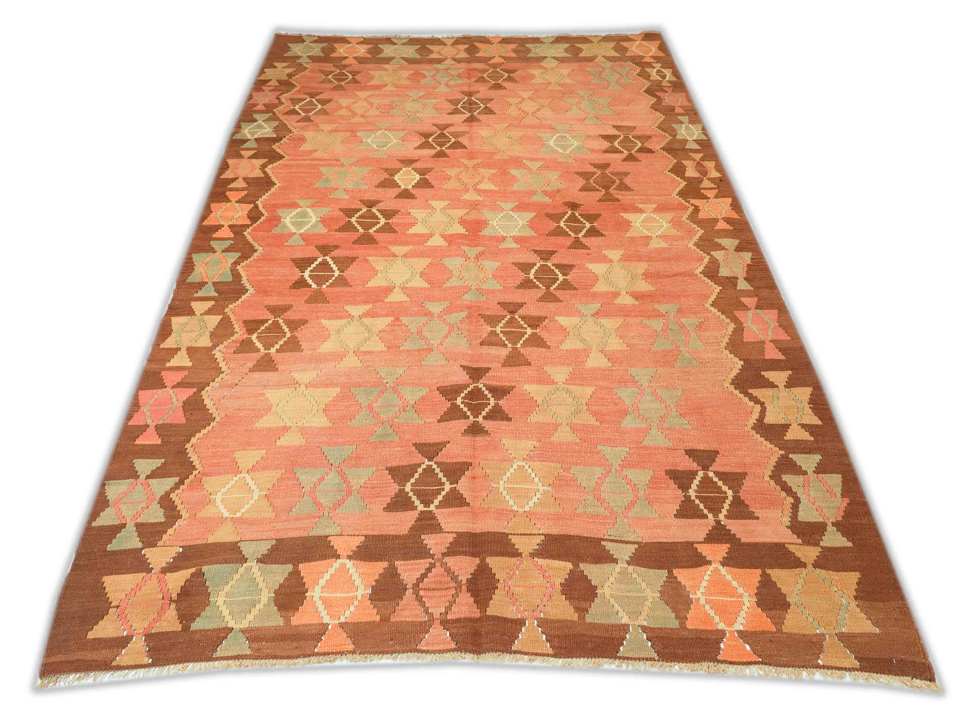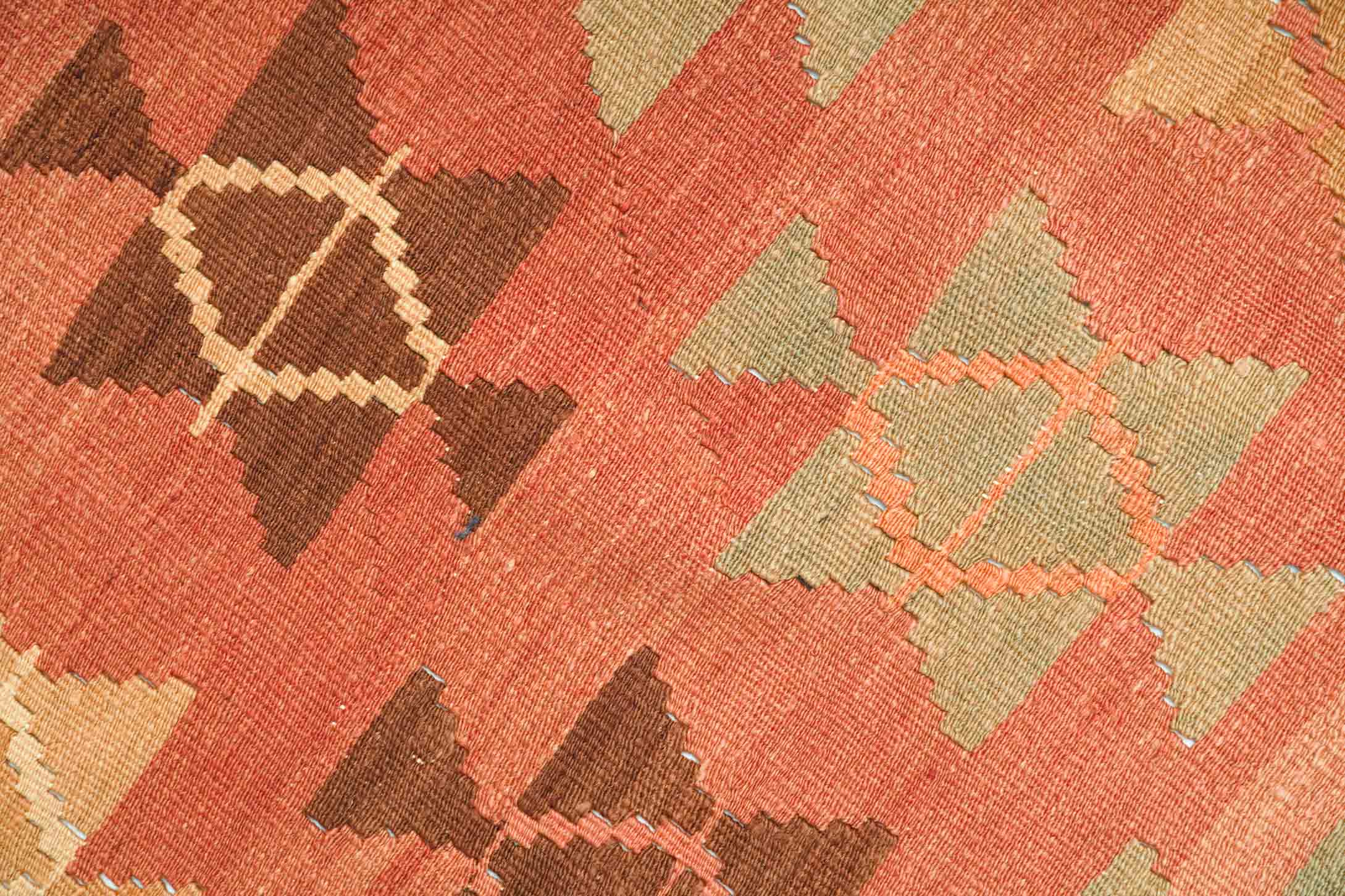 Der Hintergrund dieses Kelims ist Rostrot. Der Rand ist in den Farben Dunkelbraun, Terracotta und Hellrot gestaltet.