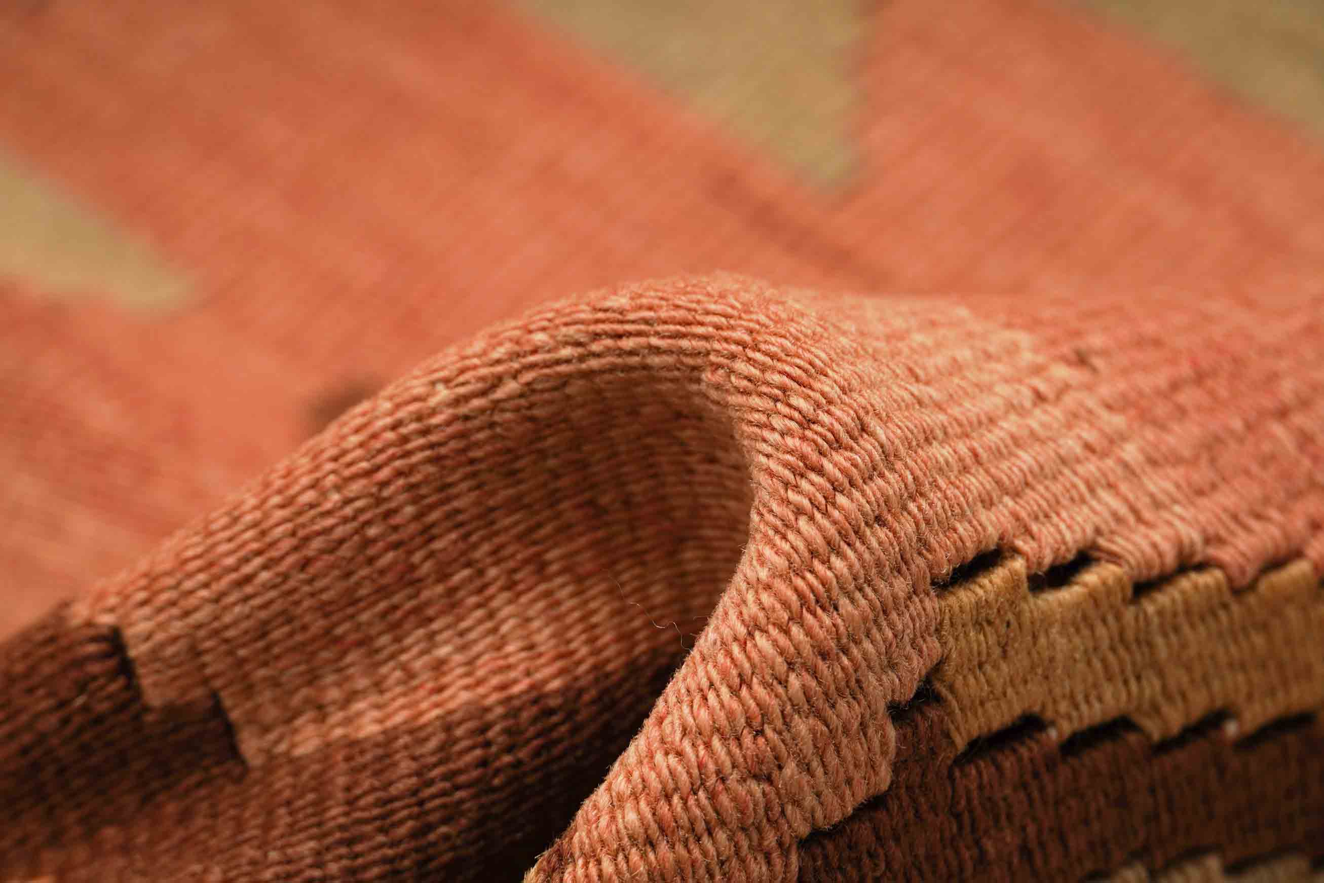 Die Schuss-Fäden dieses Kelim Teppichs bestehen aus handgesponnener, mit Pflanzenfarben gefärbter Schafwolle. Vor dem Weben des Teppichs wurden dafür zunächst Schafe geschoren und die Wolle anschließend gereinigt, gekämmt und schließlich gesponnen. Nach dem Spinnen wird die Wolle der Kelim Teppiche in einem aufwendigen Prozess mit Naturfarben gefärbt. Der Flor der Kelim Teppiche wirkt wegen dieses traditionellen Verfahrens trocken und leicht pelzig. Die Kett-Fäden dieses Kelims bestehen aus Baumwolle.