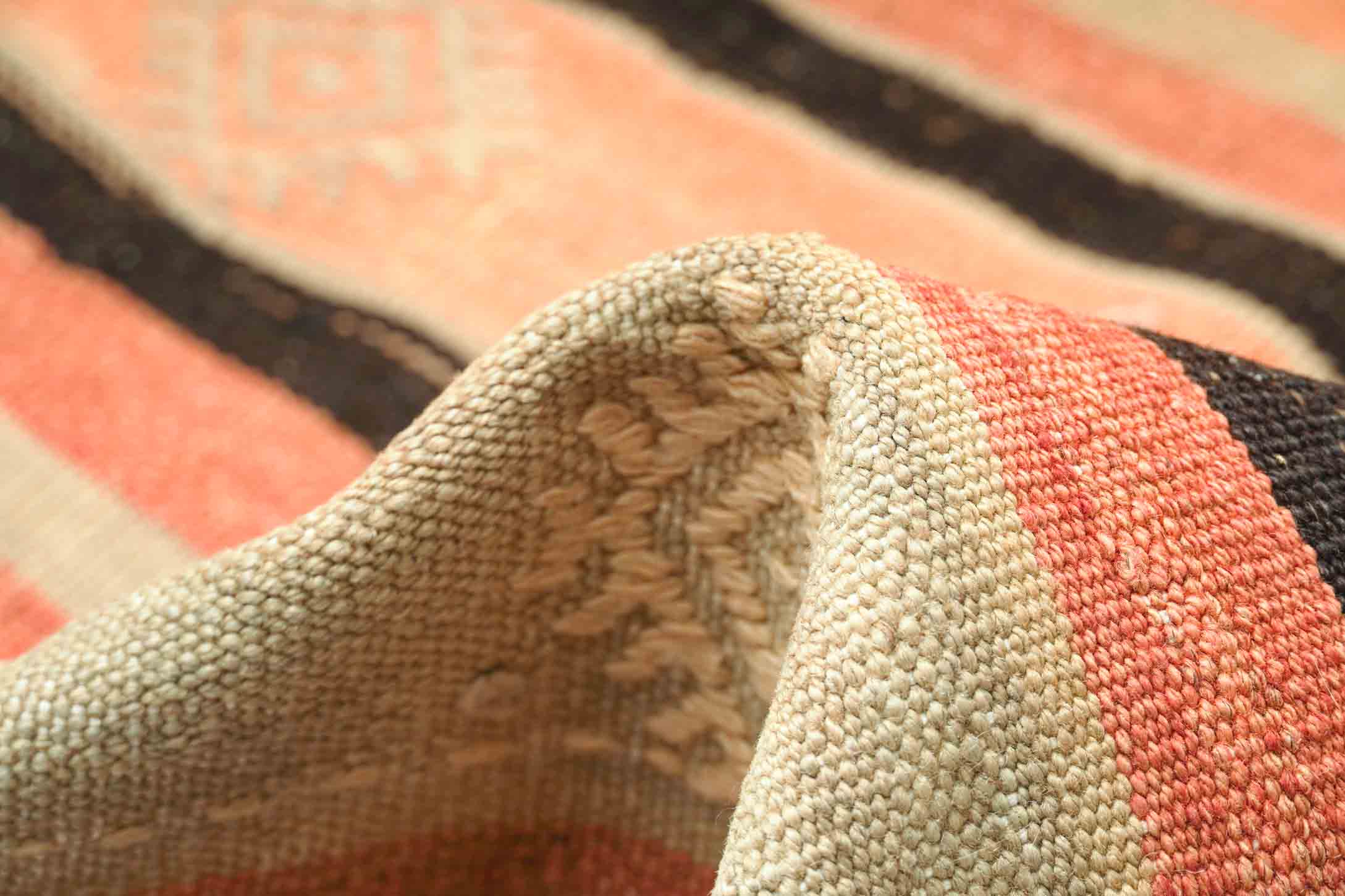 Die Schuss-Fäden dieses Kelim Teppichs bestehen aus handgesponnener, mit Pflanzenfarben gefärbter Schafwolle. Vor dem Weben des Teppichs wurden dafür zunächst Schafe geschoren und die Wolle anschließend gereinigt, gekämmt und schließlich gesponnen. Nach dem Spinnen wird die Wolle der Kelim Teppiche in einem aufwendigen Prozess mit Naturfarben gefärbt. Der Flor der Kelim Teppiche wirkt wegen dieses traditionellen Verfahrens trocken und leicht pelzig. Die Kett-Fäden dieses Kelims bestehen aus Baumwolle.