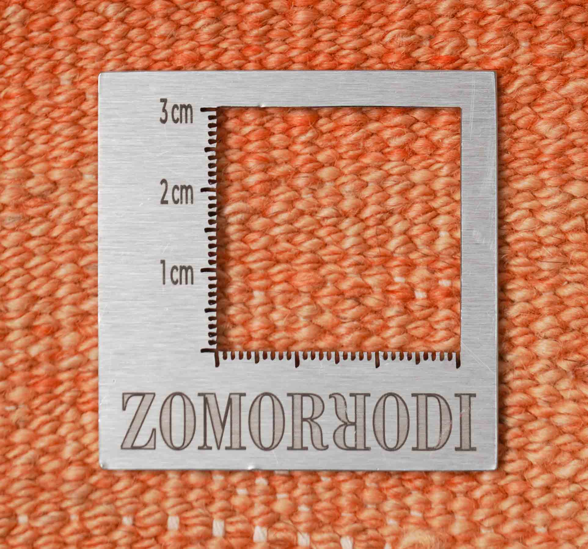 Die Oberfläche dieses Kelims wirkt meliert. Die Farbtonänderungen und Hell-Dunkel-Schattierungen des Florgarns lassen die Farben schimmern und machen den Teppich unempfindlich gegenüber Verschmutzungen. Der Teppich wirkt wegen diesen sogenannten Farbsprünge Abrasch lebendiger. Die Melierung entsteht, weil die Wolle dieses Kelim handgesponnenen wurde. Beim Einfärben werden die natürlichen Farbstoffe unterschiedlich aufgenommen.