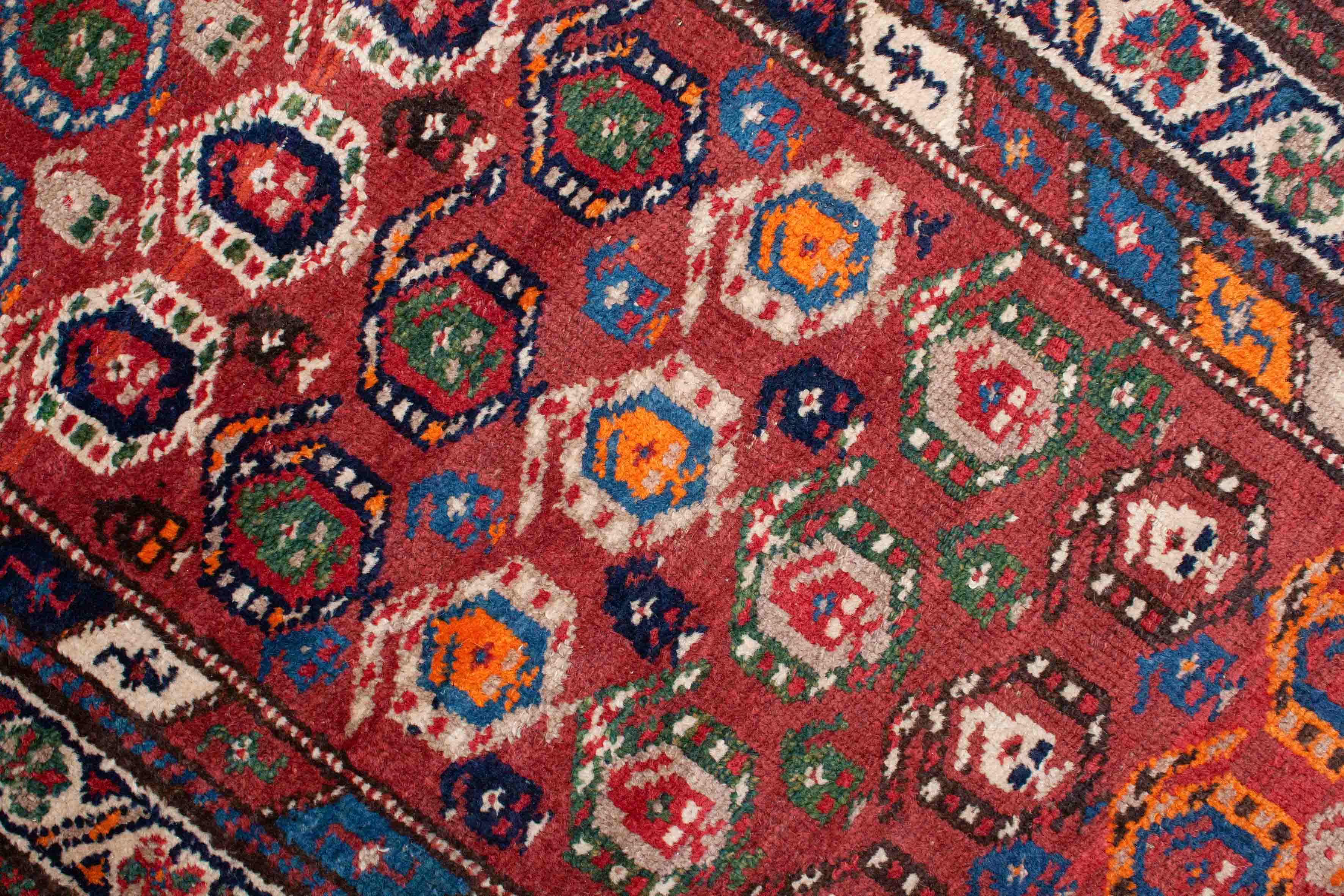 Die wiederholenden Elemente dieses Malayer Tepppichs haben kein spezifisches Zentrum. Das wiederkehrende Rapportmuster wirkt beruhigend aber nicht langweilig. Teppiche mit Rapportmuster werden auch als durchgemustert bezeichnet.