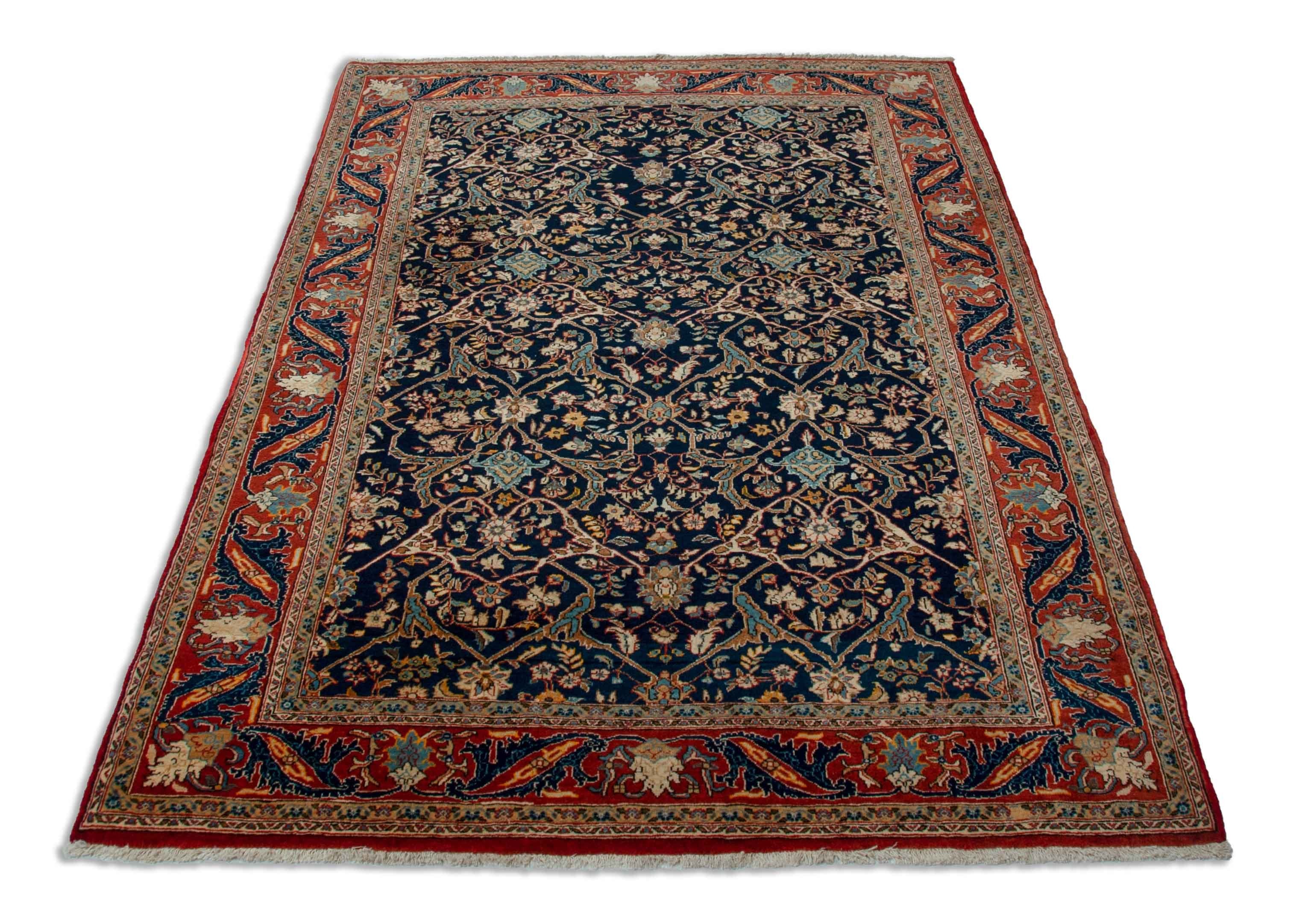 Dieser Teppich stammt aus Sarough (auch Sarouk, Saruk oder Sarogh). Sarough zählt zu den bekanntesten Teppich-Knüpfgebieten des Irans. Gelegen in der westpersischen Provinz Aarak umfasst es die Provinienzen Arak, Djozan, Ghiasabad, Mahal, Malayer, Mohajeran, Sultanabad und Wiss. In Sarough werden Persermuster aller Gattungen, zum Teil auch nach Angaben der Besteller geknüpft. Mit Vorliebe werden auch die benachbarten Farahan sowie die eigenen Sultanabad Designs und das aus Paisley Motiven bestehende, sogenannte Mir-i-Boteh-Muster realisiert. Typisch für diese Teppichgattung ist die sehr gute Wollqualität des Flors; denn die Schurwolle stammt aus dem persischen Hochland. Das Untergewebe – Kette und Schuss – besteht allerdings in der Regel aus Baumwolle. Bei alten und antiken Teppichen findet man häufig einen blauen Schussfaden. Die Knüpfungen sind sehr fein und der Flor relativ hoch. Dieser alte Sarough ist rund 70 Jahre alt und ein echtes Liebhaberstück.