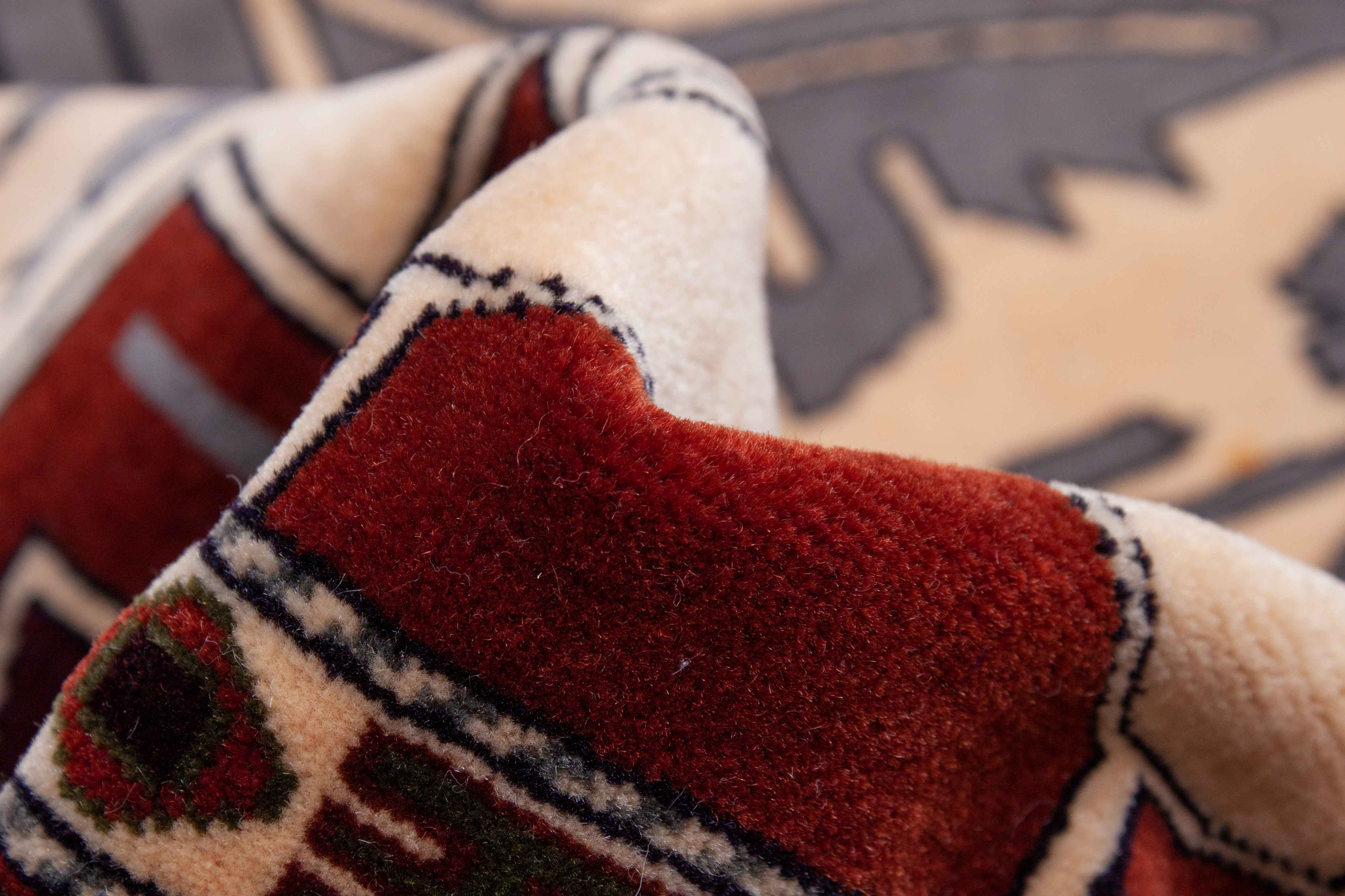 Der Flor dieses Turkmenischer Teppichs wurde aus hochwertiger Schurwolle handgeknüpft. Schurwolle wird durch das schonende Scheren von Schafen gewonnen. Schurwolle ist ein nachwachsender, natürlicher Rohstoff mit einer Reihe beeindruckender Eigenschaften: Durch den natürlichen Fettgehalt der Wolle stößt die Oberfläche Wassertropfen ab und ist so auf natürliche Weise gegen Schmutz imprägniert. Wolle bietet außerdem eine hervorragende Wärmeisolation, wirkt regulierend auf das Wohnklima und dämpft den Schall. Der Untergrund (Schuss- und Kettfäden) dieses Turkmenischer Teppichs besteht aus Schurwolle.