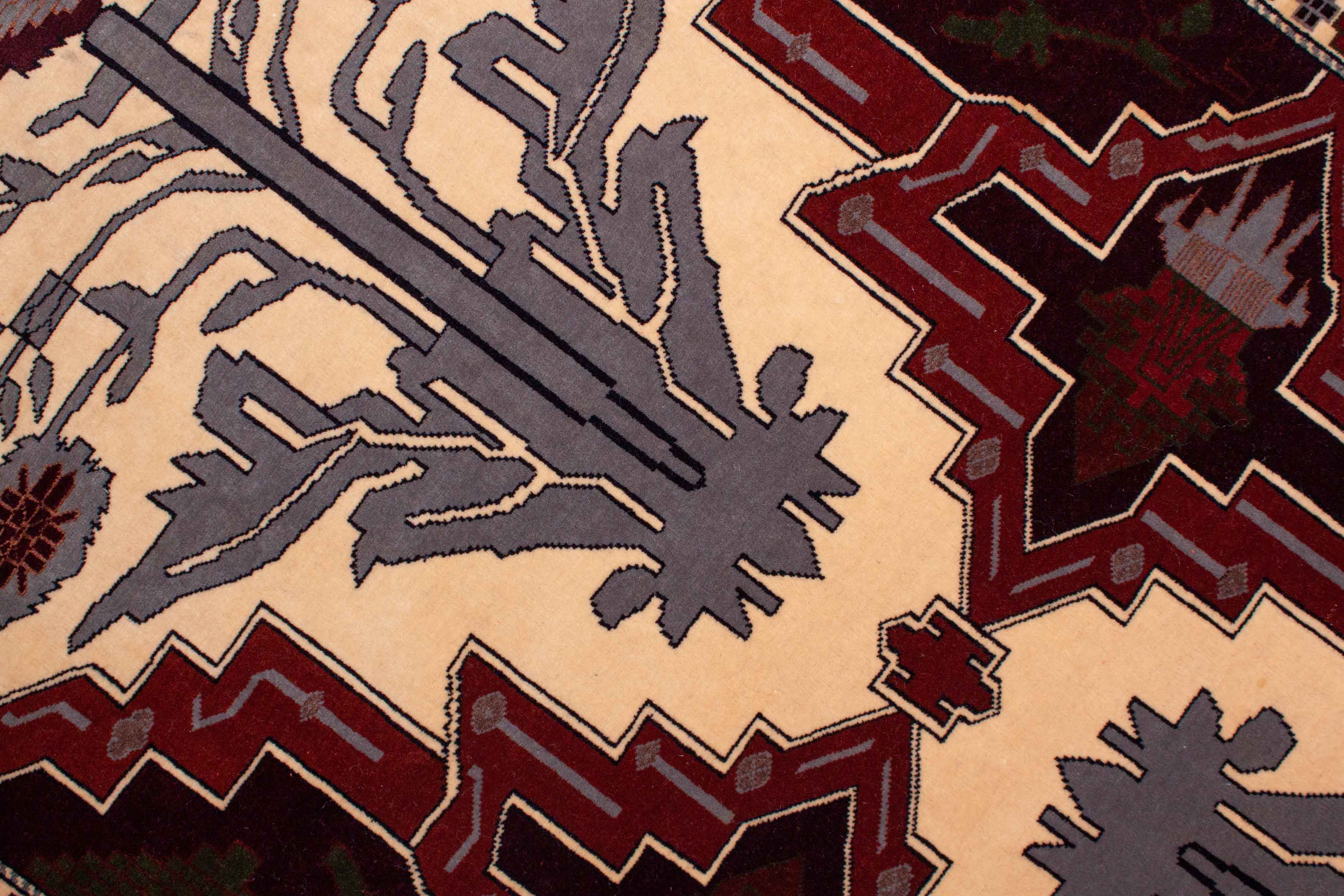 Der Hintergrund dieses Turkmenischer Teppichs ist Beige. Der Rand ist in den Farben Beige, Rostrot und Weinrot gestaltet. In dem beigen Zentrum sind die Farben Rostrot und Schwarz kombiniert.