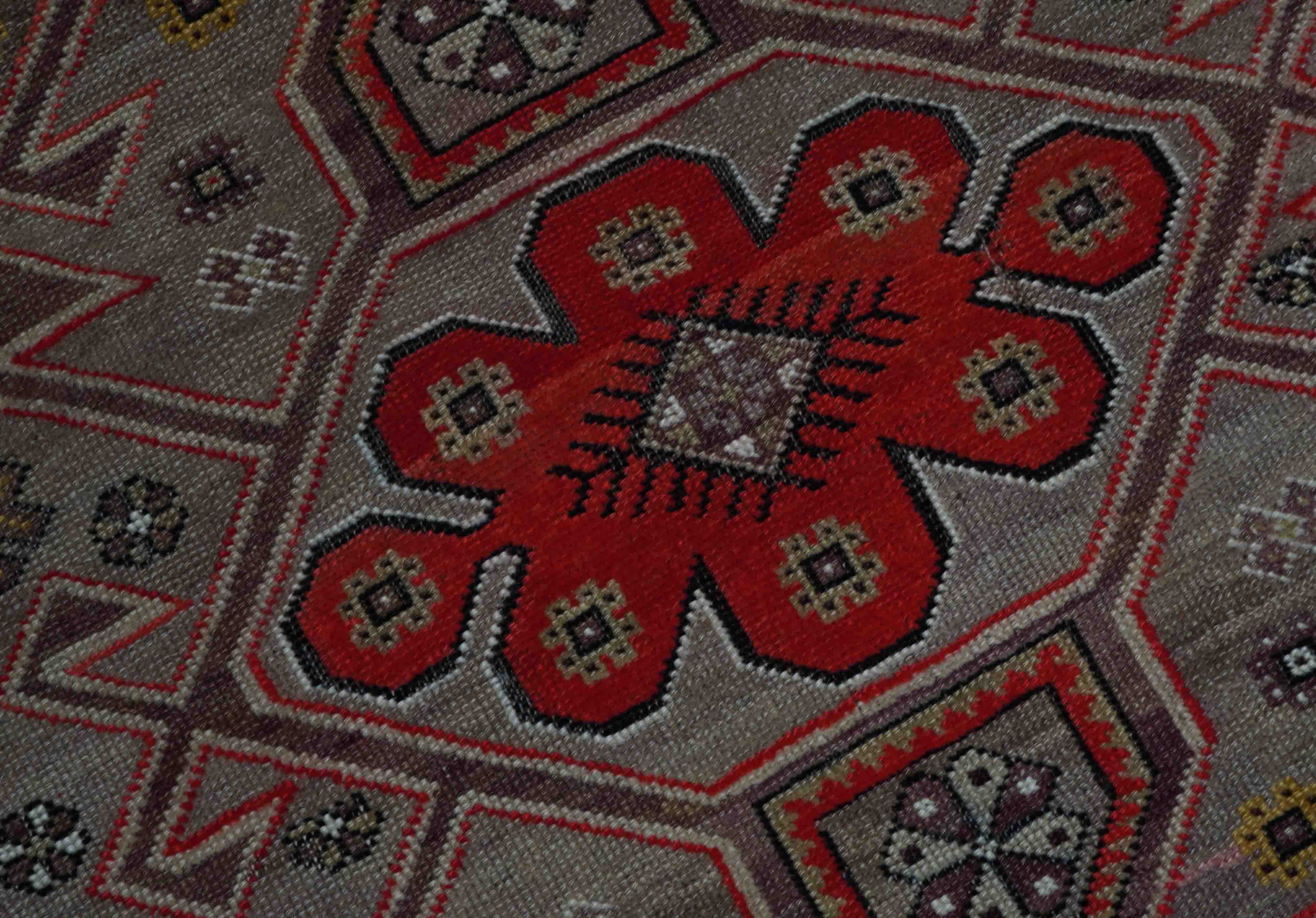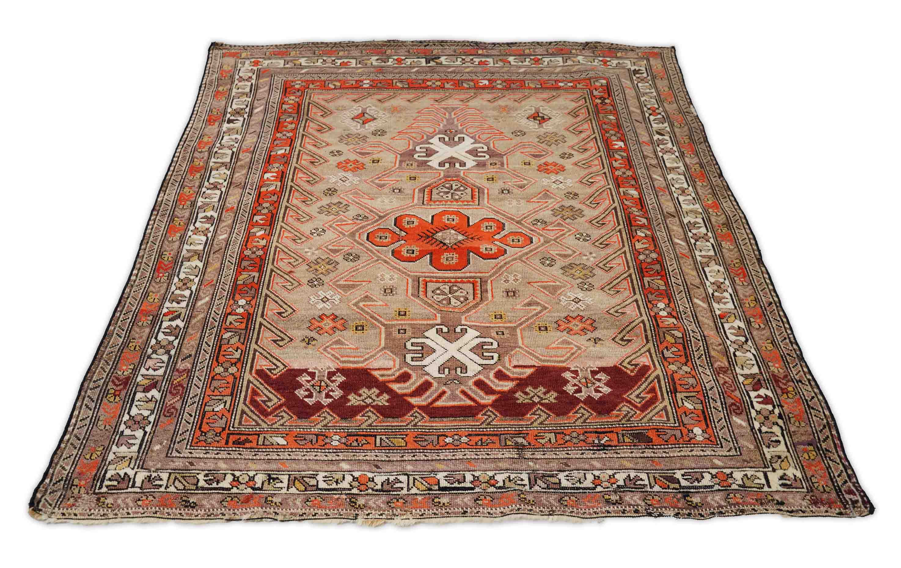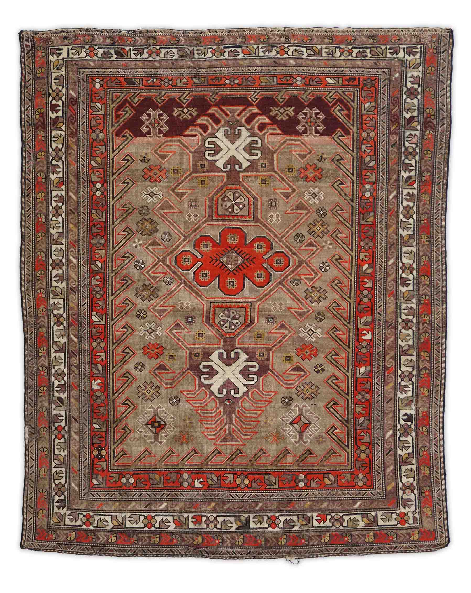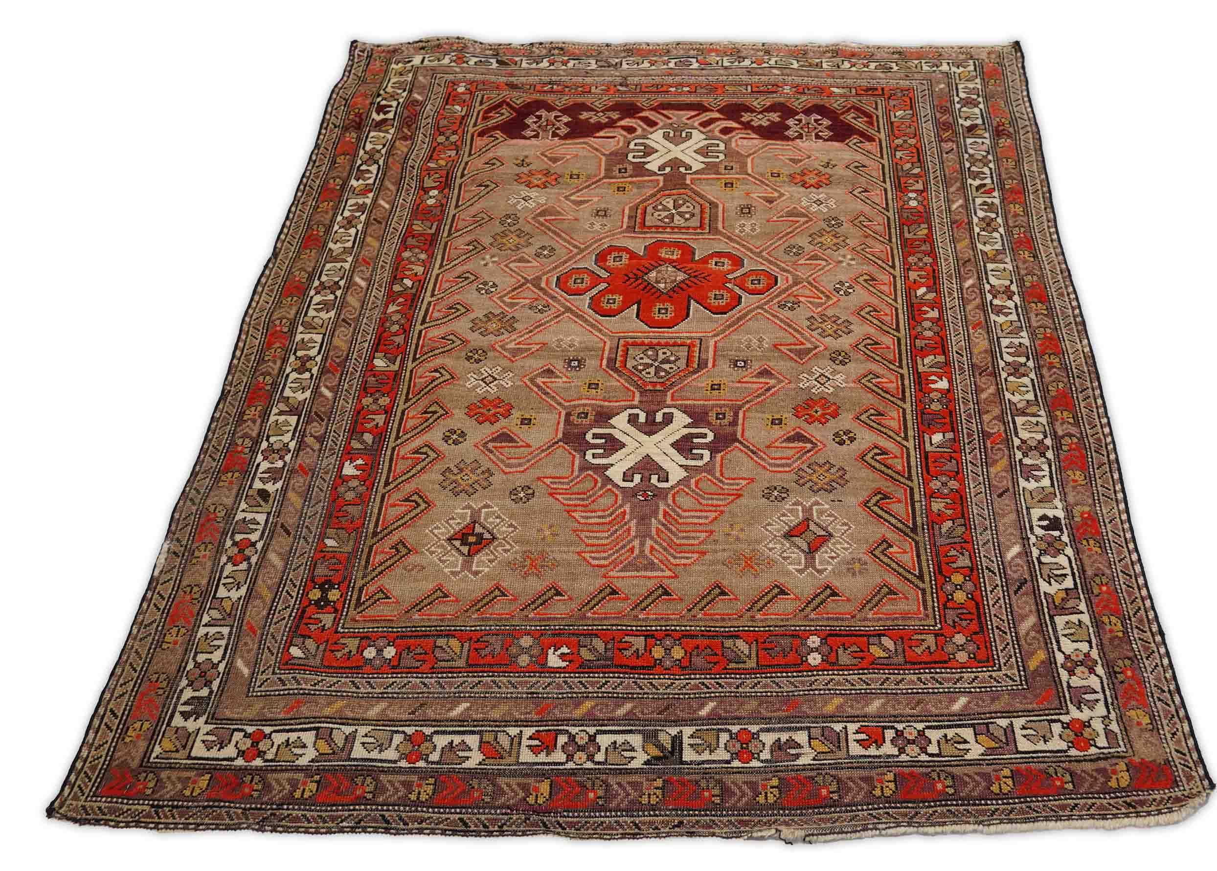 Die Kazak (auch Kasak) Teppiche gehören zur Gruppe der kaukasischen Teppiche. Im Kaukasus werden seit Ende des 18. Jahrhunderts Teppiche hergestellt. Charakteristisch sind die abstrakten geometrischen Stammes-Muster in Primärfarben. Typischerweise werden die geometrischen und seltener auch floralen Motive in kontrastreichen, intensiven Farben dargestellt. Im 19. Jahrhundert wurde ein beträchtlicher Teil der überwiegend in Dörfern produzierten Teppiche unter russischer Kontrolle in den Westen exportiert. Dieser antike Kazak ist ein Sammlerstück. Er ist rund 110 Jahre alt und schon deswegen ein wirklich besonderes Stück. Antike Teppiche, wie dieser Kazak, erfreuen sich nach wie vor großer Beliebtheit und werden zu Höchstpreisen von renommierten Auktionshäusern versteigert.