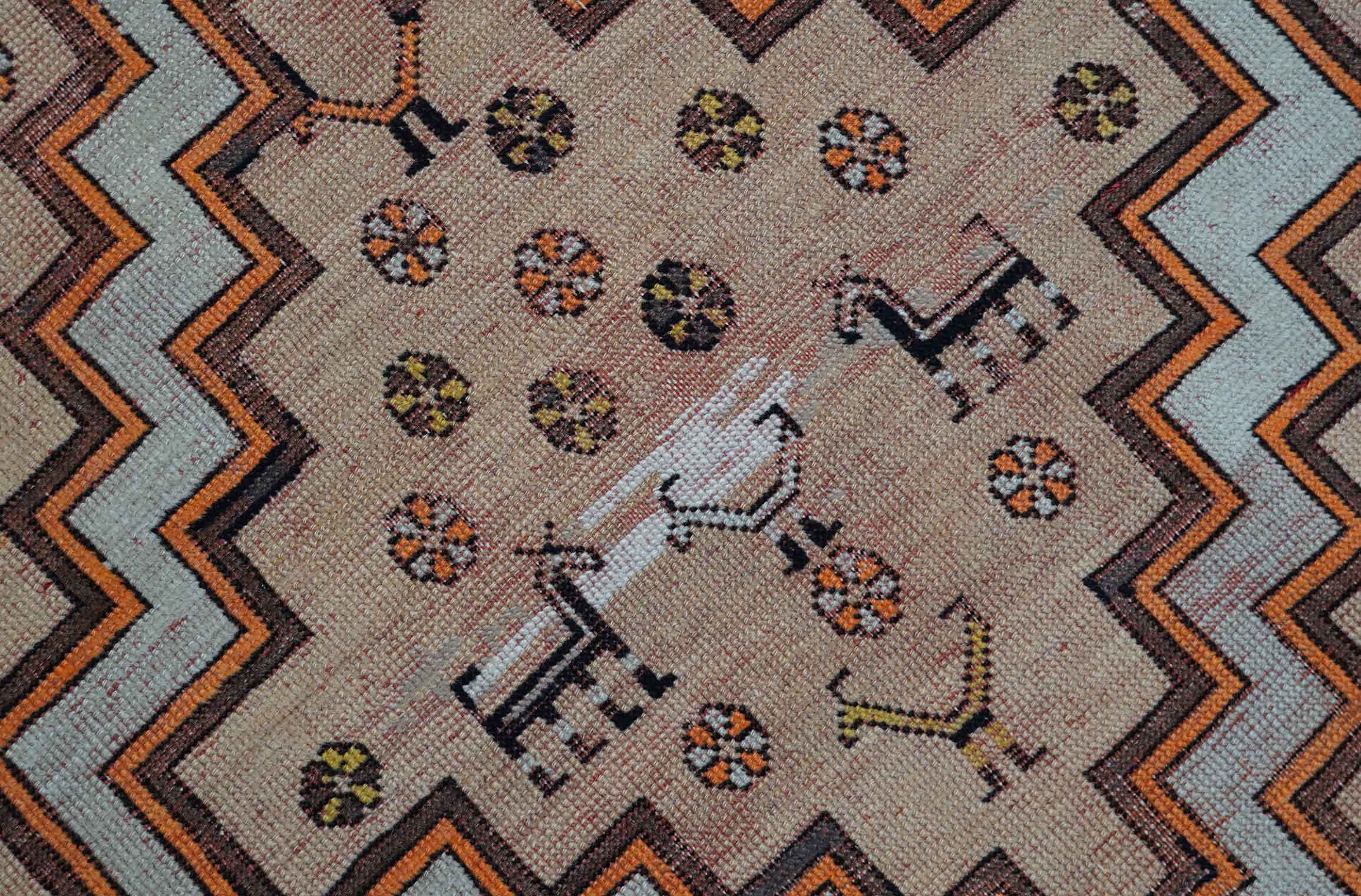 Die Kazak (auch Kasak) Teppiche gehören zur Gruppe der kaukasischen Teppiche. Im Kaukasus werden seit Ende des 18. Jahrhunderts Teppiche hergestellt. Charakteristisch sind die abstrakten geometrischen Stammes-Muster in Primärfarben. Typischerweise werden die geometrischen und seltener auch floralen Motive in kontrastreichen, intensiven Farben dargestellt. Im 19. Jahrhundert wurde ein beträchtlicher Teil der überwiegend in Dörfern produzierten Teppiche unter russischer Kontrolle in den Westen exportiert. Dieser antike Kazak ist ein Sammlerstück. Er ist rund 120 Jahre alt und schon deswegen ein wirklich besonderes Stück. Antike Teppiche, wie dieser Kazak, erfreuen sich nach wie vor großer Beliebtheit und werden zu Höchstpreisen von renommierten Auktionshäusern versteigert.