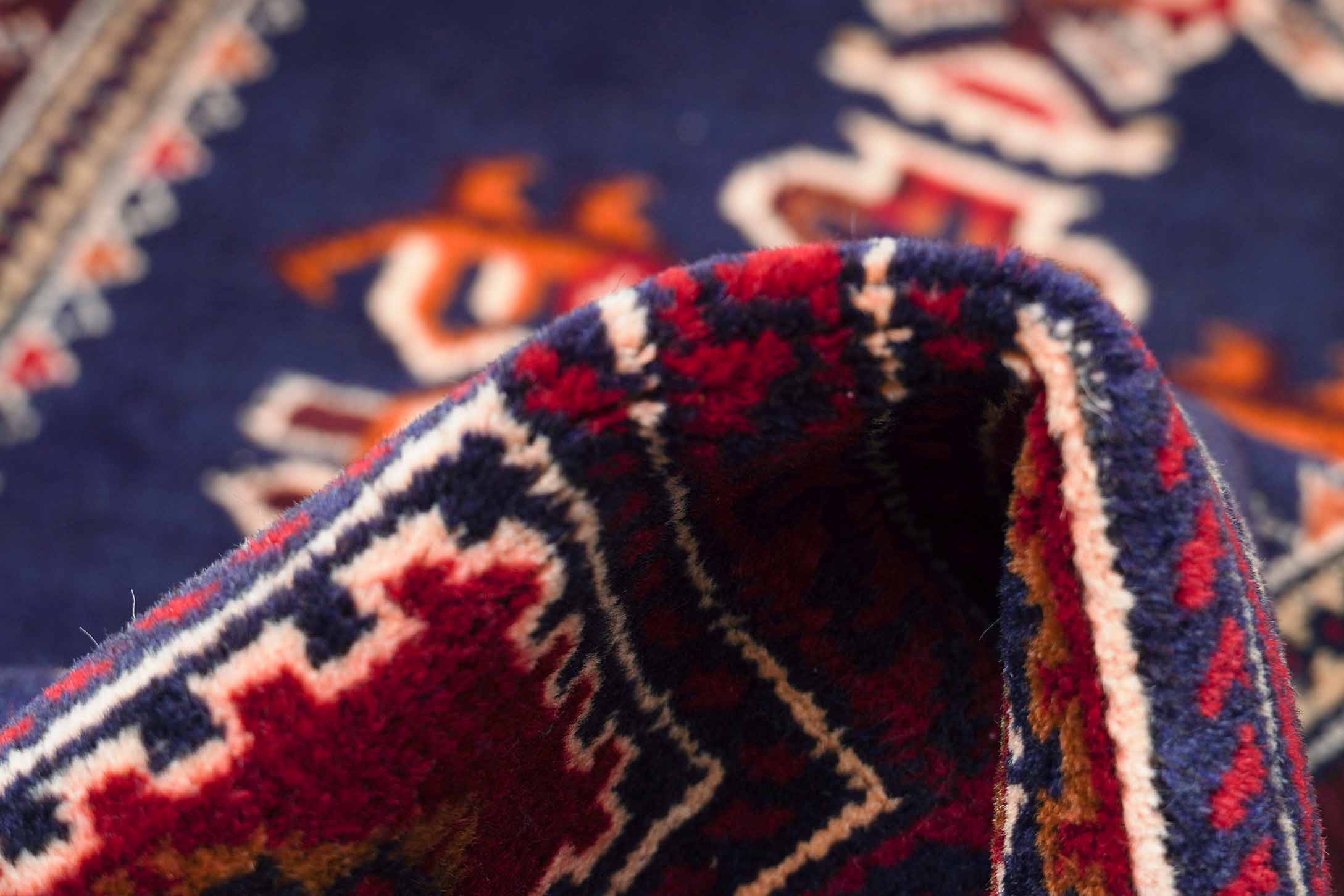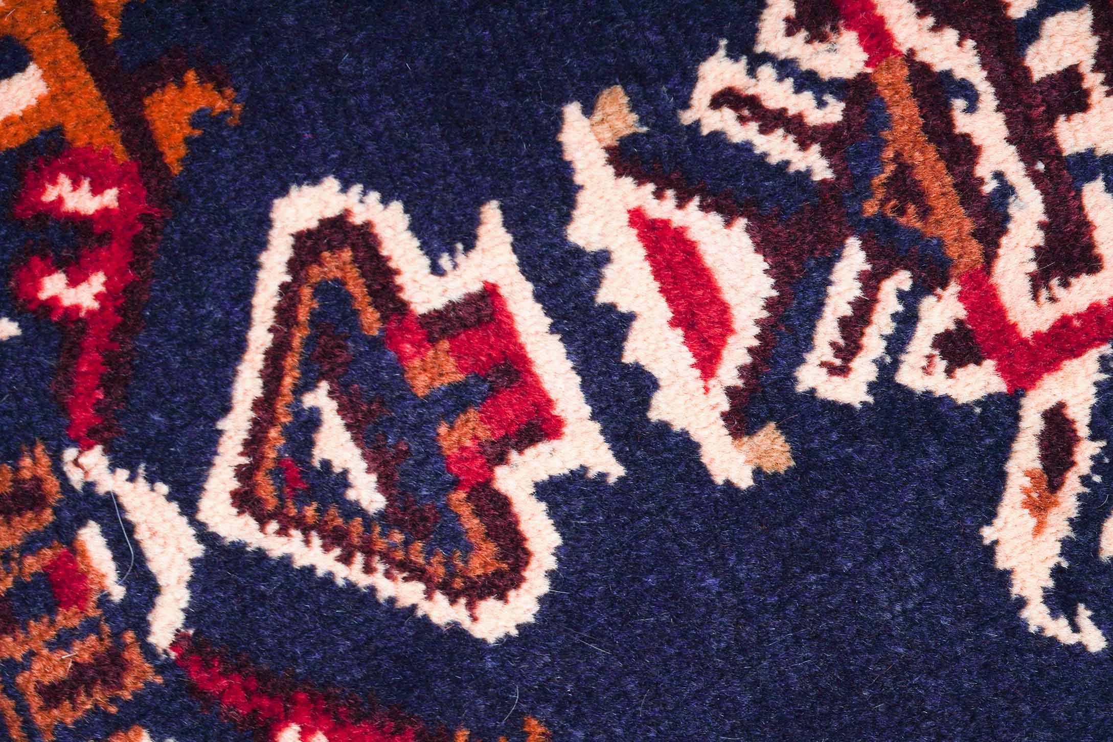Der Hintergrund dieses Belutschs ist Dunkelblau. Der Rand ist in den Farben Dunkelblau und Hellrot gestaltet.