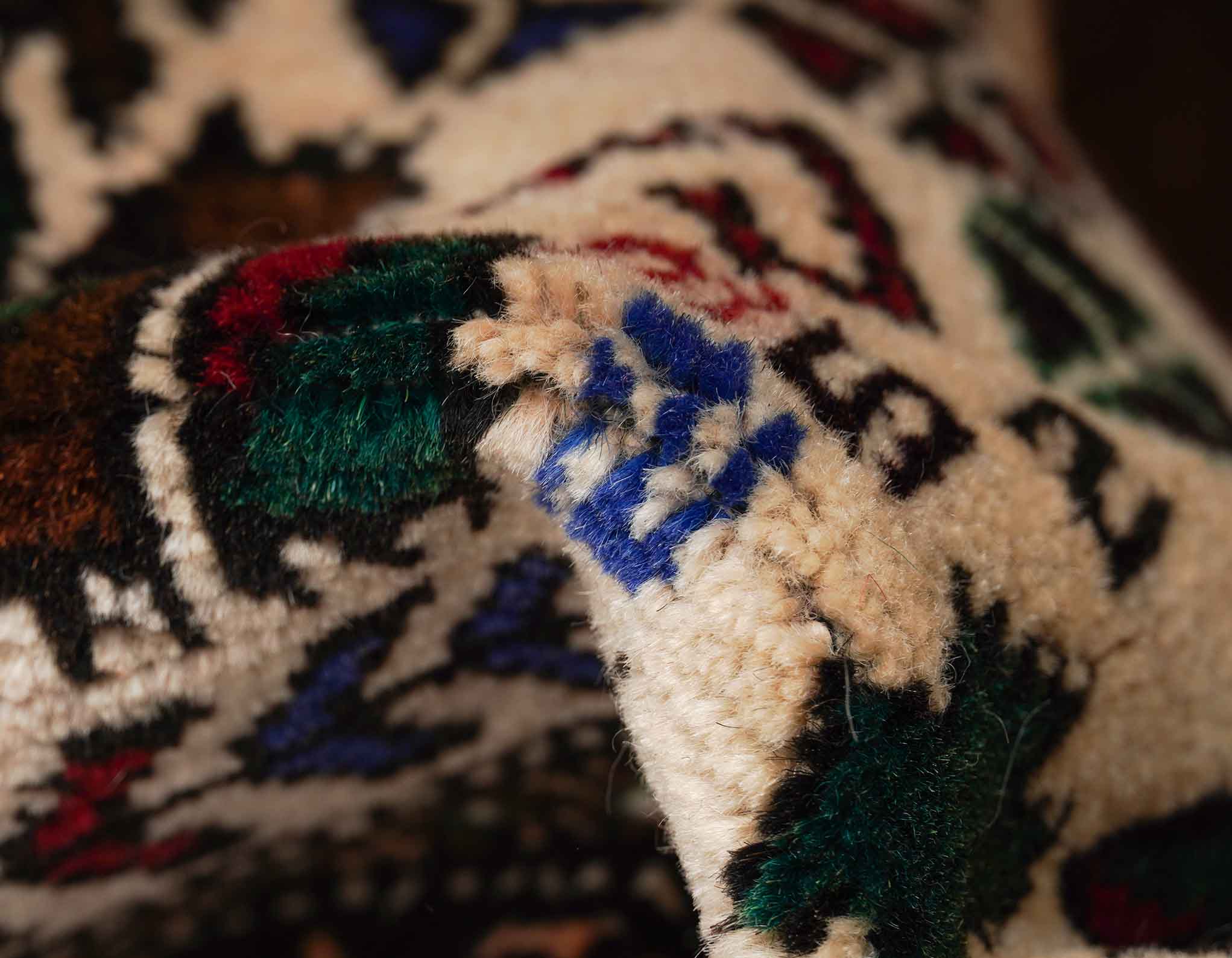 Der Flor dieses Belutschs wurde aus hochwertiger Schurwolle handgeknüpft. Schurwolle wird durch das schonende Scheren von Schafen gewonnen. Schurwolle ist ein nachwachsender, natürlicher Rohstoff mit einer Reihe beeindruckender Eigenschaften: Durch den natürlichen Fettgehalt der Wolle stößt die Oberfläche Wassertropfen ab und ist so auf natürliche Weise gegen Schmutz imprägniert. Wolle bietet außerdem eine hervorragende Wärmeisolation, wirkt regulierend auf das Wohnklima und dämpft den Schall. Der Untergrund (Schuss- und Kettfäden) dieses Belutschs besteht aus Schurwolle.