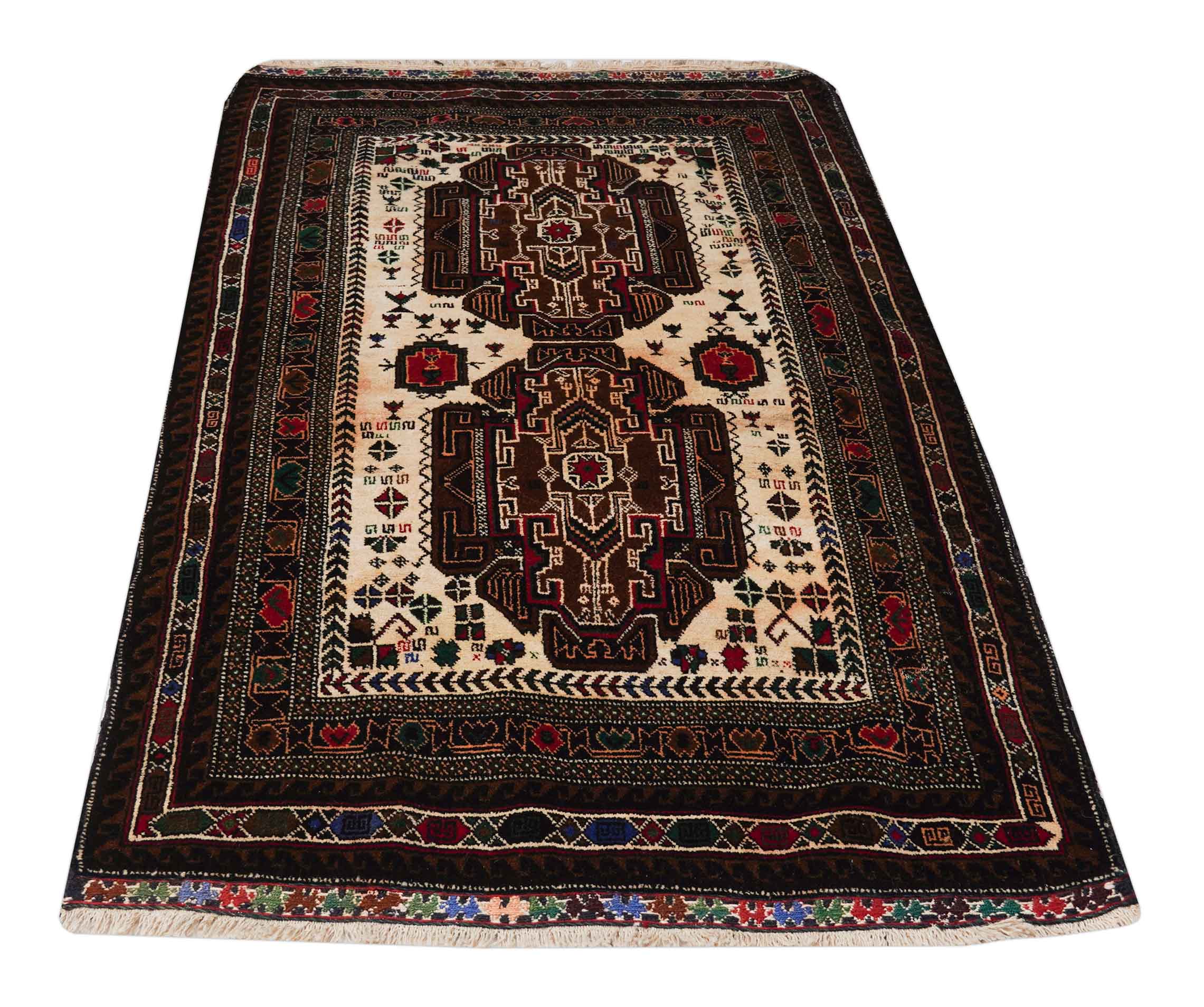 Der Hintergrund dieses Belutschs ist Beige. Im Gesamteindruck dominieren außerdem die Farben Dunkelbraun und Beige. Der Rand ist in den Farben Dunkelbraun und bunten Farben gestaltet.
