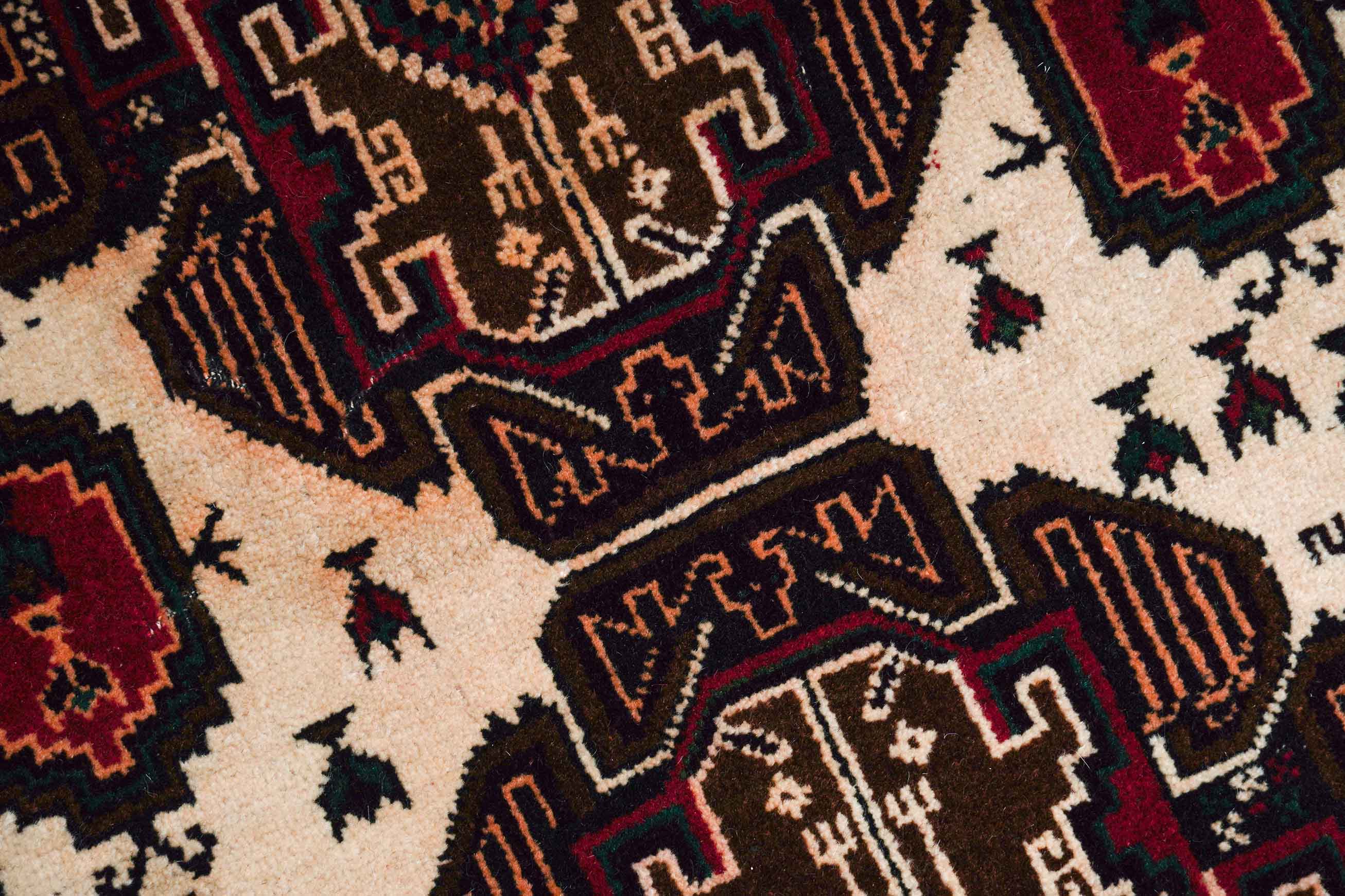 Ihr seid nicht die ersten, die Gefallen an diesem Belutsch finden. Er hatte bereits Besitzer vor Euch, die ihn geschätzt und benutzt haben. Er wurde ca. 1980 handgeknüpft. Er wurde gründlich gereinigt und ist in einem guten aber unrestaurierten Zustand. Der Flor ist stellenweise abgetreten. Die Kanten sind an einigen Stellen stark abgenutzt. Wir haben diesen Belutsch nicht restauriert, weil wir finden, dass er so wie er ist eine besondere Wirkung hat. Wenn ihr das wollt, restaurieren wir den Teppich natürlich gerne für Euch. So oder so wird dieser Belutsch Euch noch für Jahrzehnte Freude bereiten.