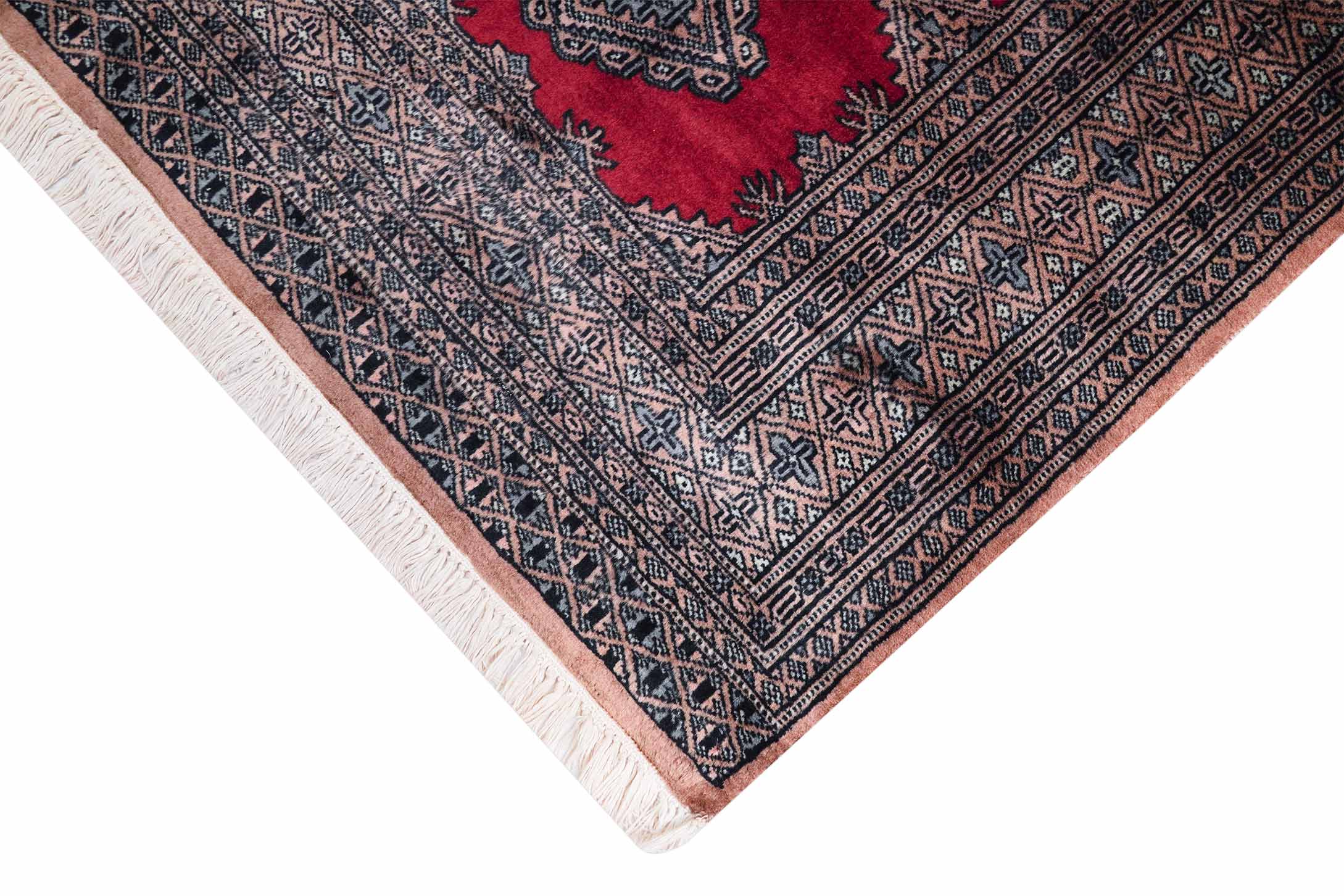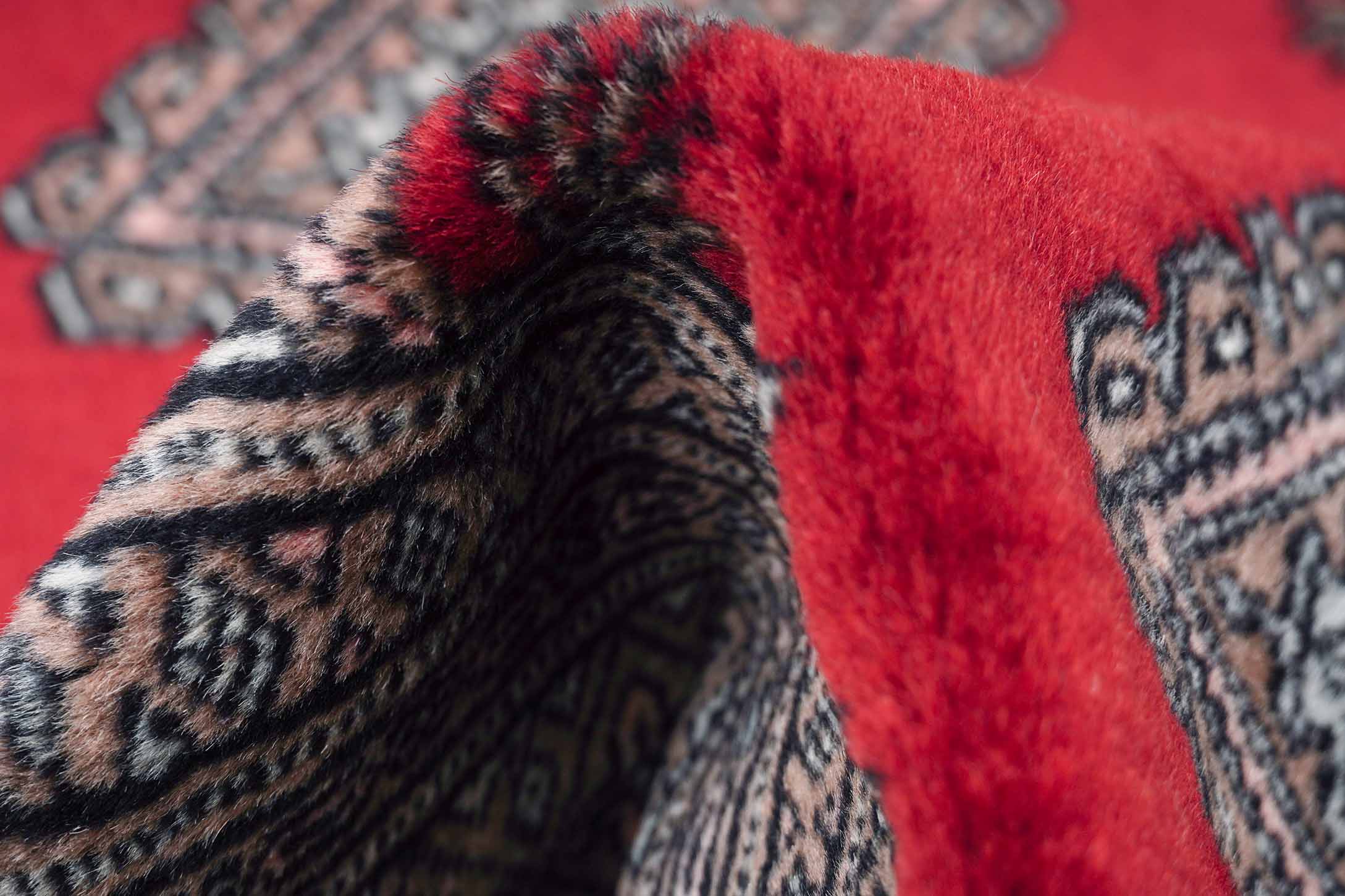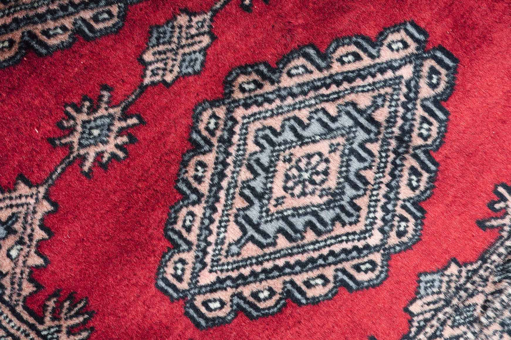 Weil Buchara Teppiche zu den feinsten und beliebtesten zentralasiatischen Teppichen gehören, haben ihre Muster auch die Knüpfer in Pakistan inspiriert. So kommt es, dass dieser Teppich mit dem typischen, usbekischen Buchara Muster in Pakistan geknüpft wurde.