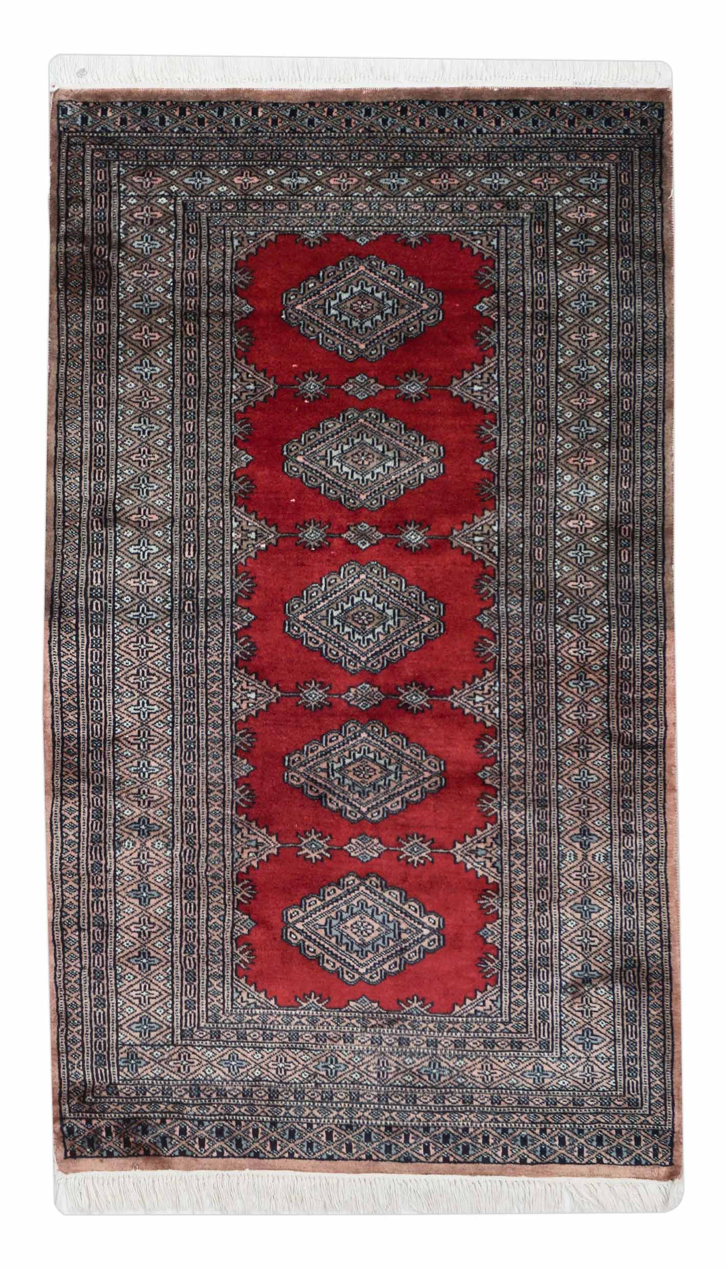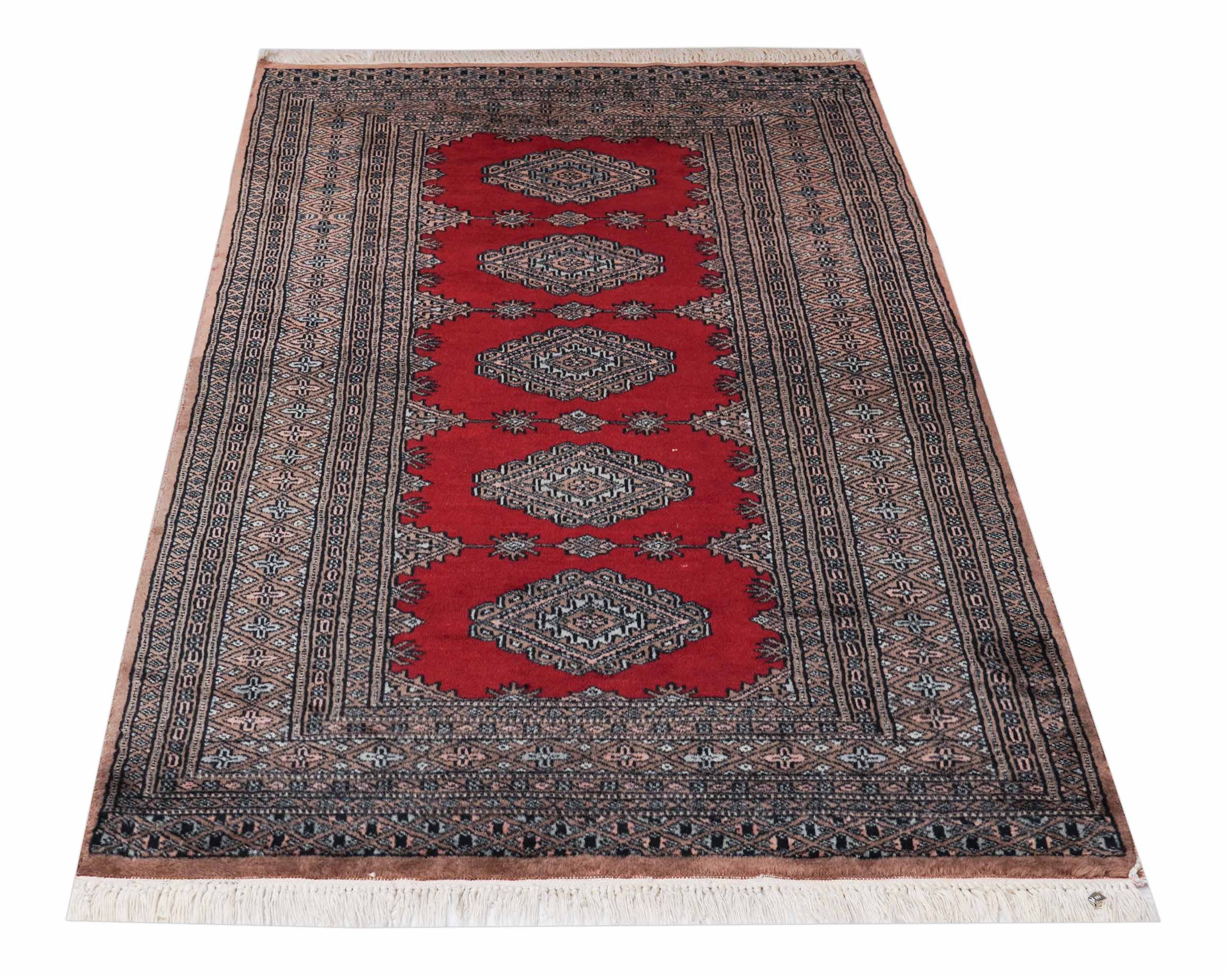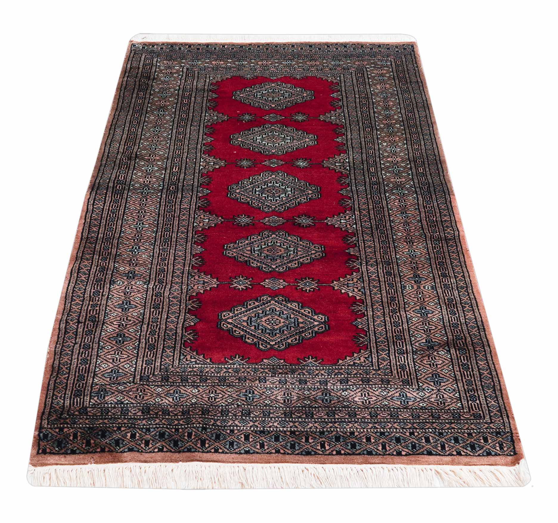 Weil Buchara Teppiche zu den feinsten und beliebtesten zentralasiatischen Teppichen gehören, haben ihre Muster auch die Knüpfer in Pakistan inspiriert. So kommt es, dass dieser Teppich mit dem typischen, usbekischen Buchara Muster in Pakistan geknüpft wurde.